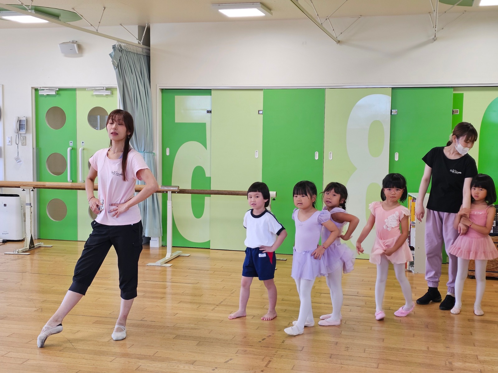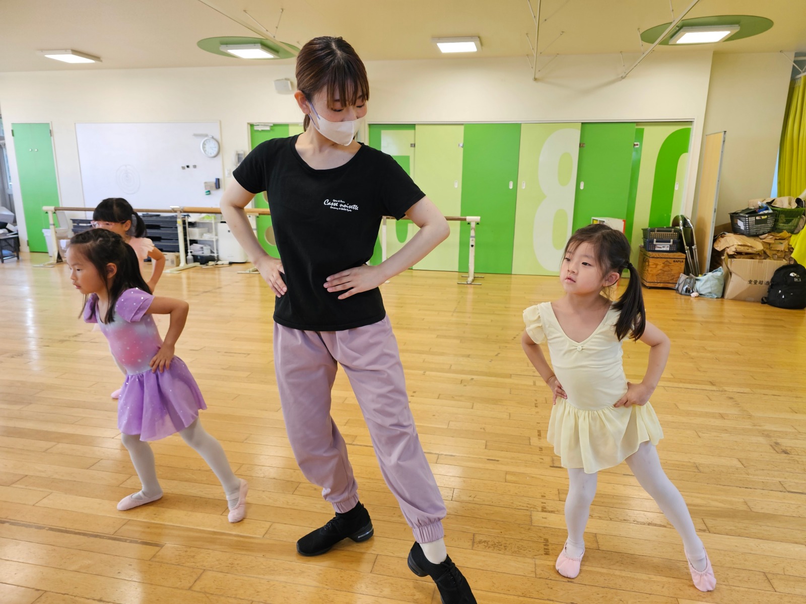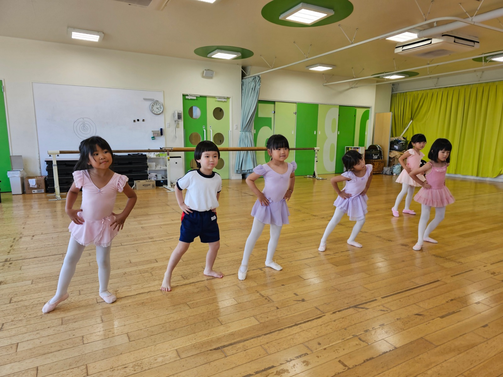 バーを持っての基礎練習だけでなく、移動したり、ジャンプをしたりする練習もしています。パ・ドゥ・シャ、シャンジュマンなどバレエの動きを先生から教わり、 練習に励む子どもたち。初めての動きも、先生のお手本を見ながら積極的に練習し、どんどん出来るようになってきました。 キレイな姿勢で、正しい動きが出来るよう日々練習していきたいと思います。