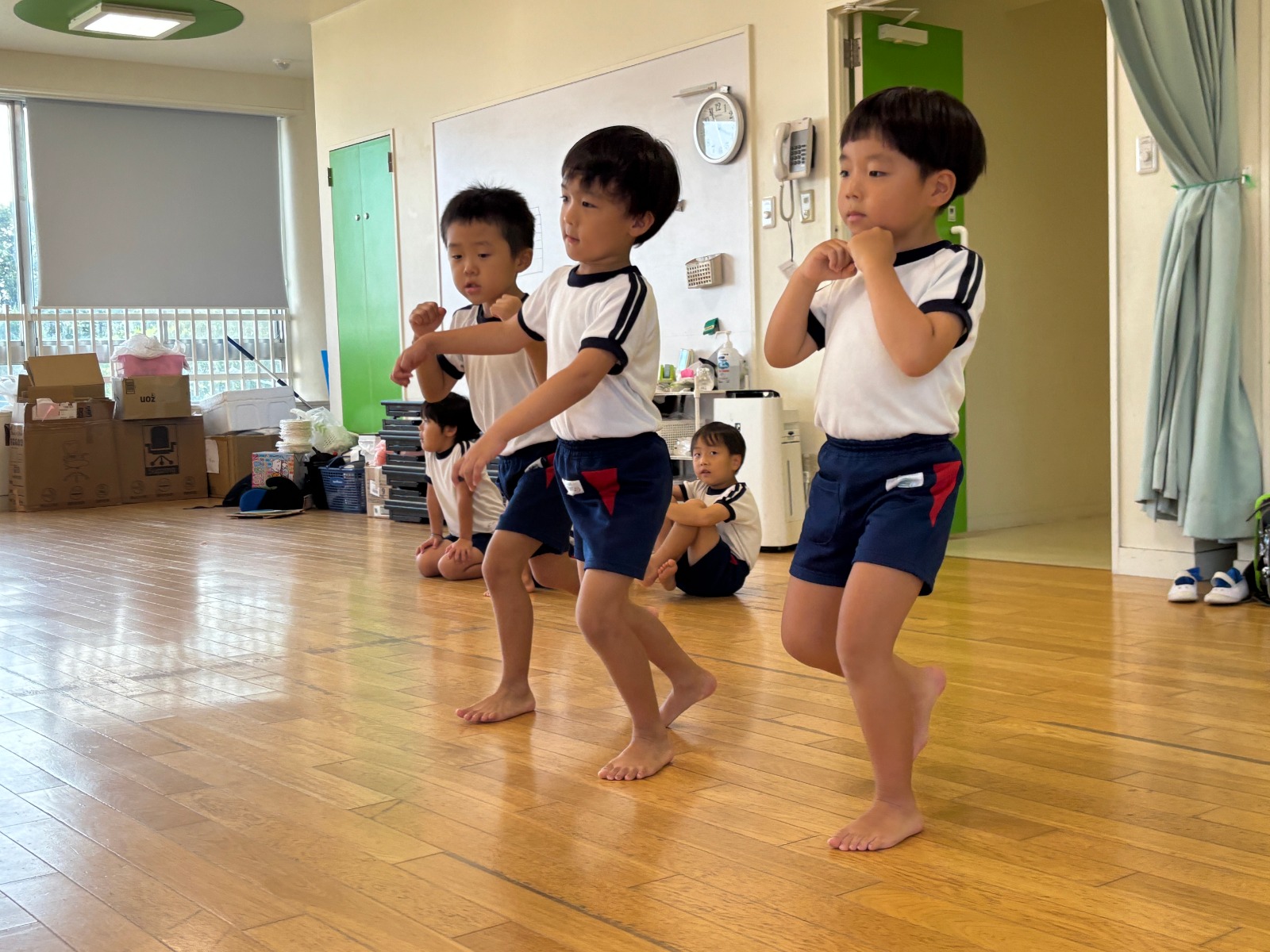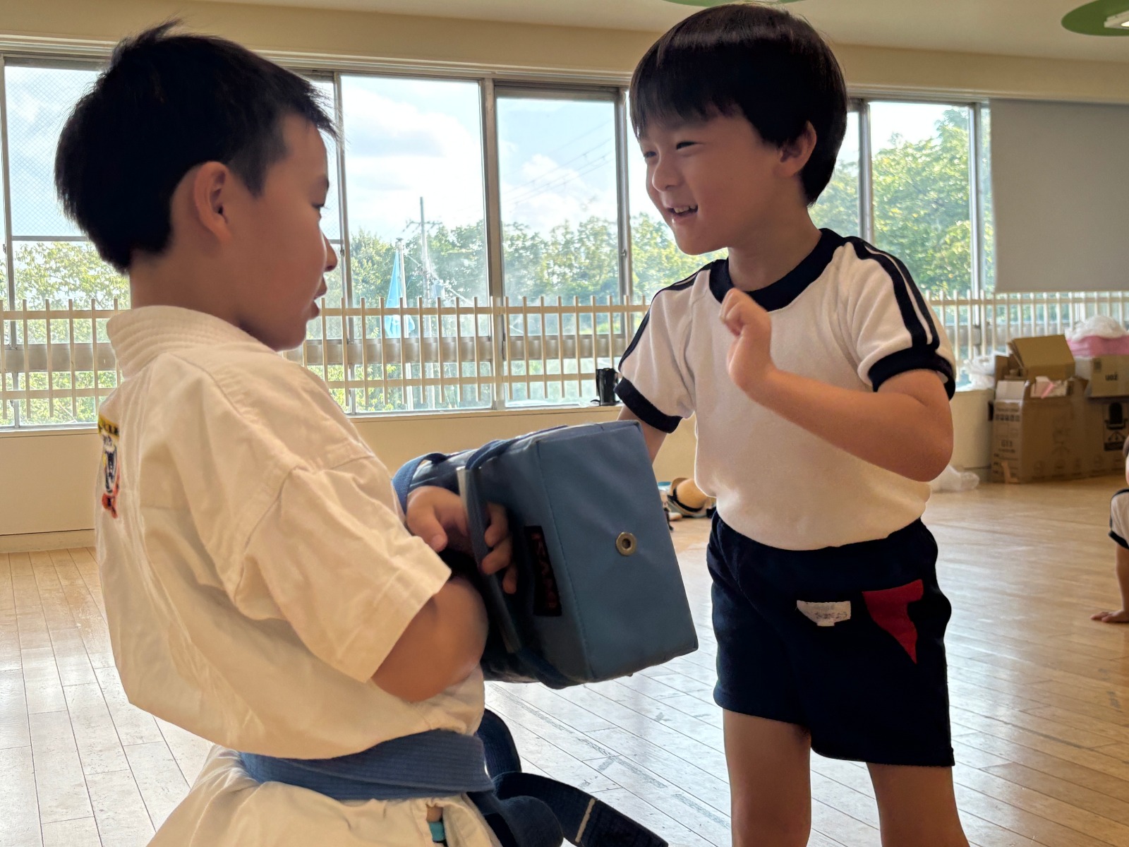 移動稽古が始まりました。 ゆっくりではありますが、移動しながらのキックやパンチをしていきます。 なかなか思うように進めないこともありましたが、一歩ずつ講師と確認をし、あきらめず一生懸命に頑張る姿はとてもかっこよかったです。 難しい練習でしたが、「もっとしたい!」「次はできるようになりたい」ととても気合が入っていました。 また、体力づくりのトレーニングでは鬼ごっこをすることに。 小学生クラスのお兄さんも参加してくれ、鬼ごっこがとても楽しい活動になりました。