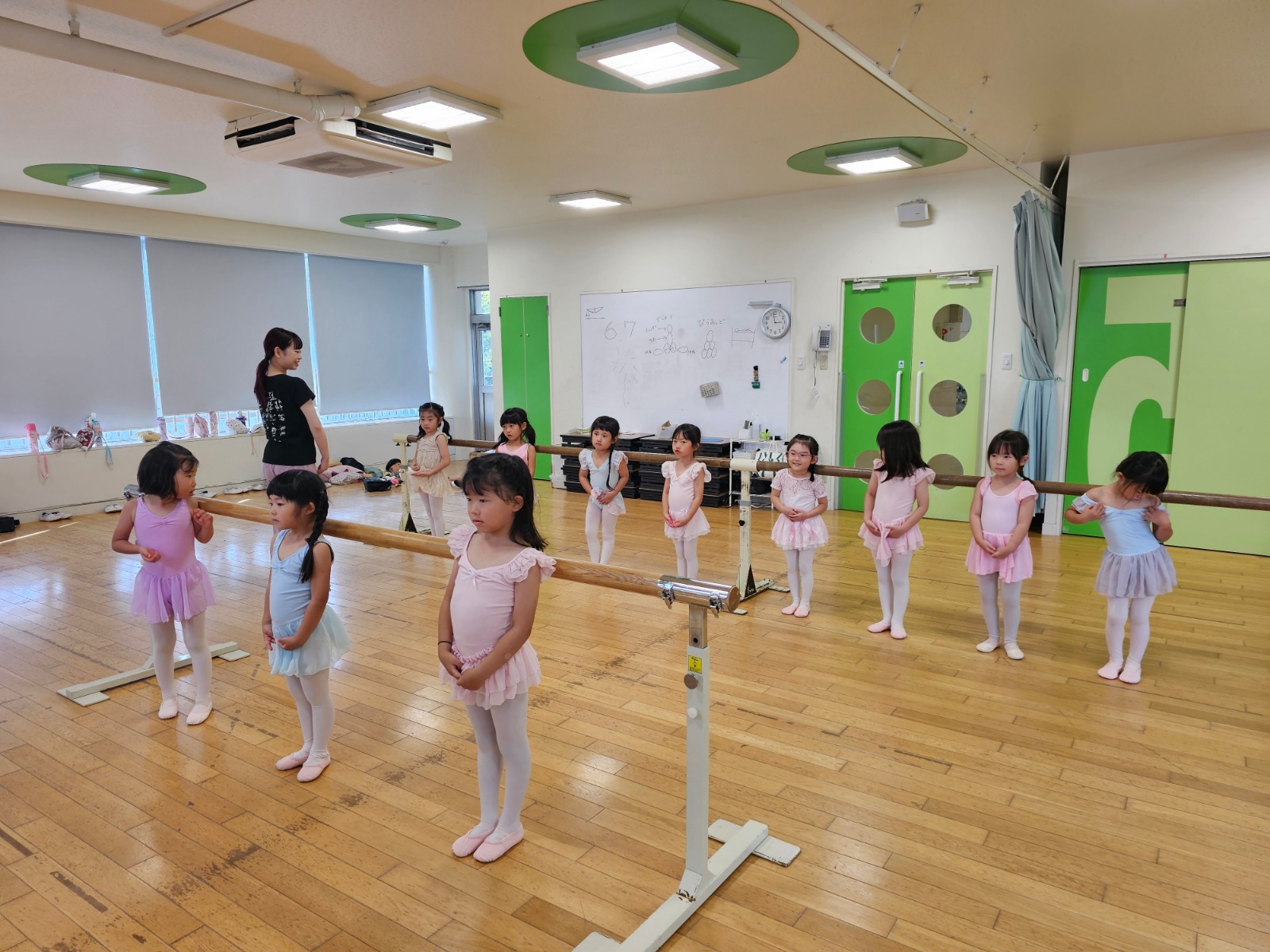 また、バーから離れ、部屋の端から端までつま先立ちでちょこちょこ移動する動きでは、「アリさんのように少しずつ移動するんだよ」という先生の指導を受けて、ゆっくり、細かく、そしてお友だちの動きと合わせながら移動をする子どもたち。「お友だちと合わせる」ということも意識して練習できるようになってきました。