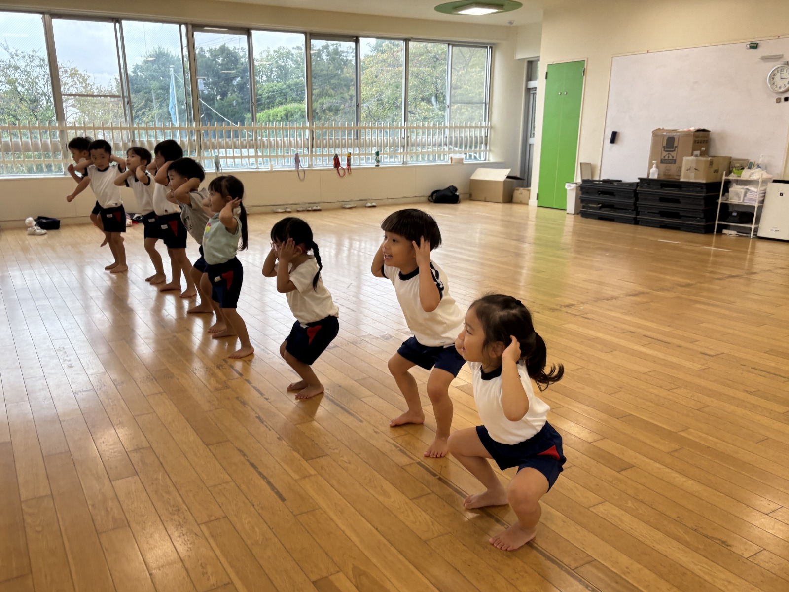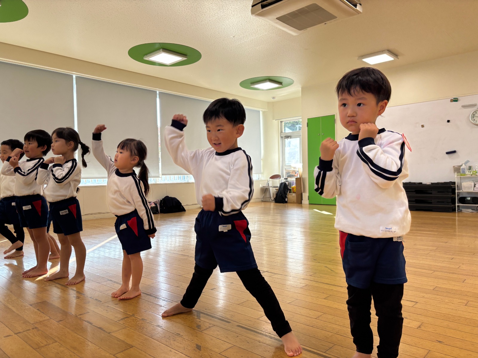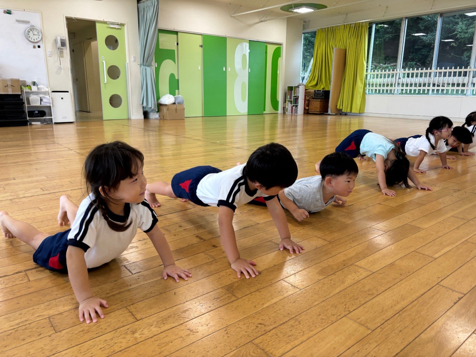 体力づくりのトレーニングでは、腕立て・腹筋・スクワットを行い、最後にはバーピージャンプにも挑戦!リズムよく行うことが出来ており、みんなとても楽しそうでした。。