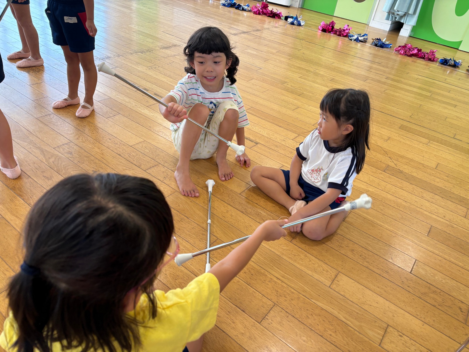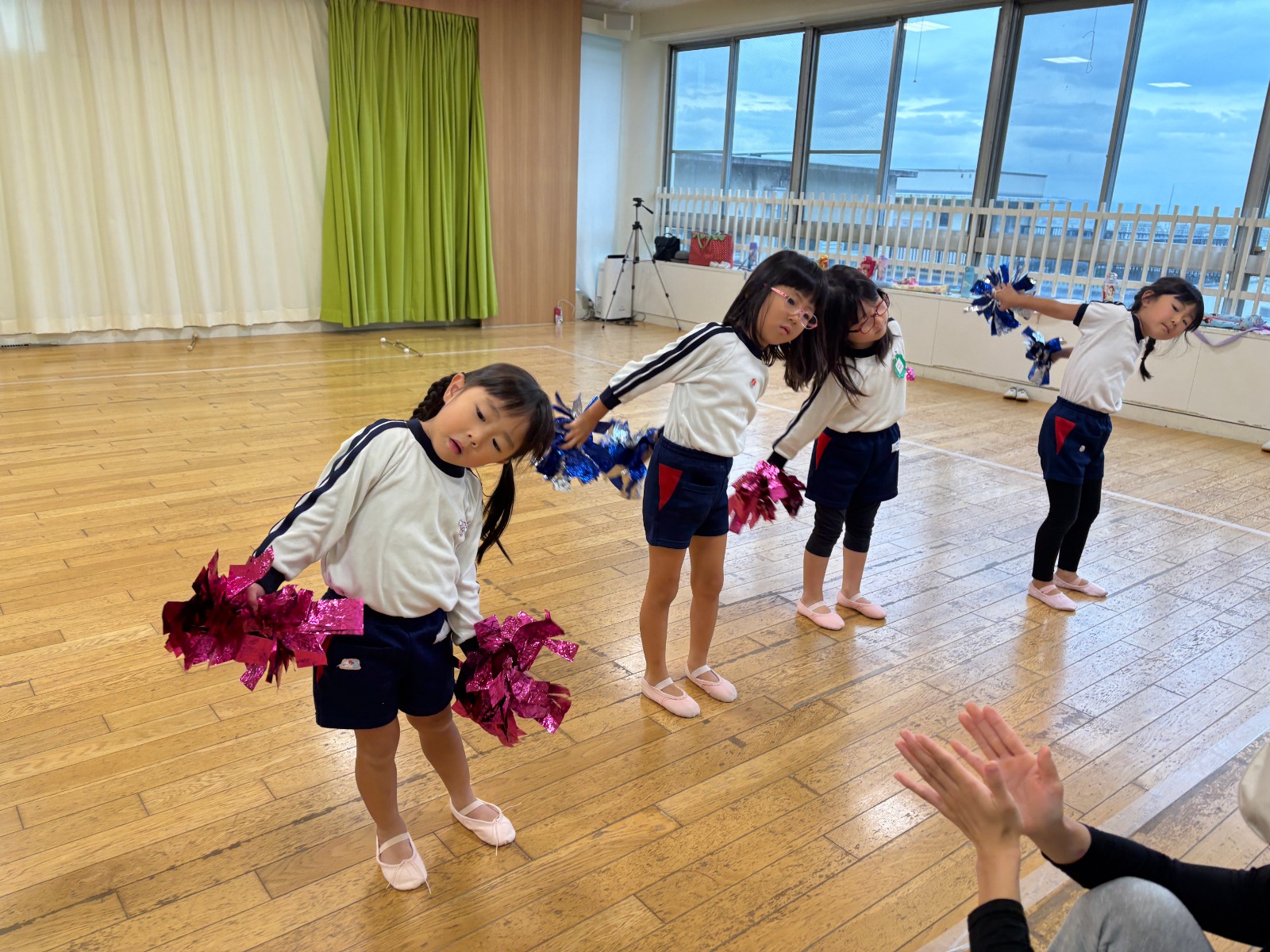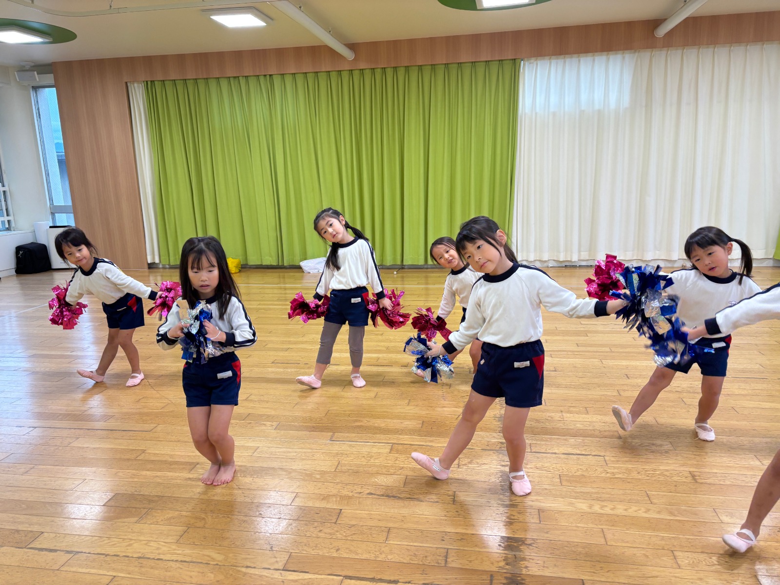 ポンポンとバトンを使ってかわいく踊る練習をしています。 4月では出来ていなかったバトンを回すことも練習を重ねてだんだん上手に回すことが出来てきています!大きな動きが出来るように繰り返し練習もしています。 1つ1つの動きを確認をしてそろえることも意識して頑張っています。 にこにこ笑顔で一生懸命かわいく踊る子どもたちです。