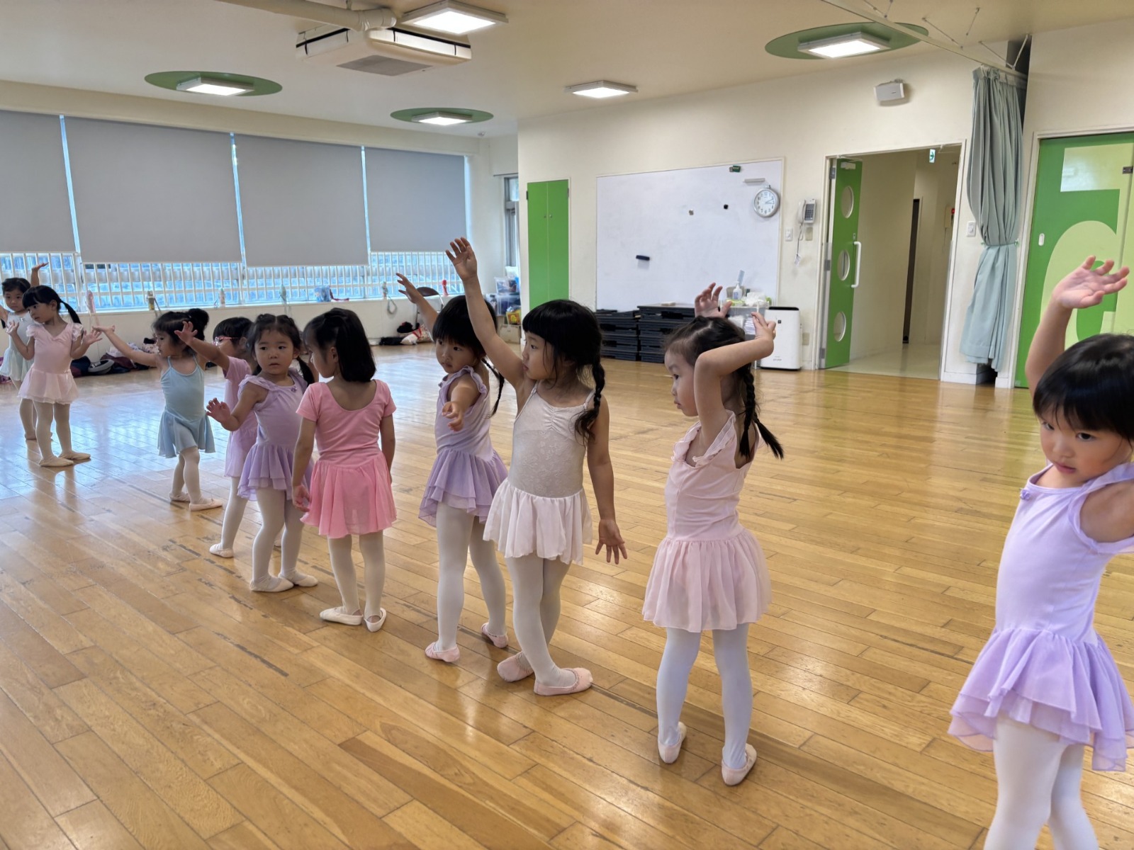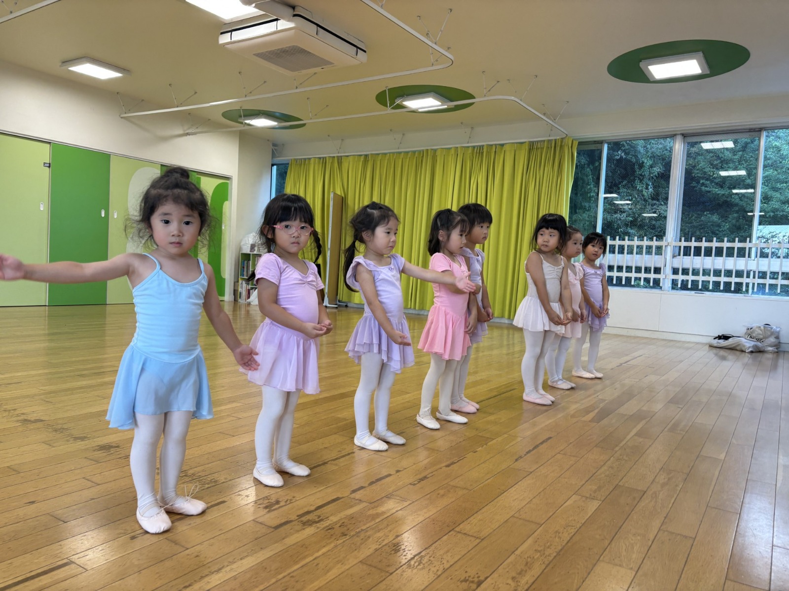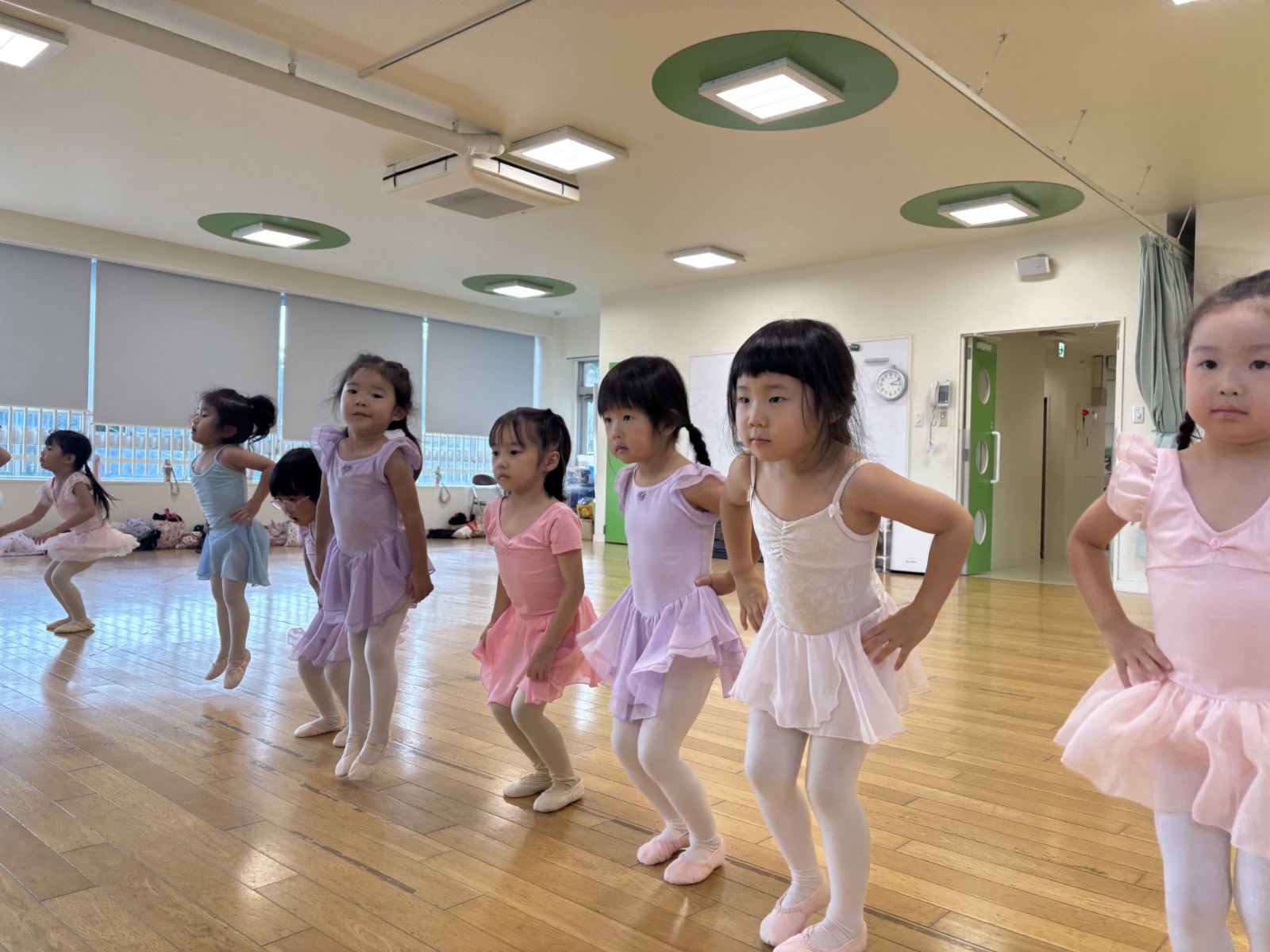 まだまだ難しくバランスを崩してしまうこともありますが、鏡で自分の姿を見ながらちょこちょこと移動することが上手に出来るようになってきました。さらに、スカートをもってシュッシュと移動もきれいになってきました。 ビーンズ祭に向けても練習を始めており、それぞれ振り付けも覚えてきて自信を持って大きな動きでかわいく笑顔で出来ています。