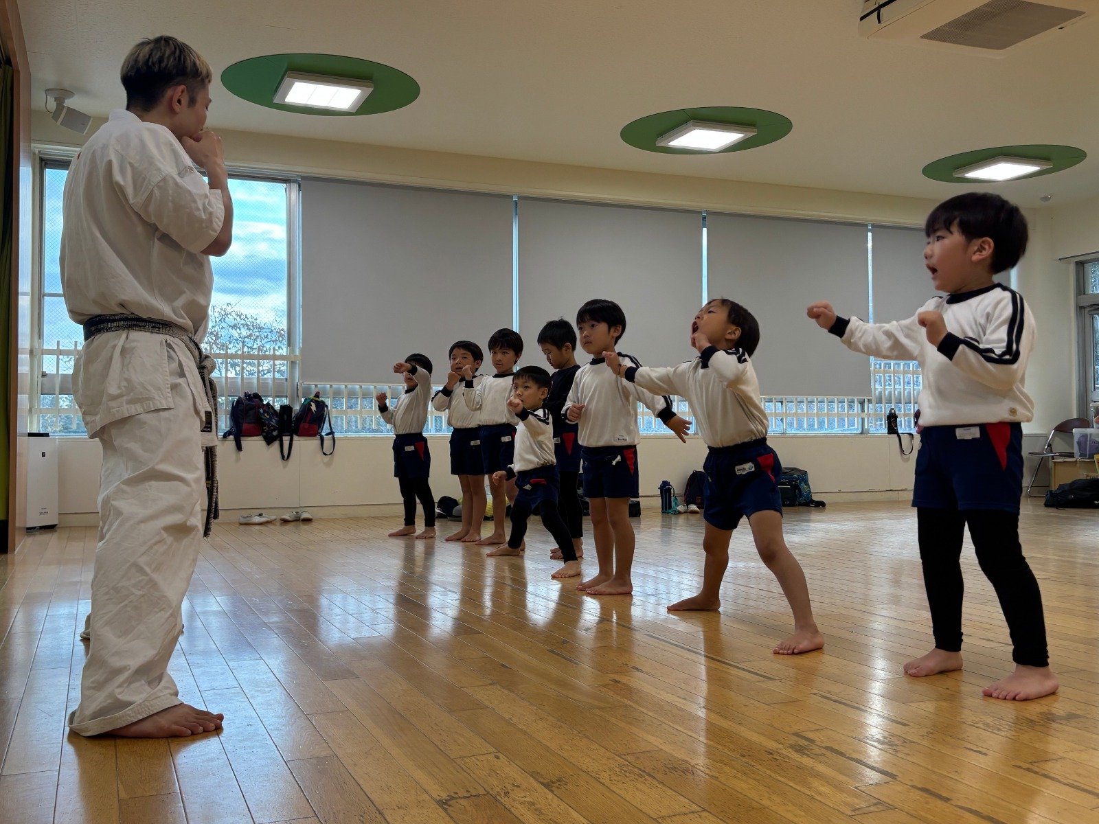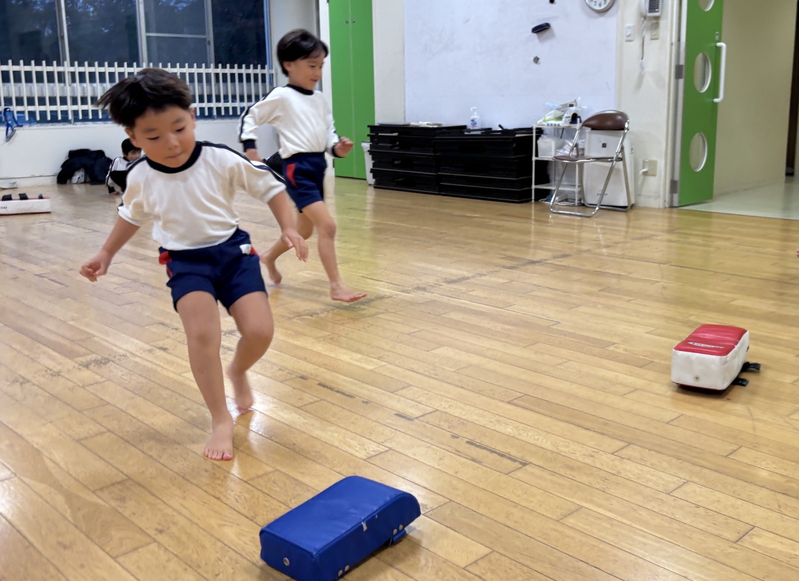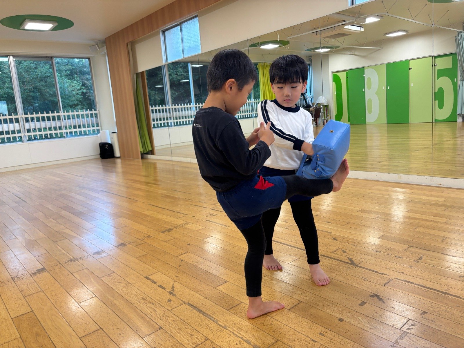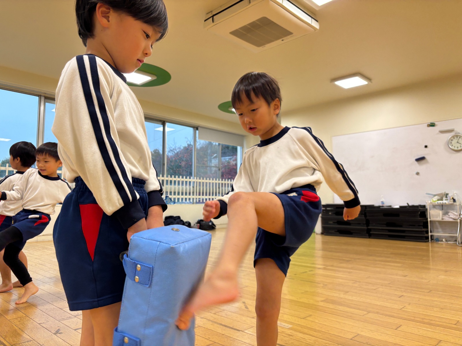 年長クラスでは、先月に引き続きペアになってミット練習。 毎週ペアを変えて練習しております。 相手のキックやパンチの高さを考え、練習することが出来ました。 年長さんにもなると利き足のキックや利き手のパンチの威力もとても強くなります。 ミットを抑える側は、負けないように踏ん張っている姿はとてもかっこよかったです。 また、反復横跳び競争も行いました。 初めての取り組みでしたが、楽しく体力トレーニングをすることが出来ました。