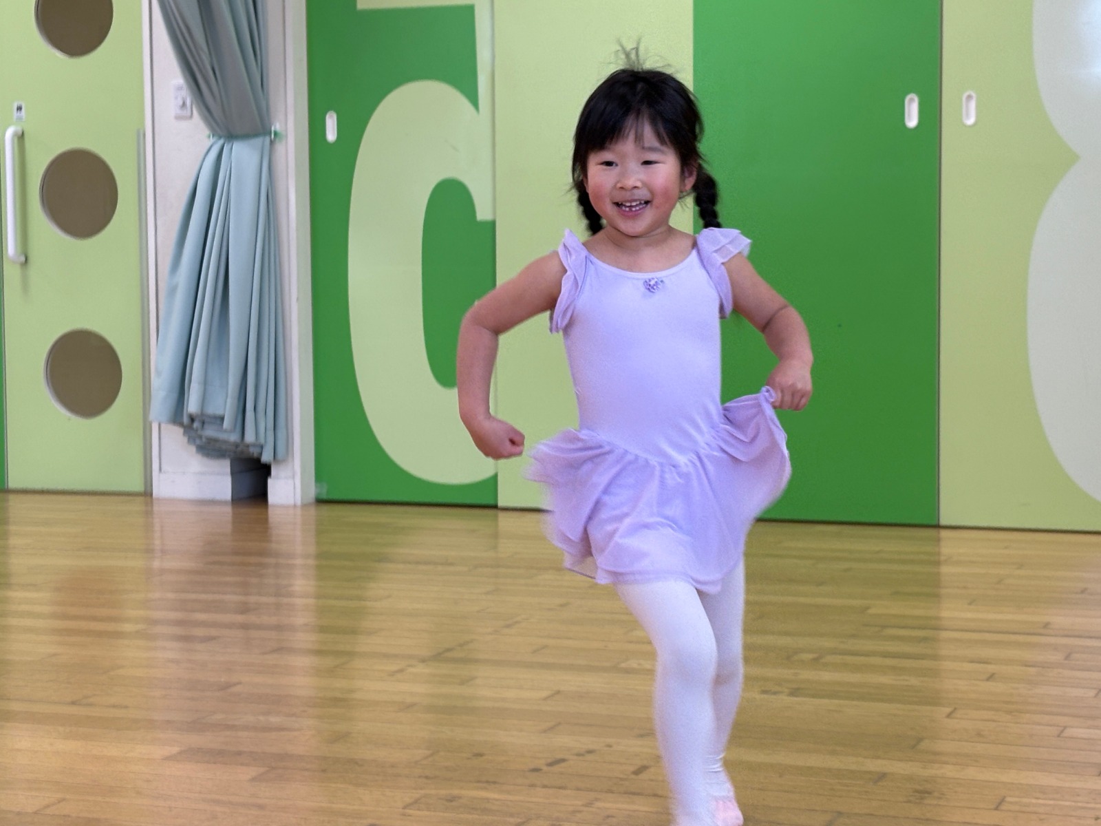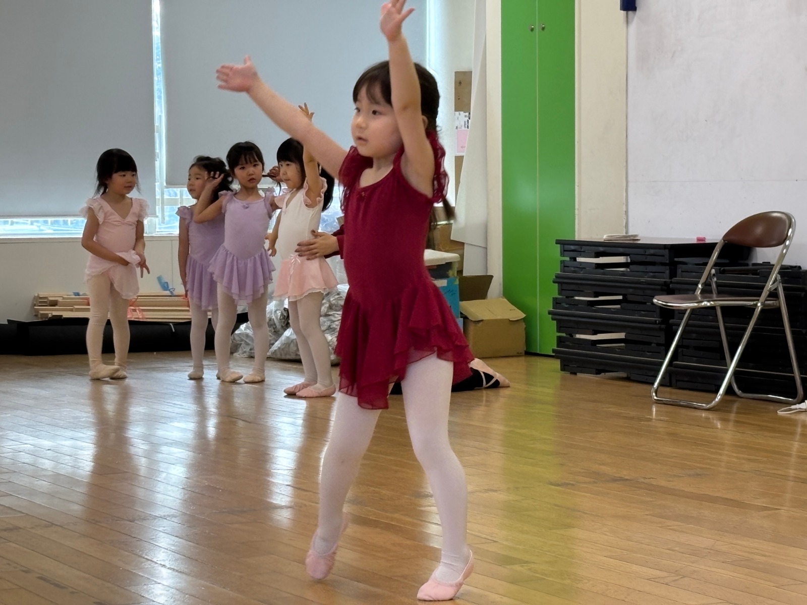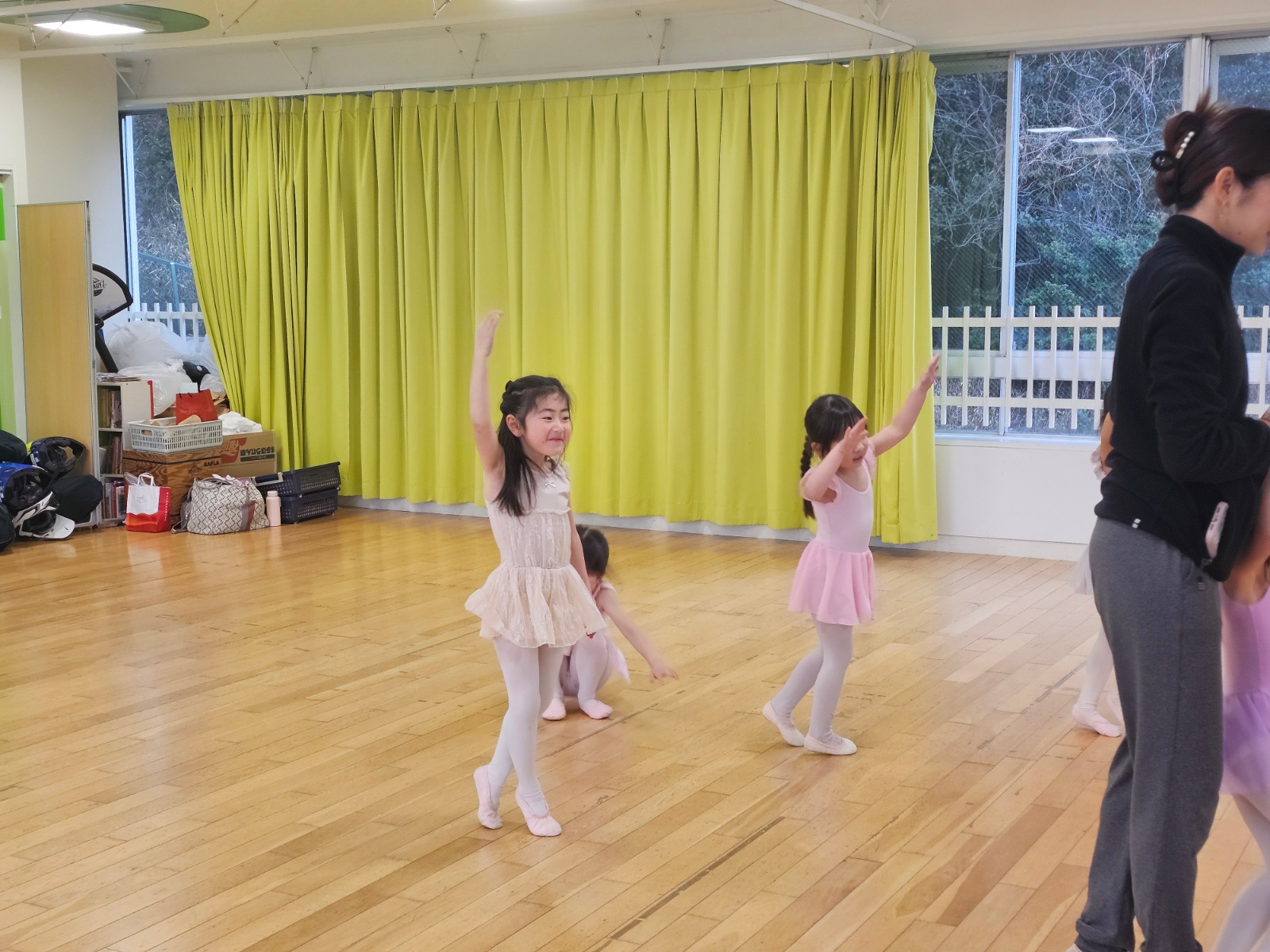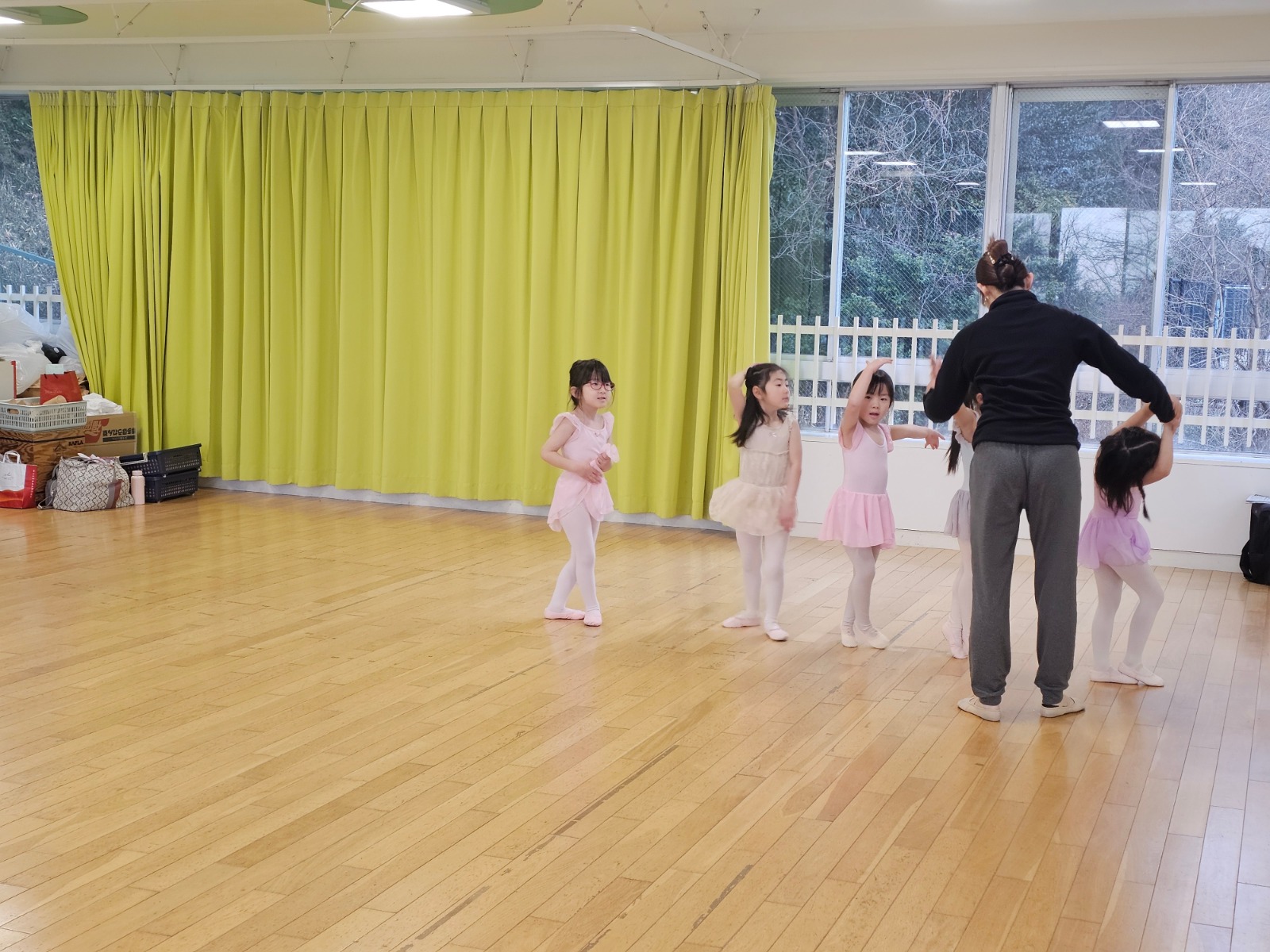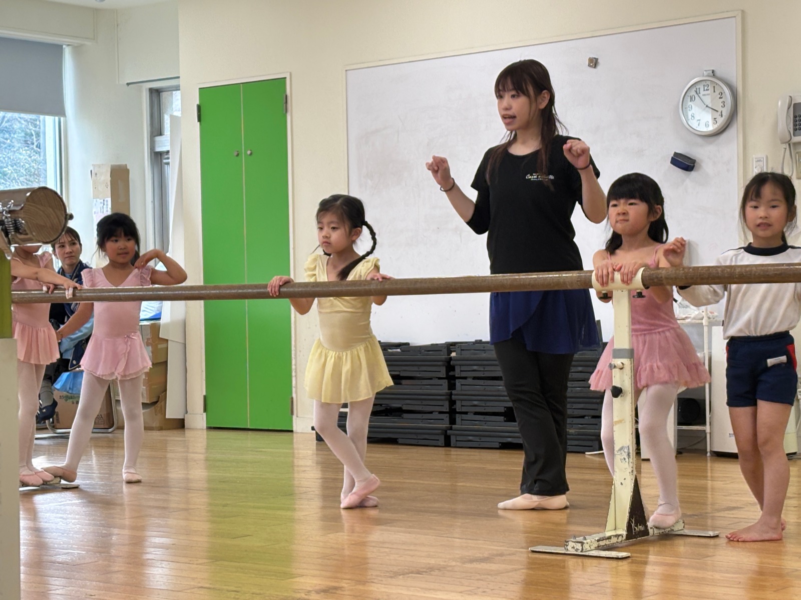 年中クラスでは、先生に「ここ上手にできたよ」と自分が自信を持てた場面を伝えている様子がありました。バーを使って基本の動きの確認も行い、一生懸命に先生の動きの真似をして、の真似をして練習に取り組んでいる様子が見られました。