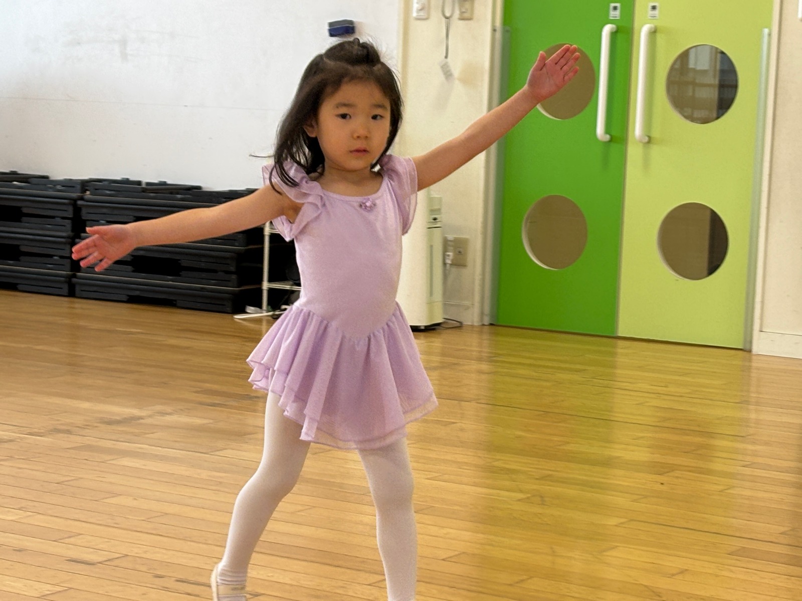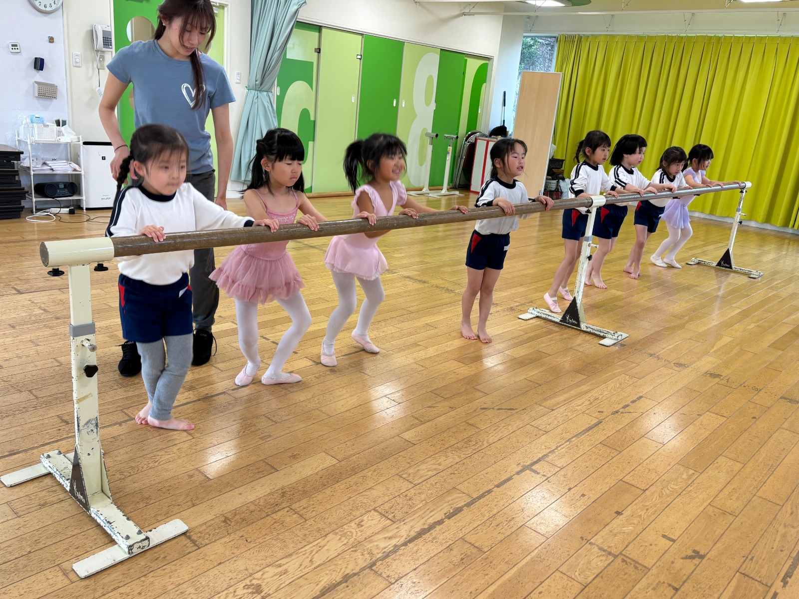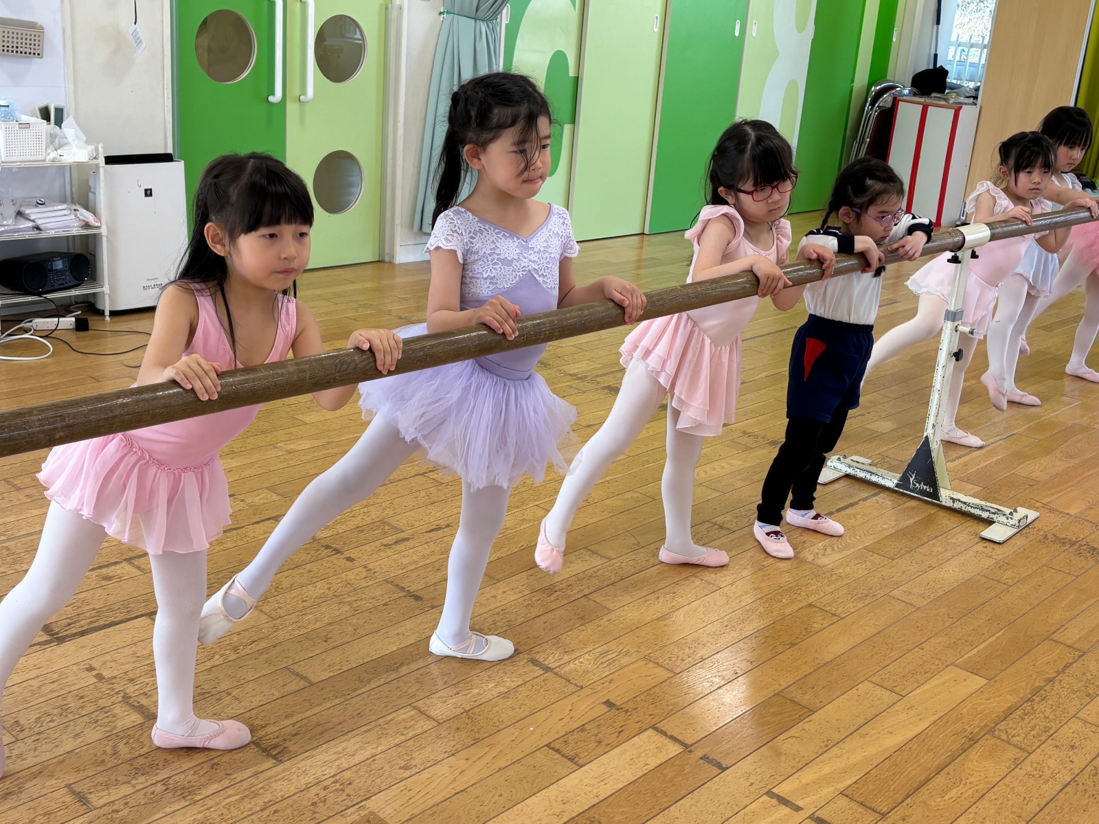 年中クラスでは、バーを使用した基礎練習を行いました。きれいに伸ばすところは伸ばす、メリハリをつけるなどができるようになっており、成長できる場面がたくさん見られました。