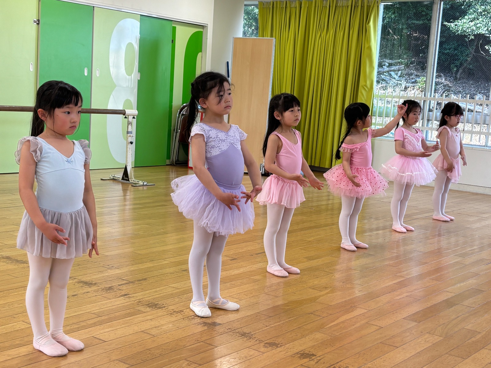 年少クラスでは、今までしてきた練習の振り返りを行いました。シュッシュとスカートをもって移動することやスキップでお遊戯室をまわる練習をしました。バレエがはじまったころと比べると身につく速度や身についていることがたくさんあるように感じます。4月と比べると大きく成長できたことがたくさんありました。