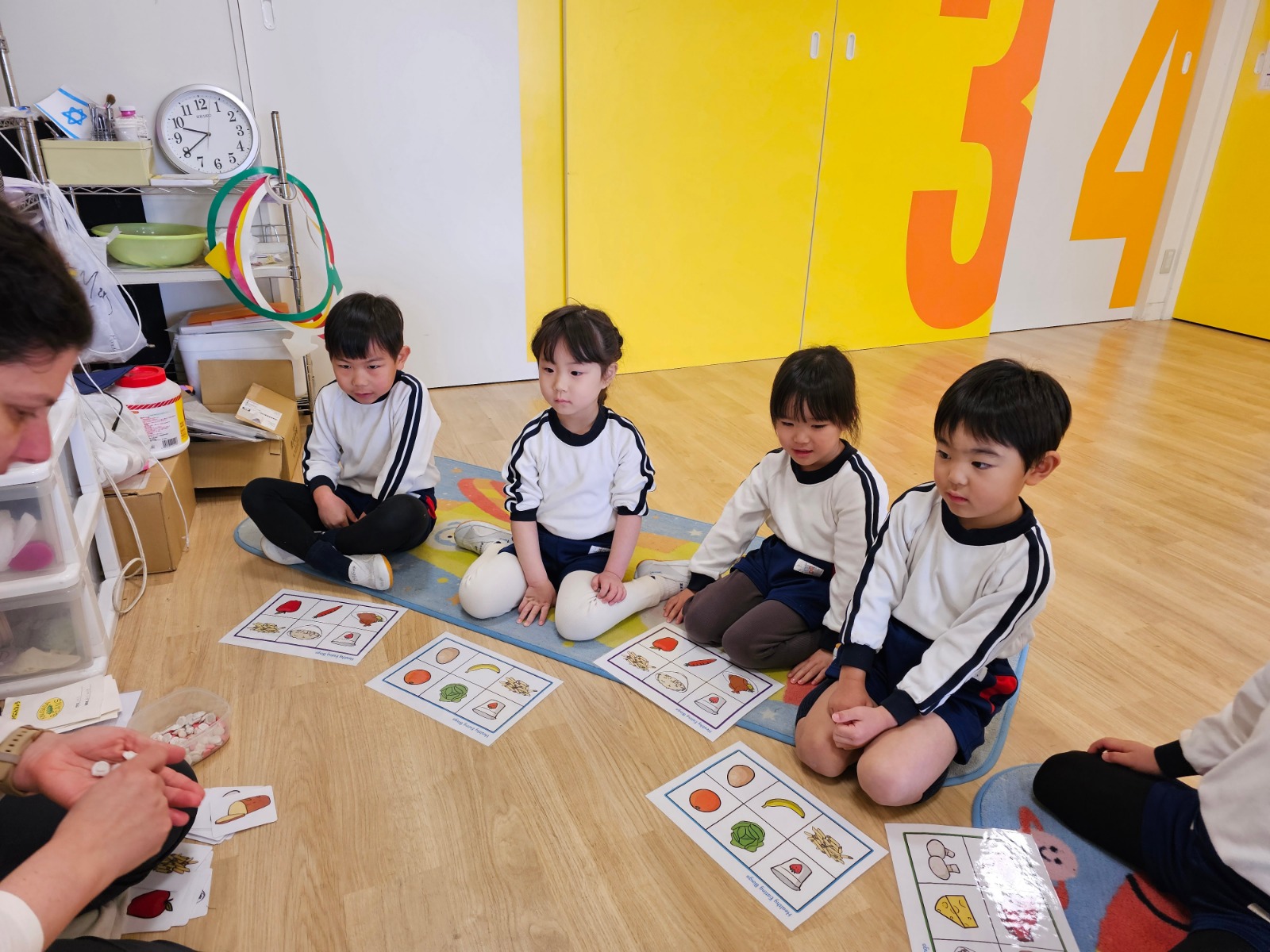 「Red circle」「Green triangle」など、色と形の2つの要素を英語で言います。色はすぐに出てきましたが、形がなかなか出てこないことがあり、Miaと一緒に確認しながら活動しました。