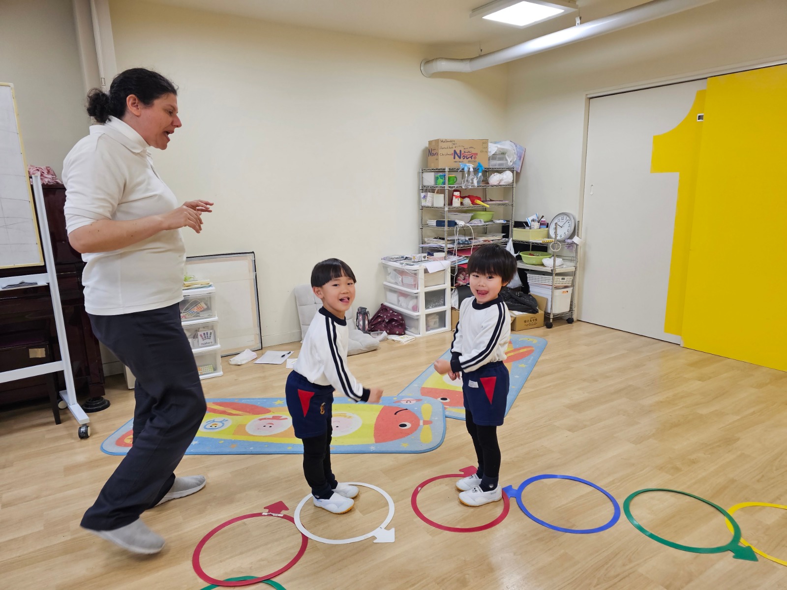 サイコロを振って、出た目の色・形を英語で答えたり、出た動物の動きをしたり、ゲームを通して楽しく英語で活動する子どもたち。