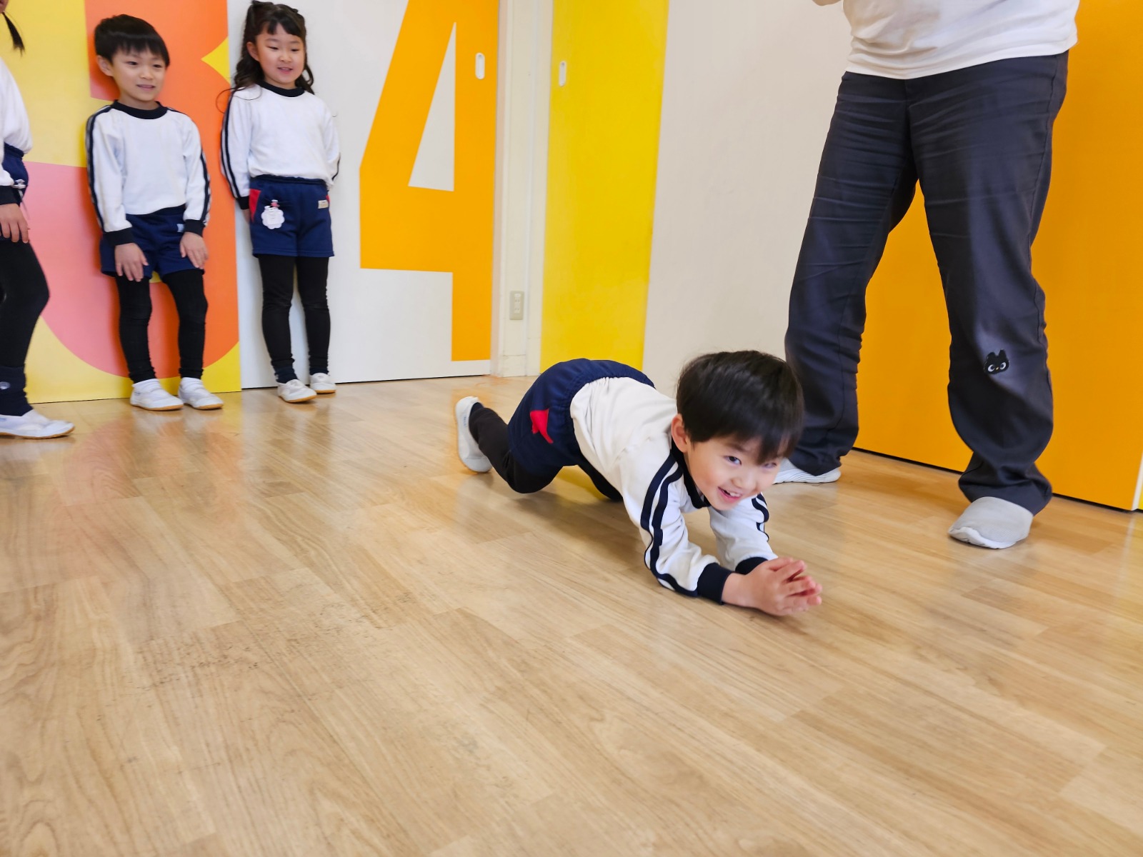 また、ウサギがでると「Jump Jump・・・」と飛び跳ねたり、象がでると「Thump thump・・・」と足音を立てながら歩いたり、動物になりきって動きを表現する子どもたちでした。