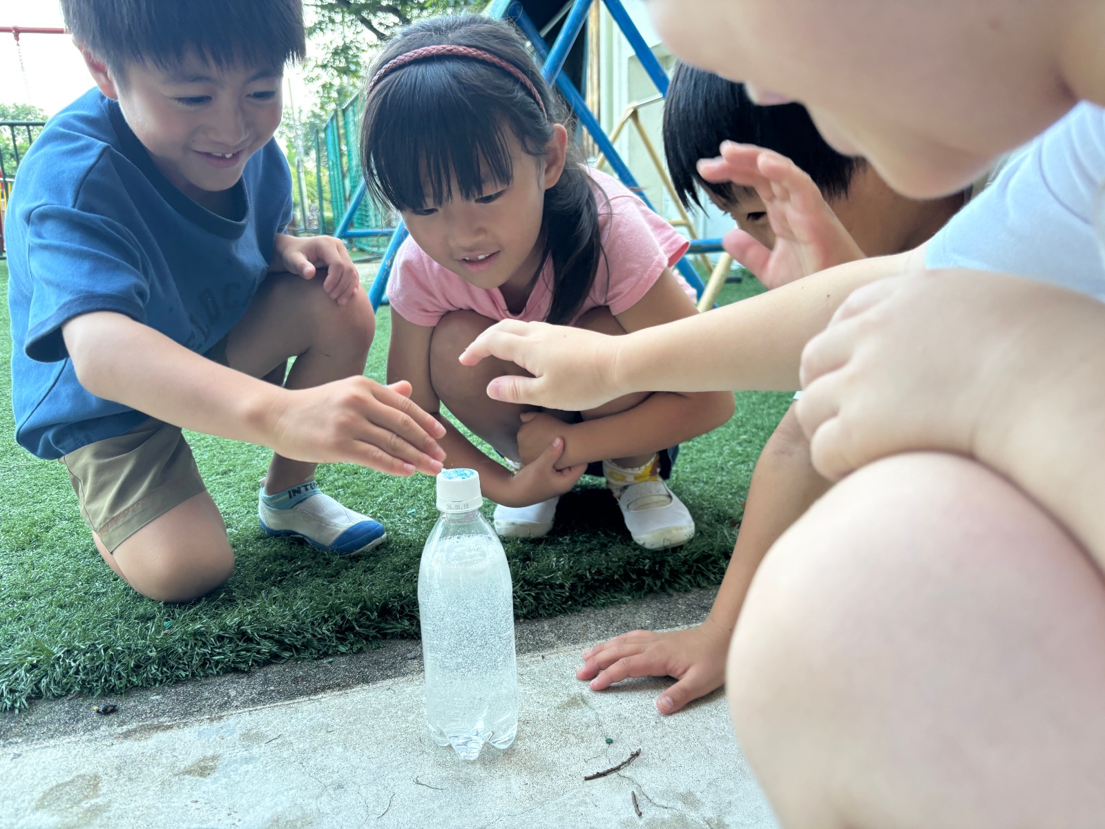 先に溶けたオブラートのラムネがペットボトルの底に沈むと急に泡が発生。ペットボトルの蓋に小さな穴をあけていたため、炭酸水が噴き出て瞬間にみんな大興奮!