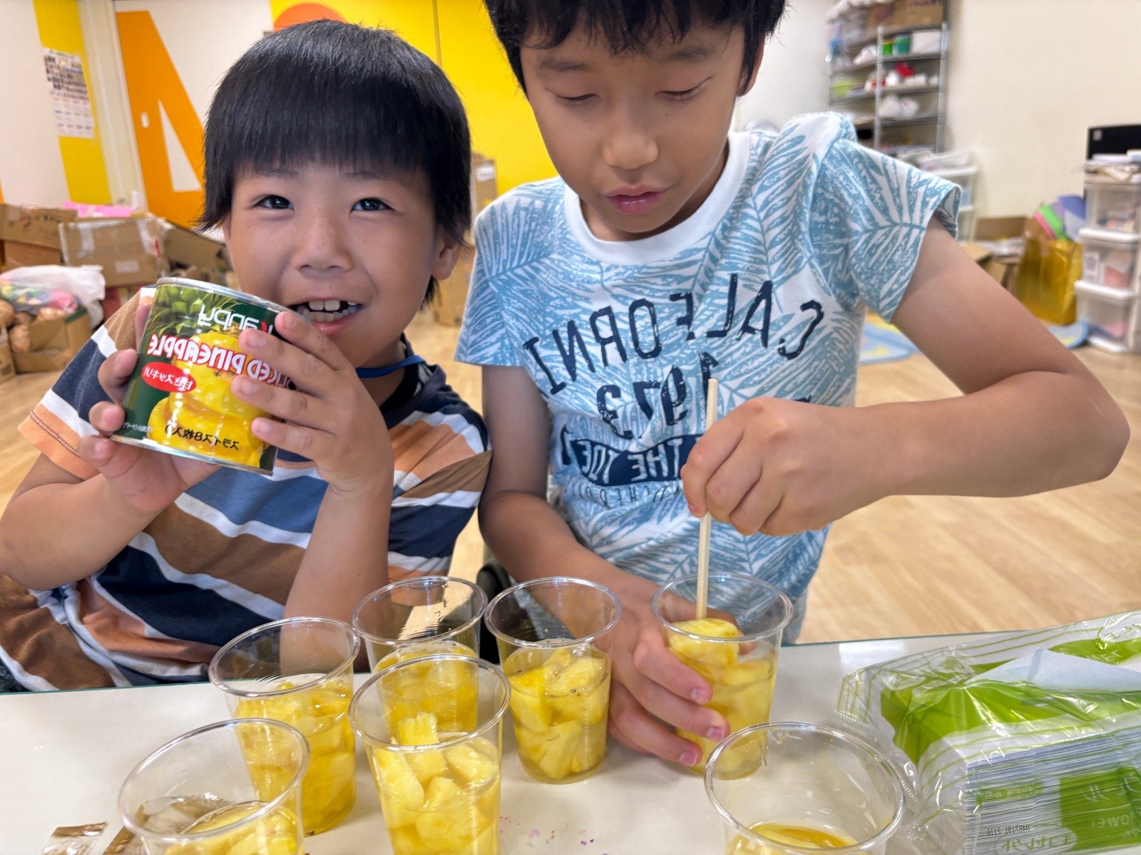 結果は生のパイナップル以外は固まることを発見。加熱処理がされているから「酵素がないのかな」と分析するお友だちもいました。