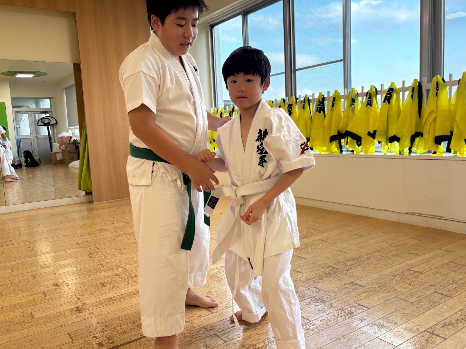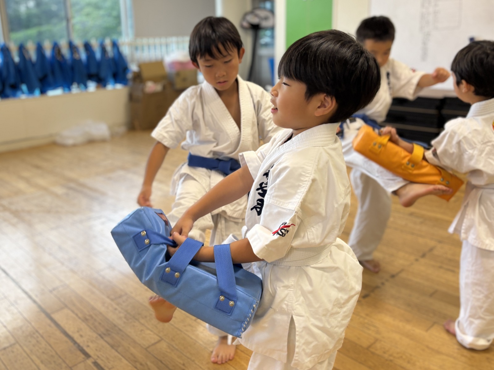 ミット練習ではペアになったお友だちにミットを持ってもらって練習。1年生に持ってもらって練習するときは少し手加減しながらも、しっかりとミットをおさえて行えるように声掛けをしていました。