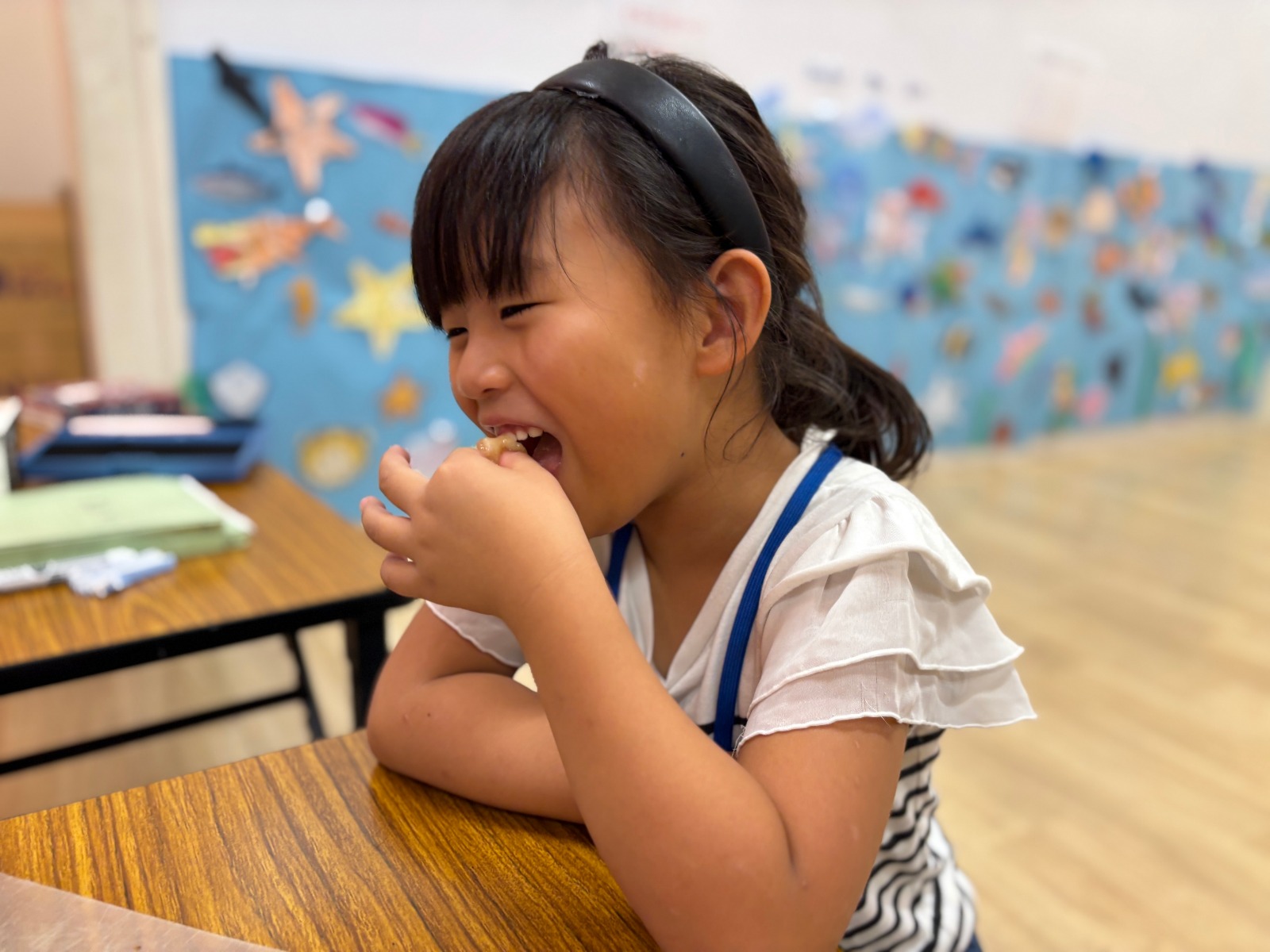食べてみると「酸味はなくて、甘いな」「赤色のツブツブが美味しい」と初めて食べた感想をみんなで言い合っていました。