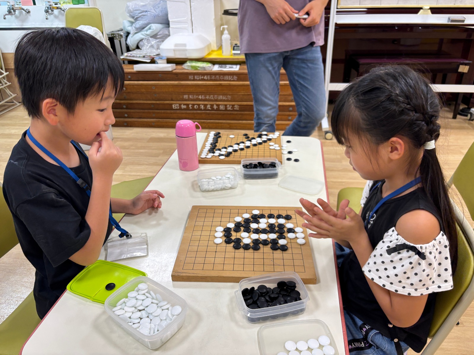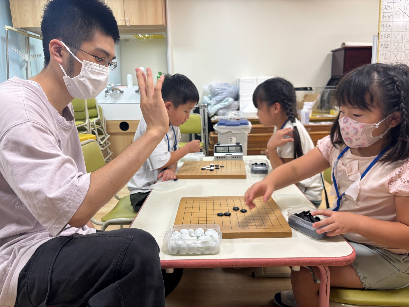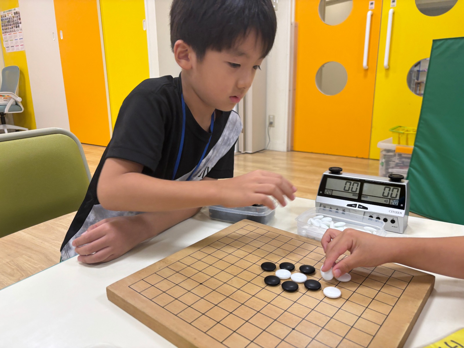 9月もみんなで総当たり戦を開催! 今回は絶対勝つと毎回気合が入っており、激しい対局が繰り広げられております。 また、9月の囲碁クラブでは「ゲタ」や「シチョウ」という取り方を学び、対局で実践する姿もありました。 「私シチョウの取り方が一番好き」「階段みたいな形でおもしろい」とシチョウが人気のようです。 毎回最後まで全員と戦い抜き、石取り・陣地取り・五目並べで順位を発表! 1位になれるととても喜ぶ姿が見られました。