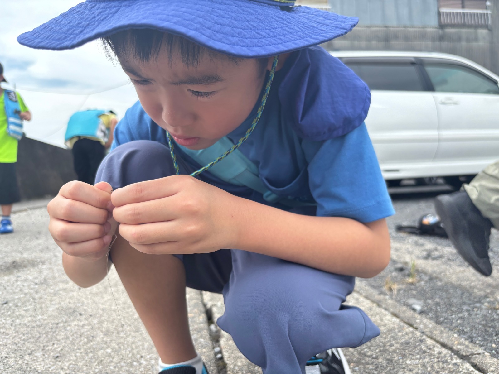 今回より高学年は釣り針にハリスという細い糸を付ける作業も行いました。