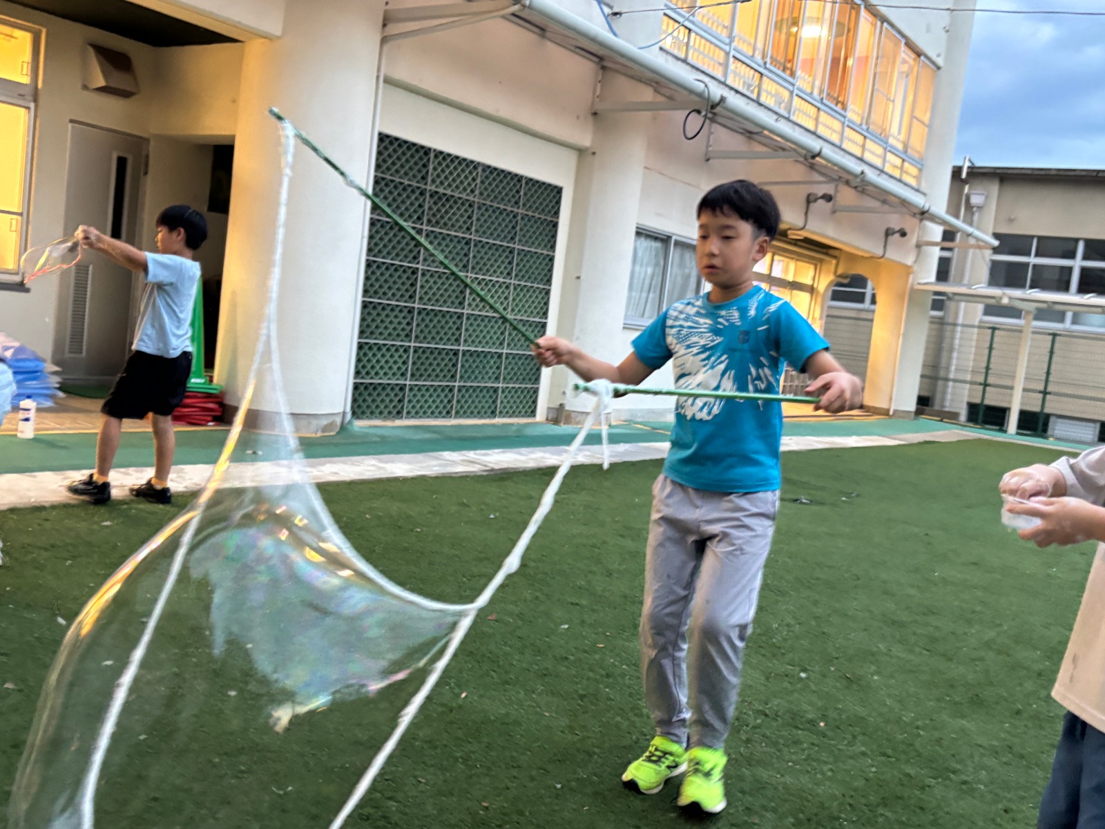 上手くシャボン玉が作れず割れてしまうこともありましたが、おおきなシャボン玉が出来るとみんなで大興奮!「できた!」「先生見て見て!」ととても嬉しそうでした。