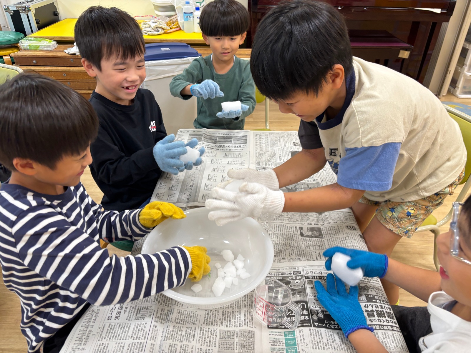 最後にドライアイスとシャボン玉を使った不思議な実験では、ドライアイスによりシャボン玉が飛んでいったり、沈んでいったりせずにドライアイスの上でシャボン玉が浮き続けることを発見。