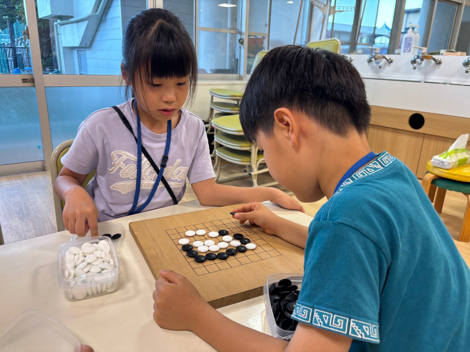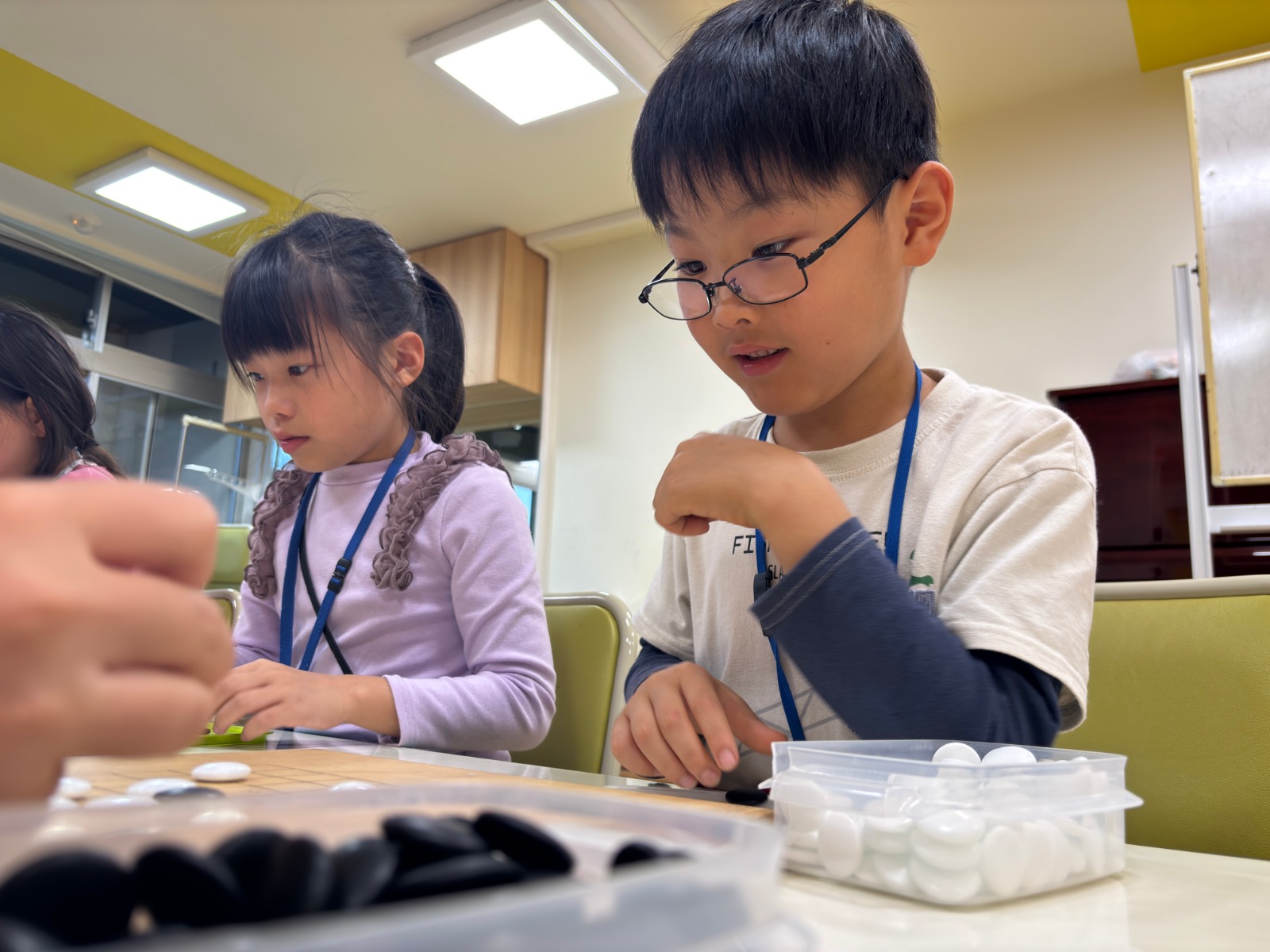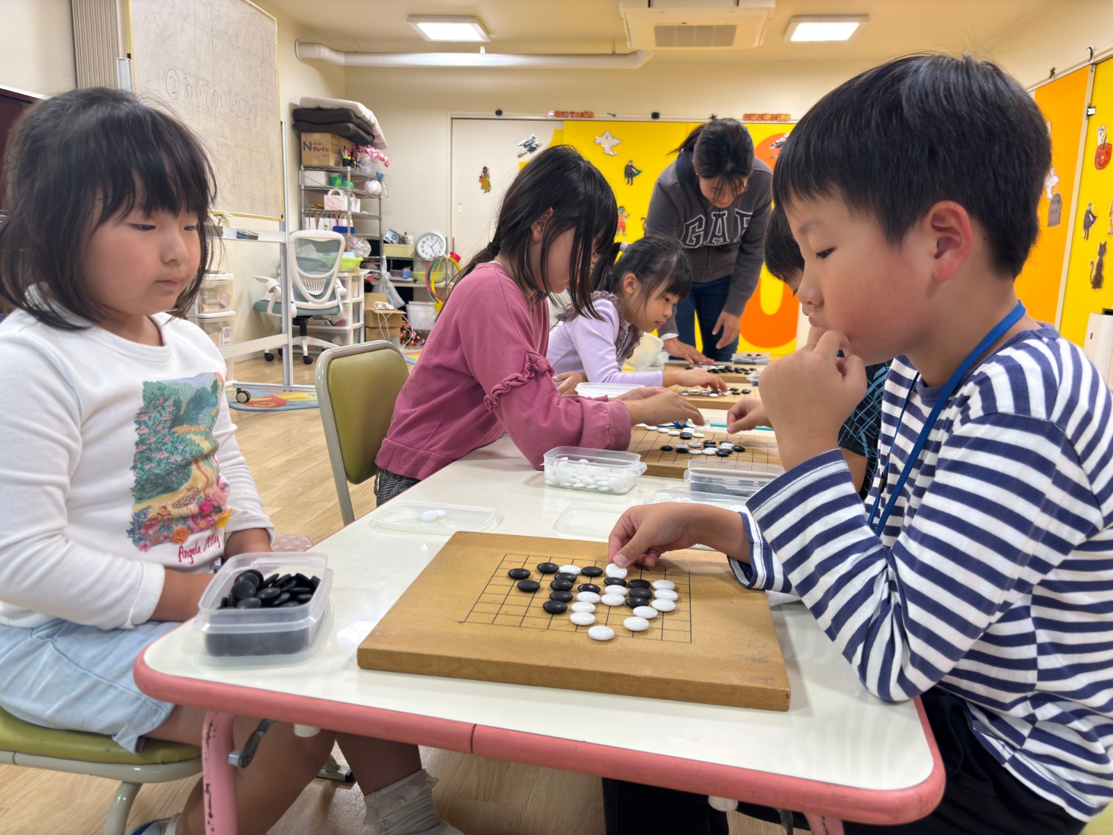石を打つ手順を間違えると相手に取られてしまい形勢が変わる場面でも集中して考え、見事沢山の石をとることに成功。1年生が上級生に勝ててとても喜ぶ姿がありました。