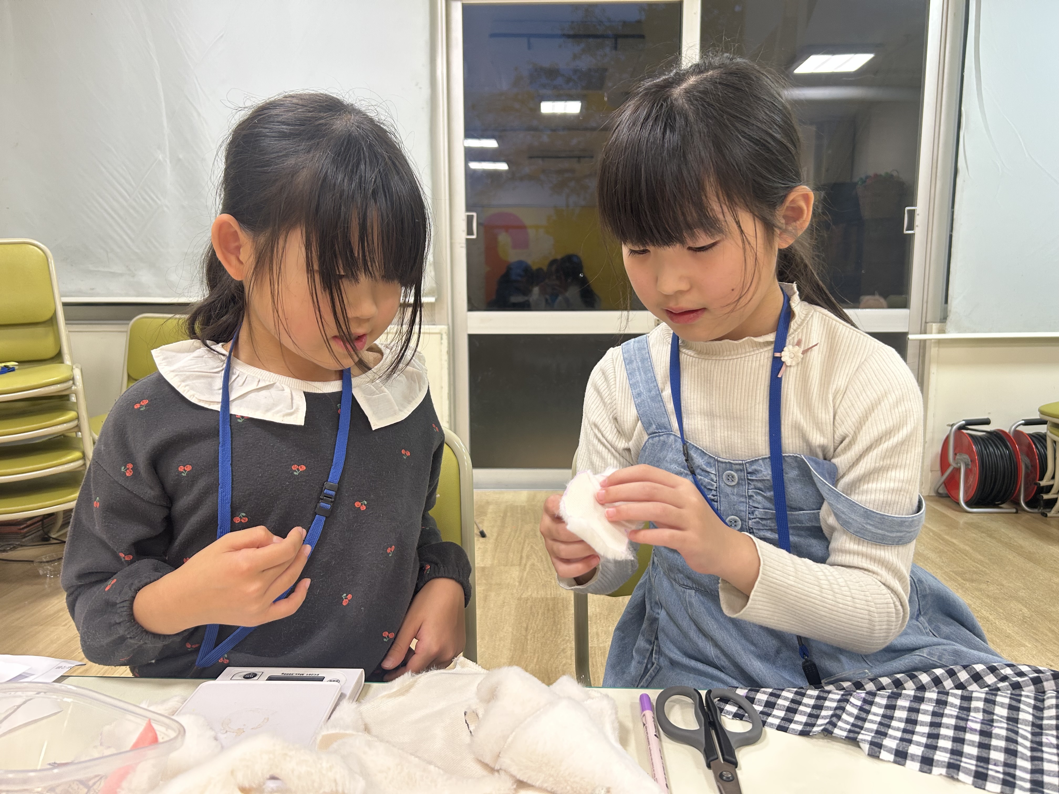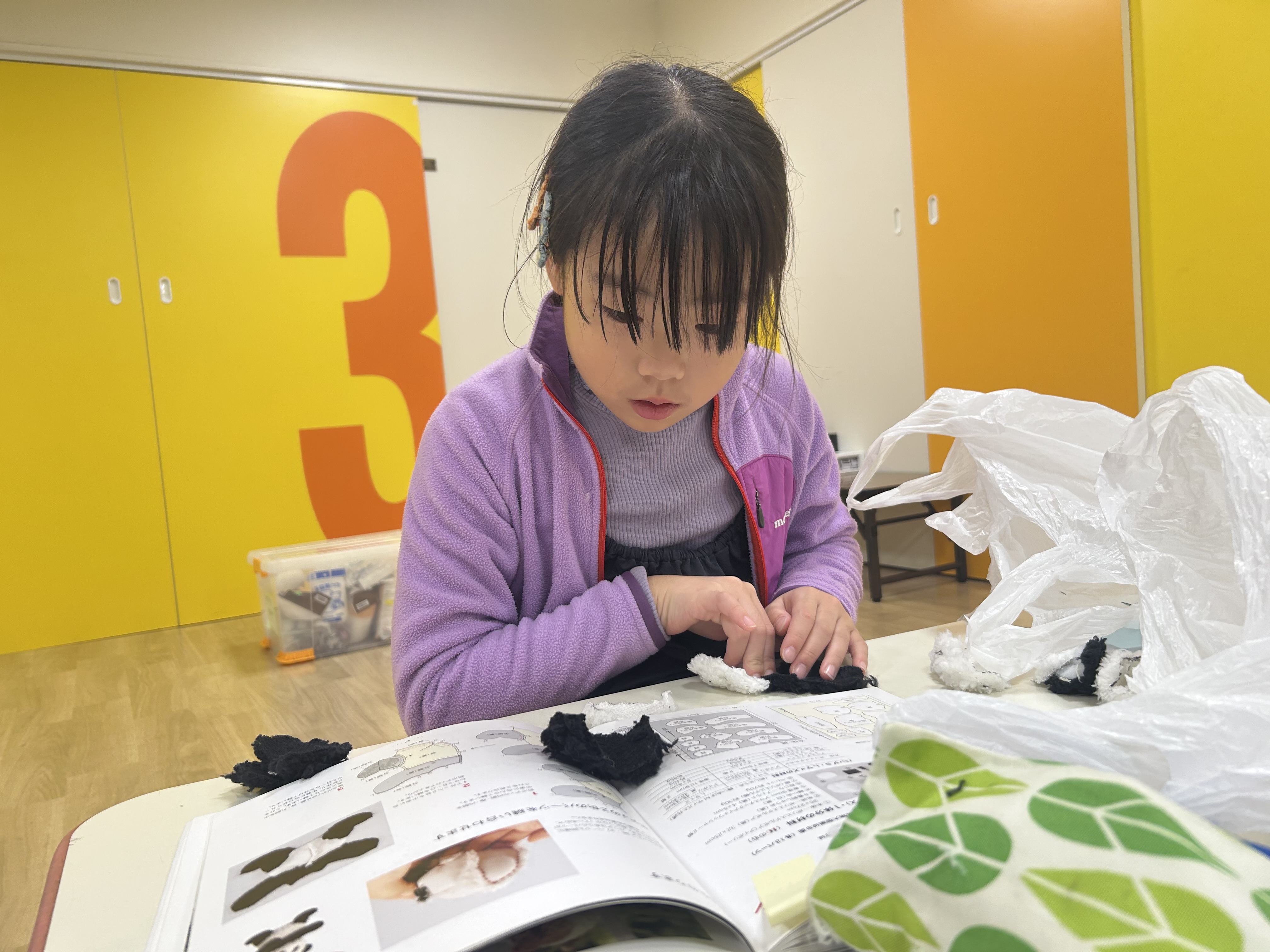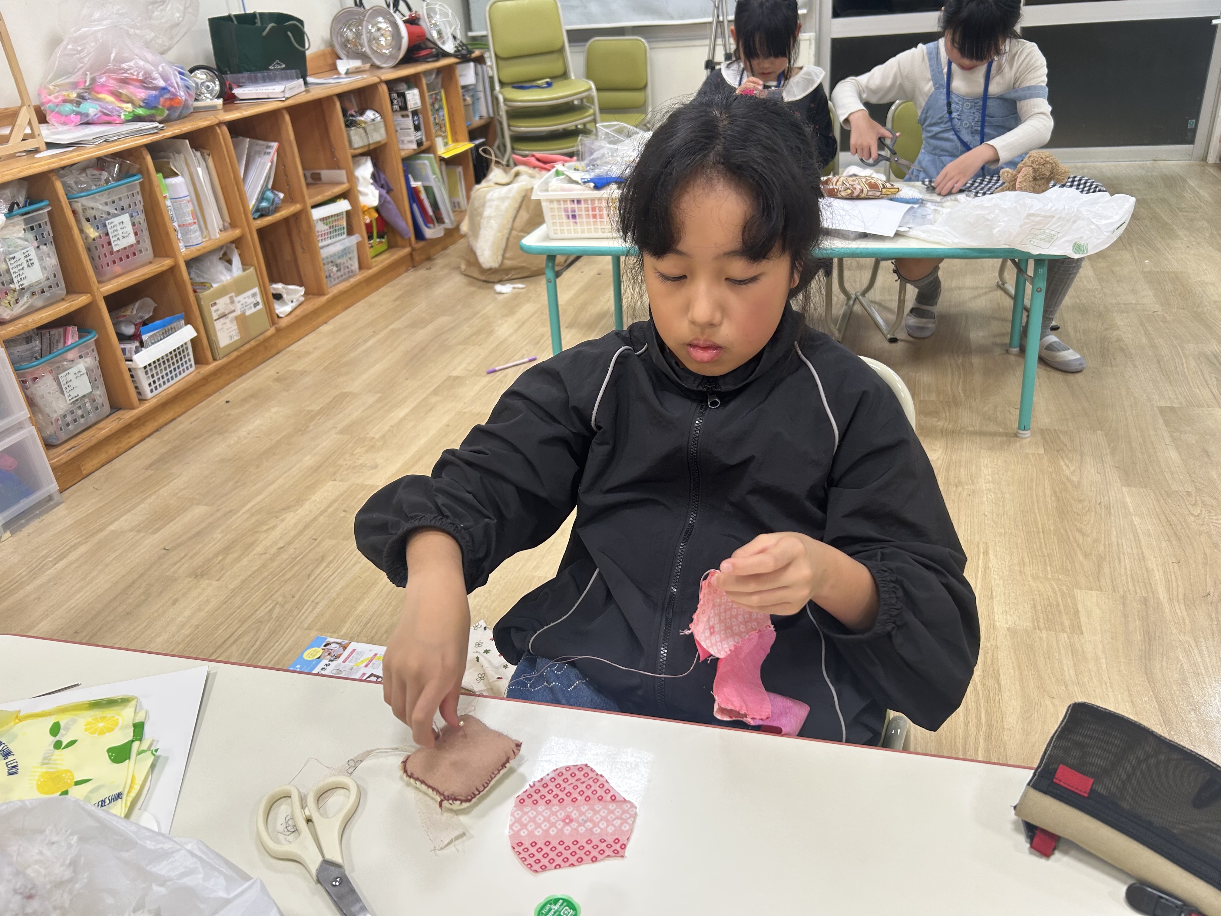 ぬいぐるみが完成したお友達は、服を作ったり、ぬいぐるみを入れるポーチを作っていきます。 服はぬいぐるみに合う柄を選び服の形に切って縫い合わせていきます。 ポーチはぬいぐるみを作る際に余ったふわふわの生地を使って自分の好きな形に作っていきます。 「これくらいでいいかな?」「合わせてみよう」と色々試しながら制作を進めていく子どもたち。 完成が楽しみですね!