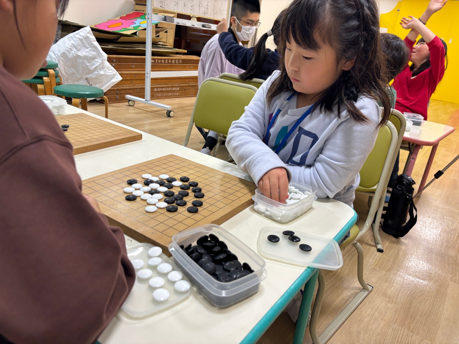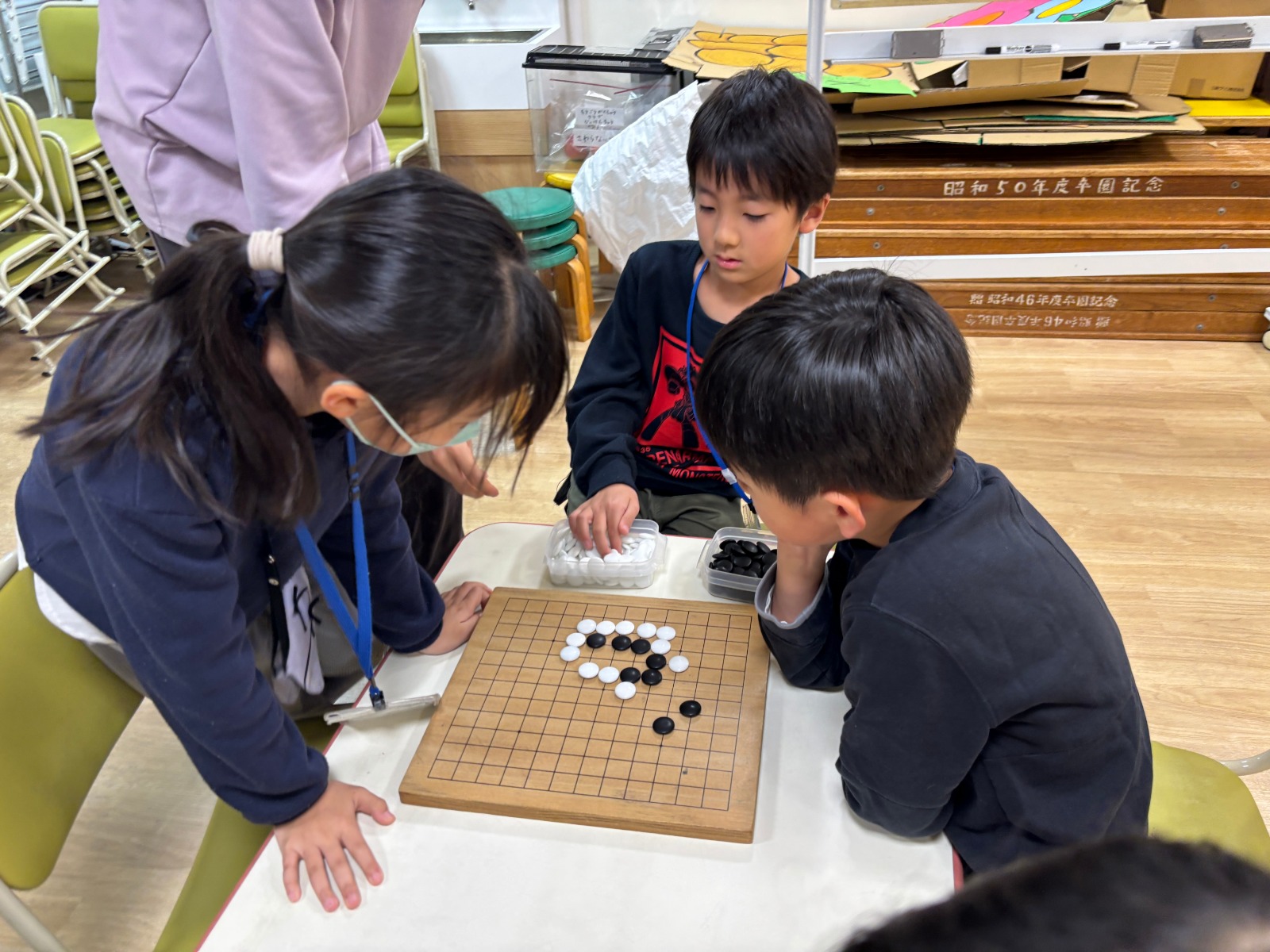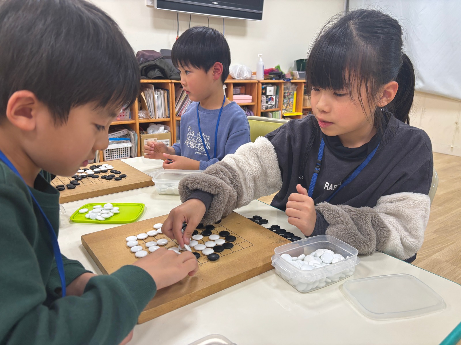 リーグ戦やトーナメント戦を実施。 週ごとに五目並べ・石取りゲーム・陣地取りゲームが変わるので、1年生でも週によっては優勝することも。 優勝できるとみんなとても喜ぶ姿が見られます。 また、11月は講師の詰碁問題にも挑戦! みんなで同じ問題を考え、どのように石を置いたら、次にどこに置かれるのかを考えて、進めていきました。 分かった人から先生と詰碁!簡単には正解できませんでしたが、「次こそは正解する!」と次回の抱負も話してくれました。