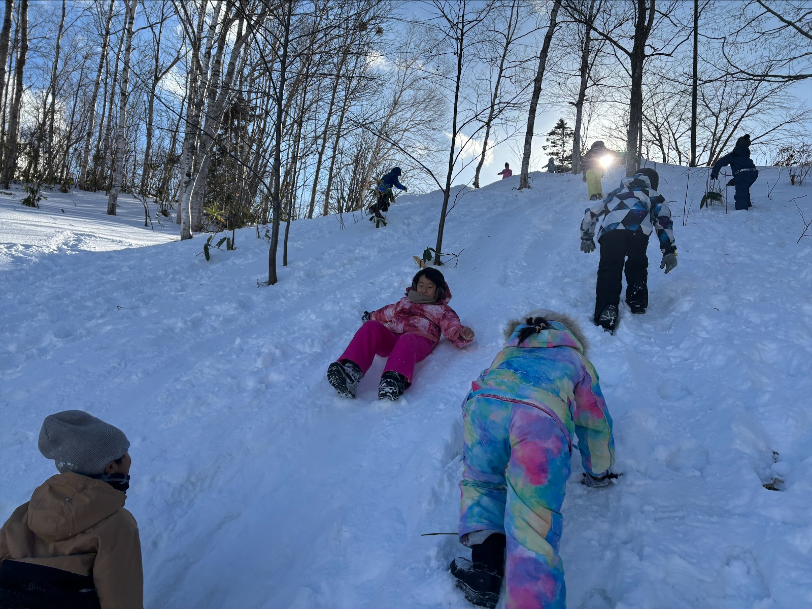 他にも「この坂道を滑りたい!」と雪の坂道をすべる子どもたち。「すごい!めっちゃ早い!」「自然の滑り台みたい!」とたくさん遊ぶことができて満足でした☺️☺️