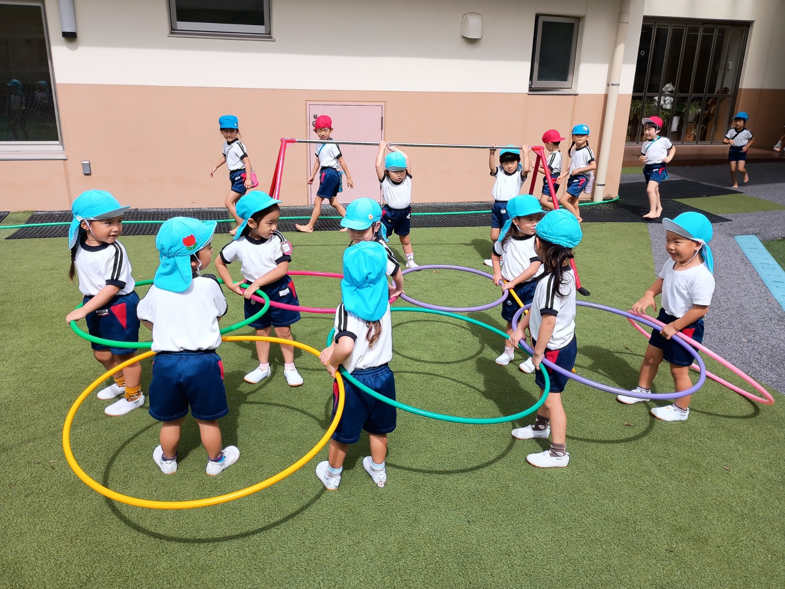 散歩だけでなく、下園庭でもたくさん体を動かして遊んでいます!フラフープや坂道をコロコロ転がって楽しんでいますよ!これからもたくさん外で遊びたいと思います!