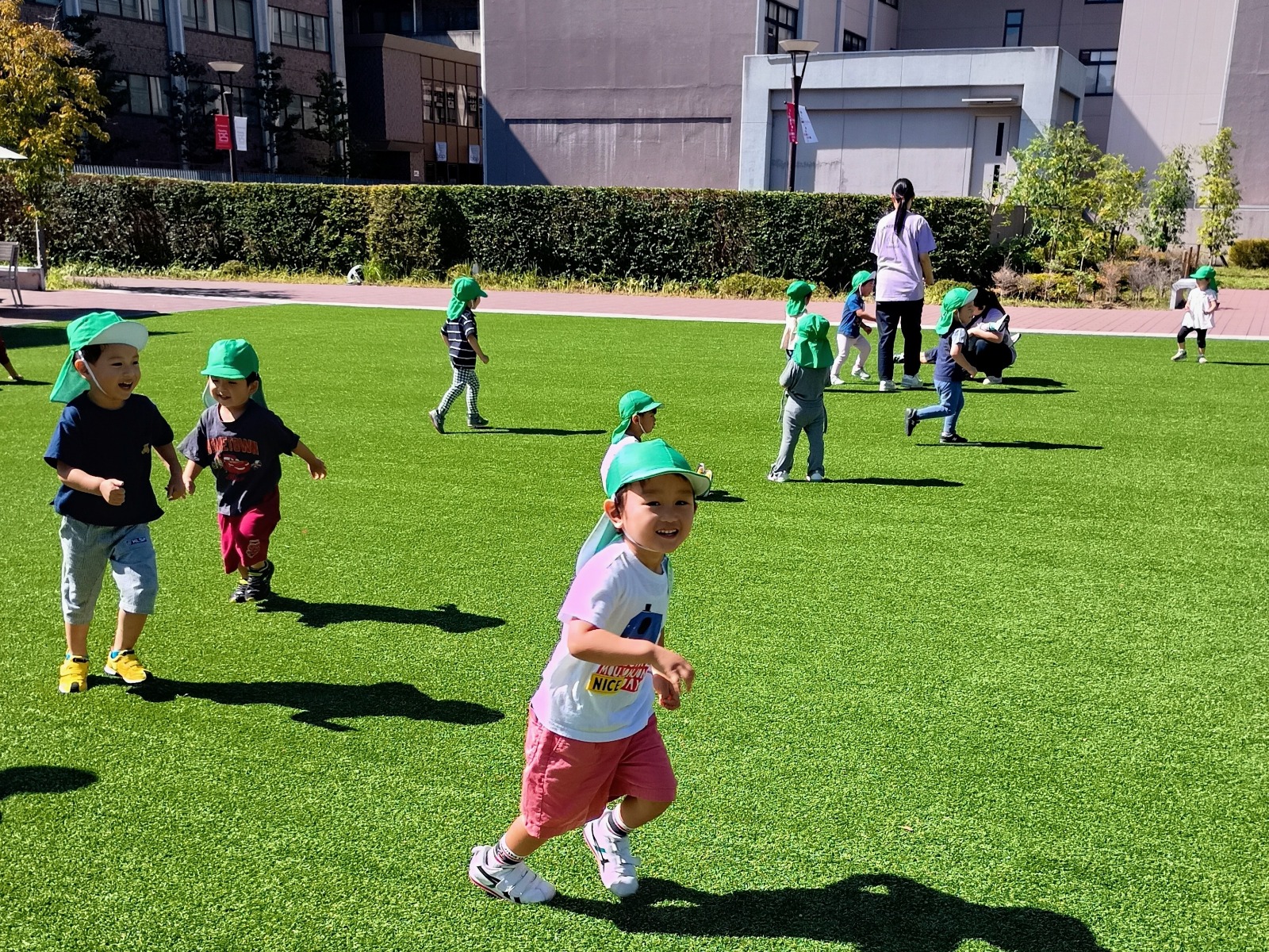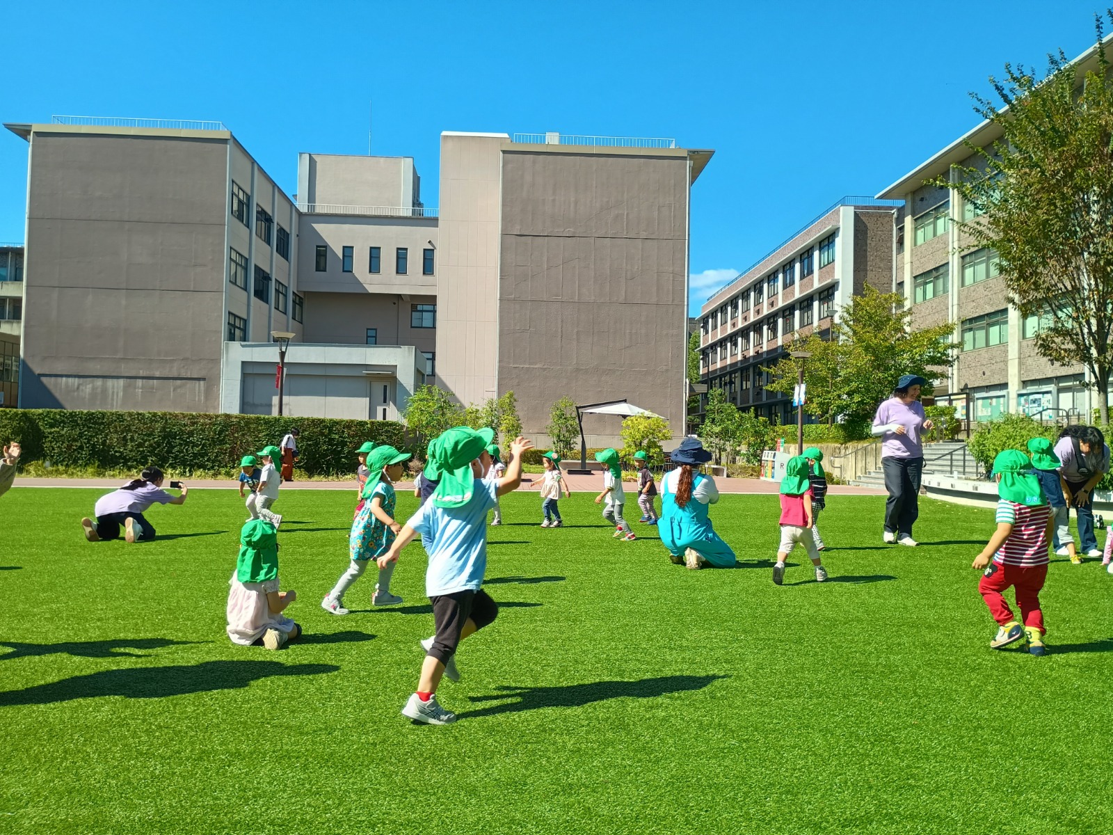 立命館大学では、芝生があるところに行き、みんなで記念撮影をしてから、追いかけっこをしました。