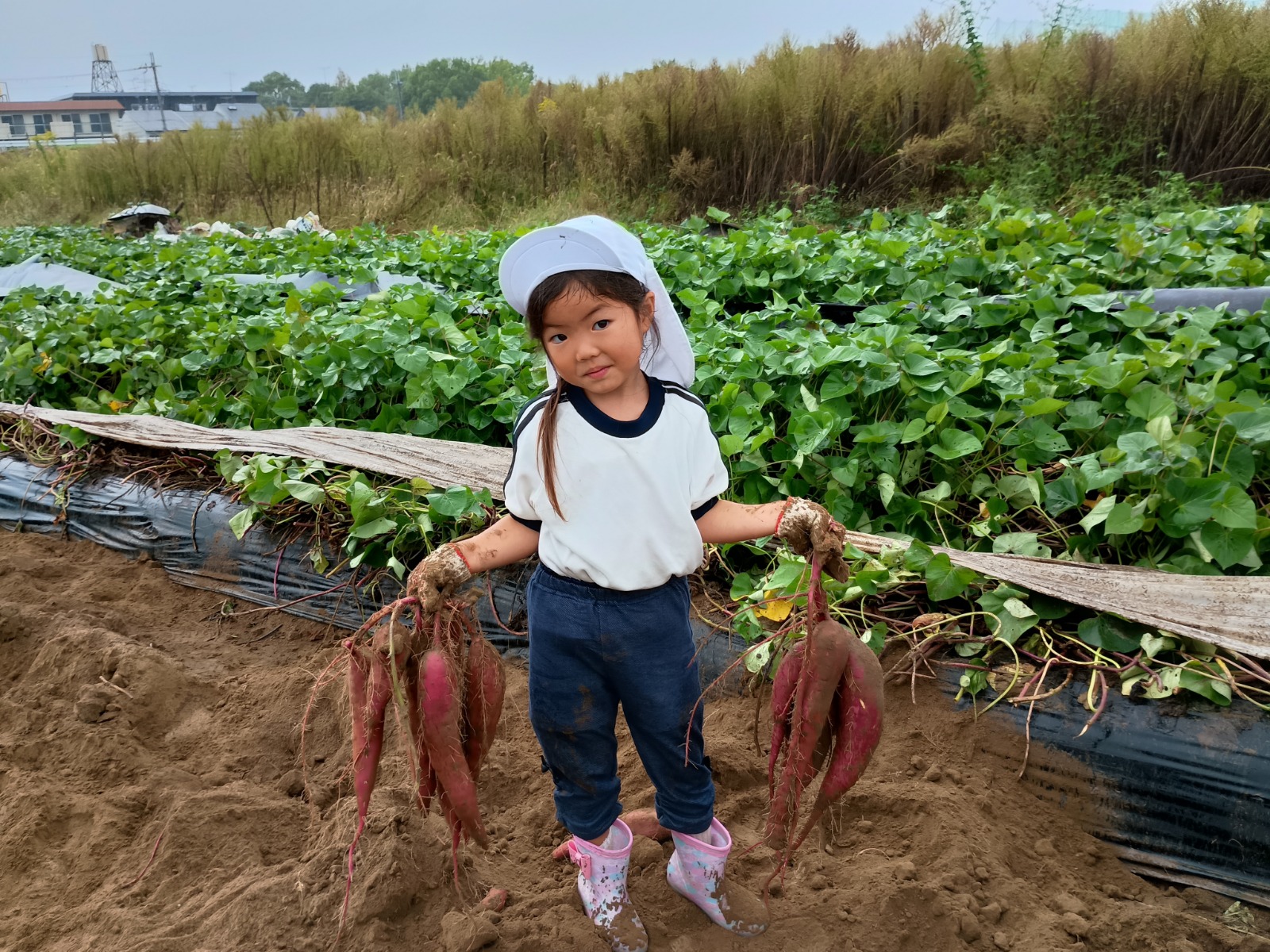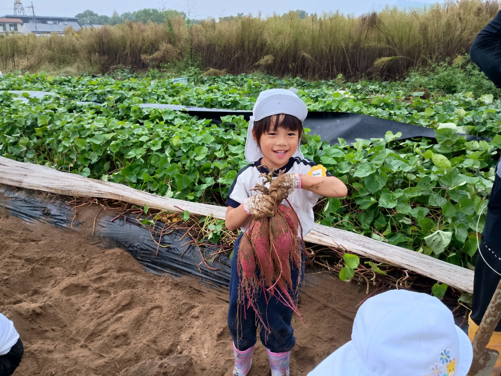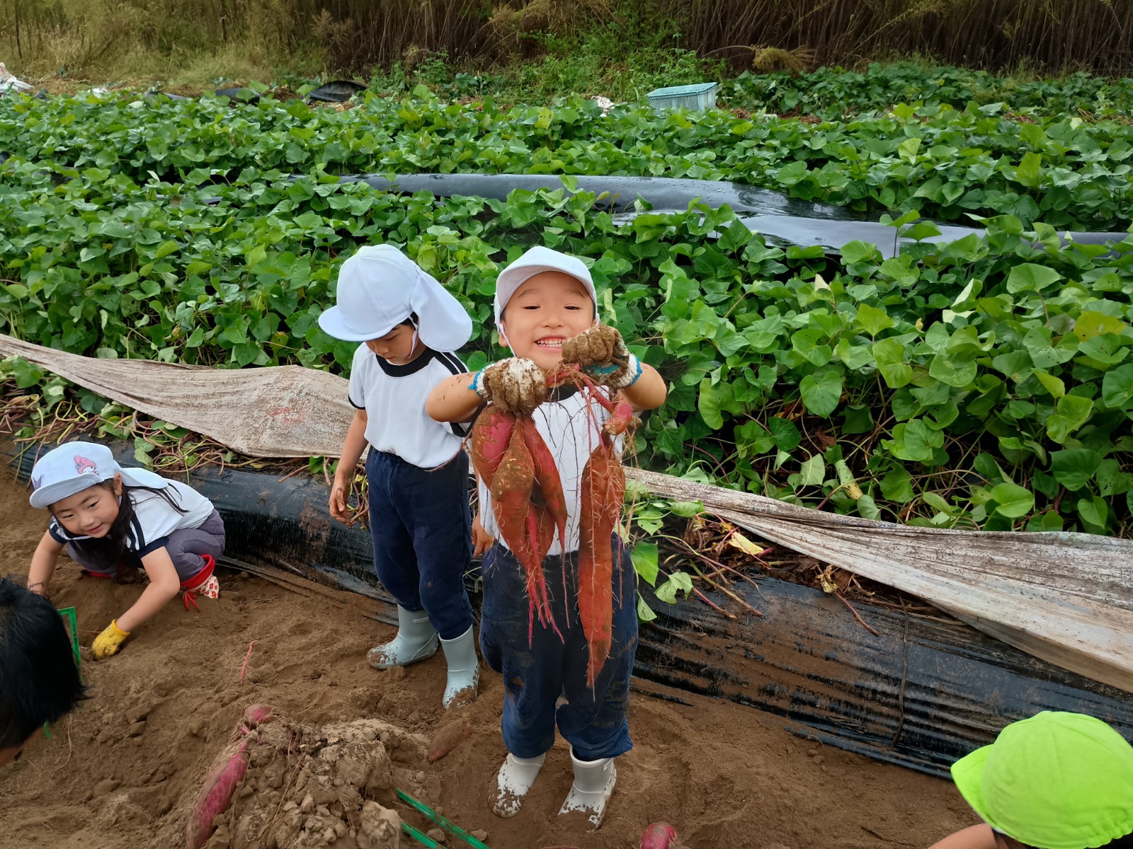 さて、今週はきく組の前半チームさんが芋掘りに行ってきました!両手で土をかき分けると、想像以上の大きさに驚く子どもたち。一株にいくつものお芋ができていて、「1つやと思ったら5個もついてたー!!」と大発見のお友達もいました。