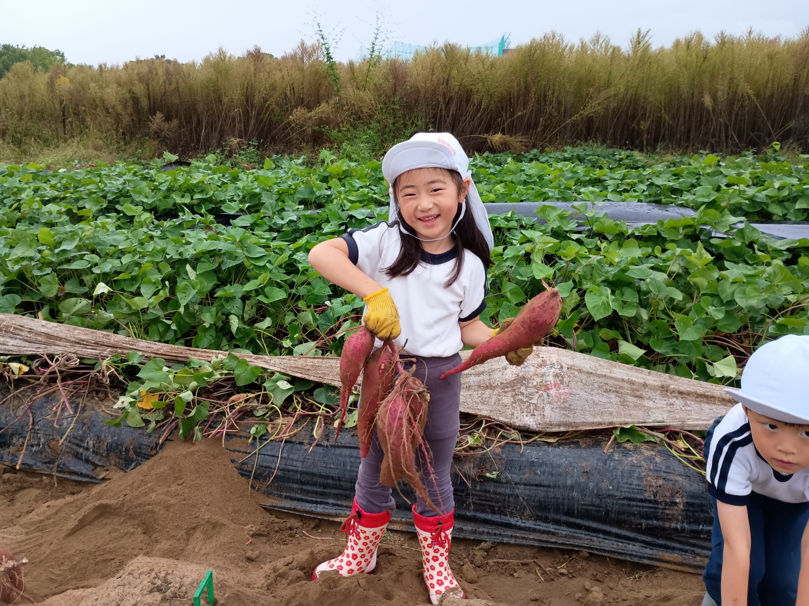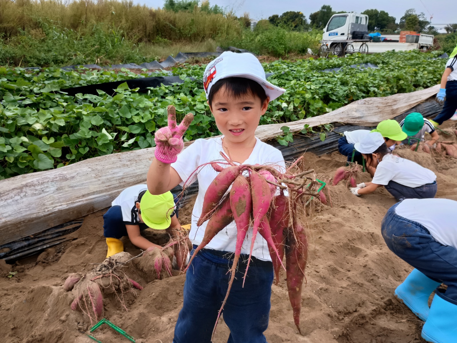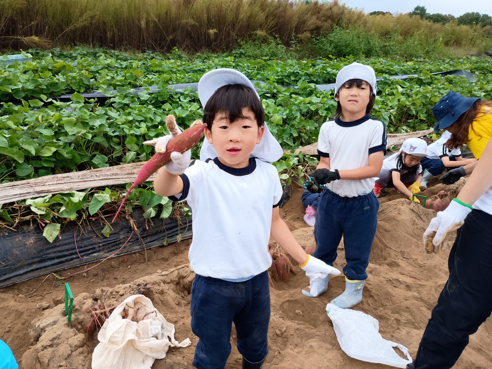 さて、今週はきく組の前半チームさんが芋掘りに行ってきました!両手で土をかき分けると、想像以上の大きさに驚く子どもたち。一株にいくつものお芋ができていて、「1つやと思ったら5個もついてたー!!」と大発見のお友達もいました。