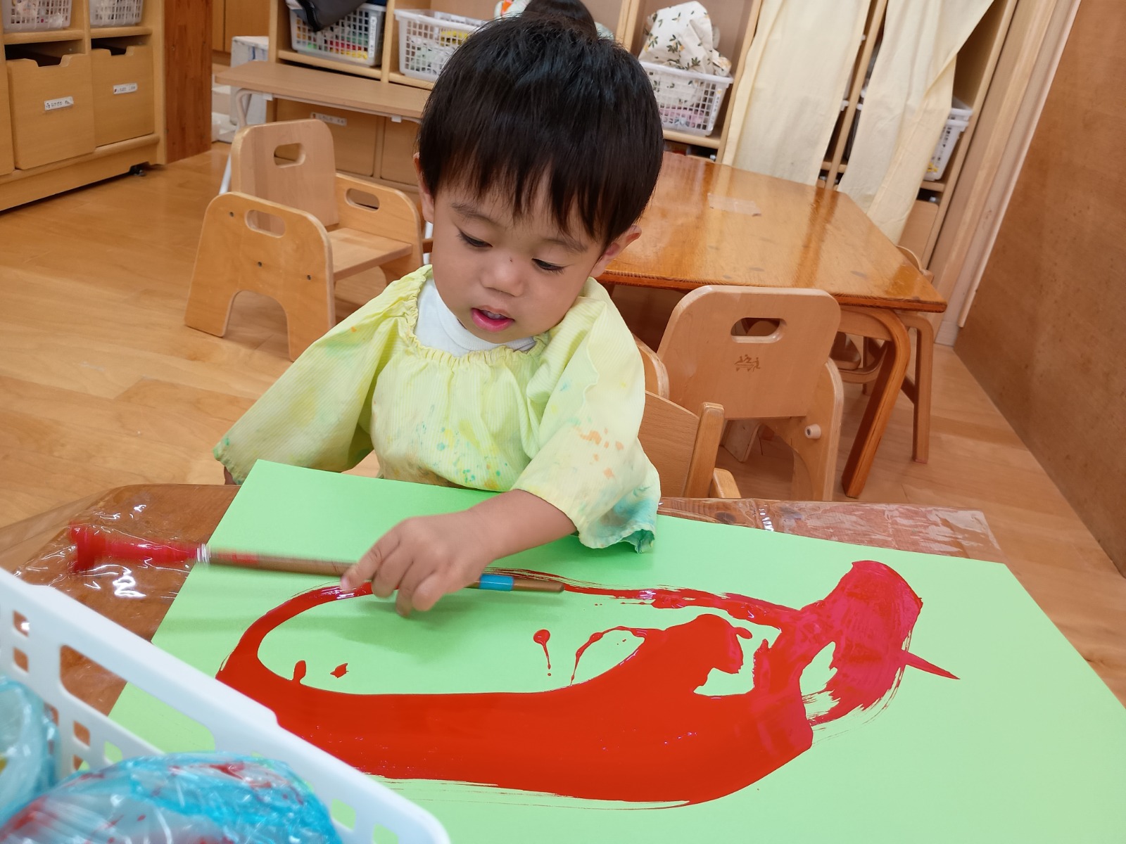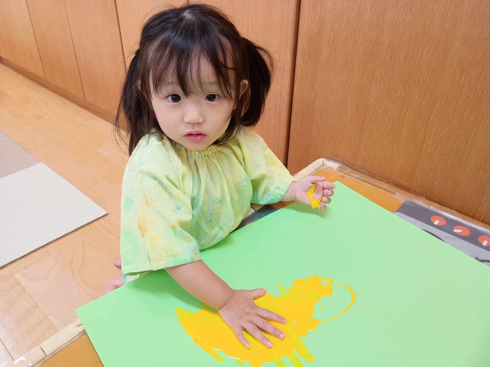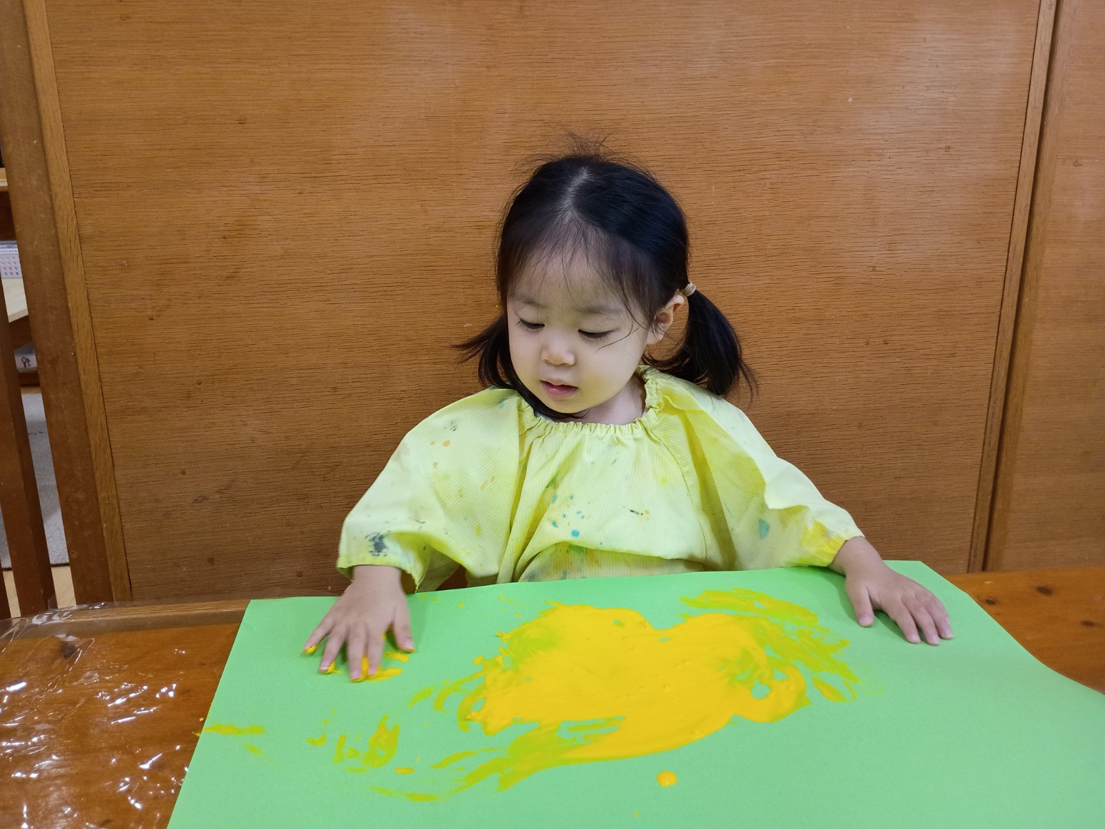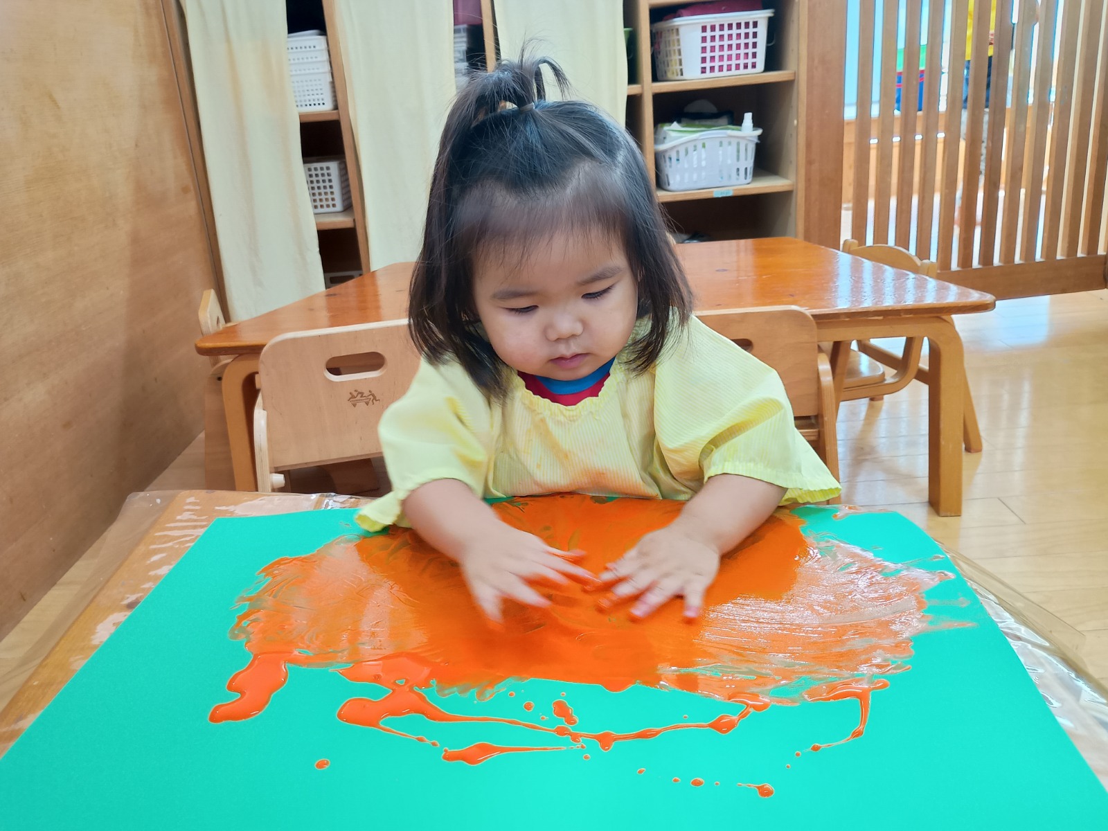 赤黄オレンジの絵の具から好きな色を選び、手や筆でかぼちゃを描きました。