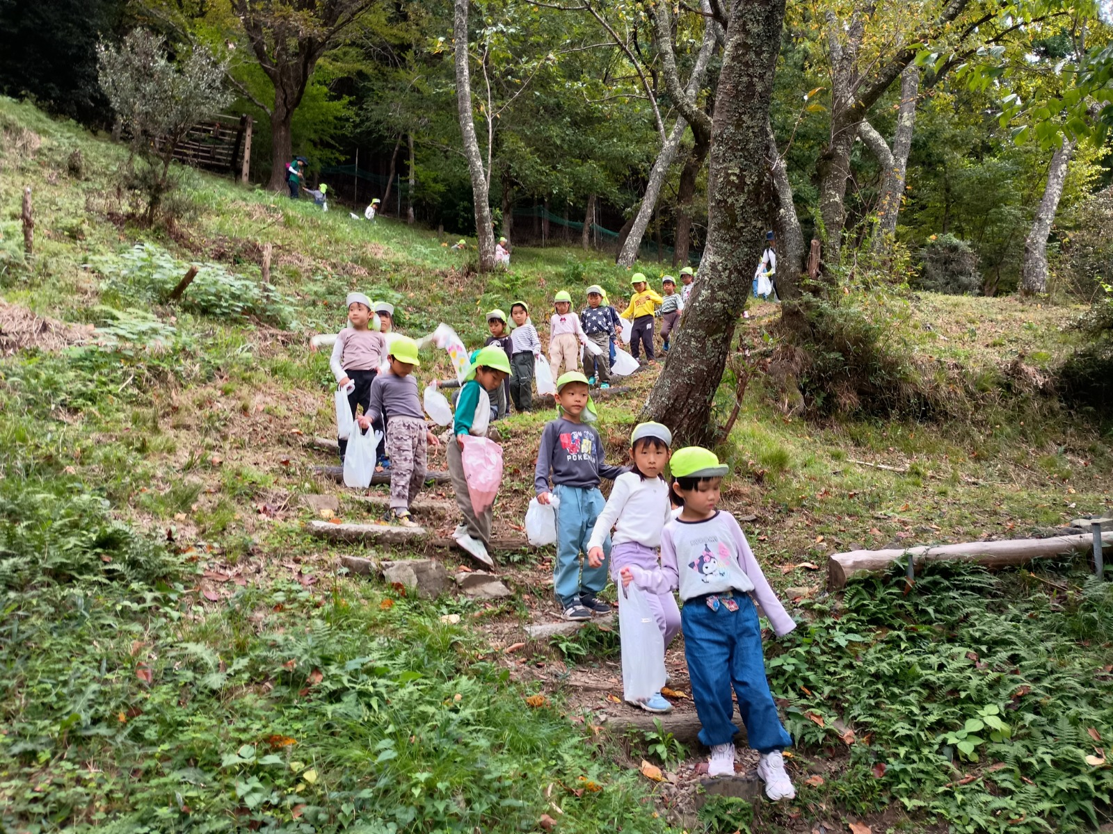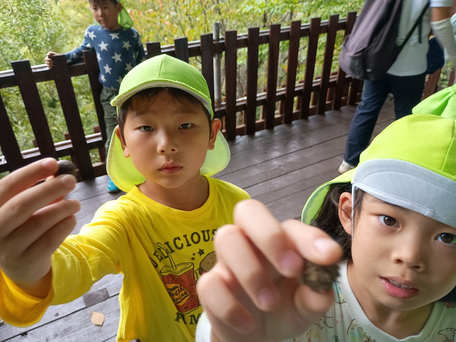 「こんな大きい葉っぱあった!」「この木の実なんやろ?」「大きいどんぐり!」「あっ!山の先生に教えてもらったムクロジ!」等々たくさんお土産を持ち帰ったお友達もいましたよ。