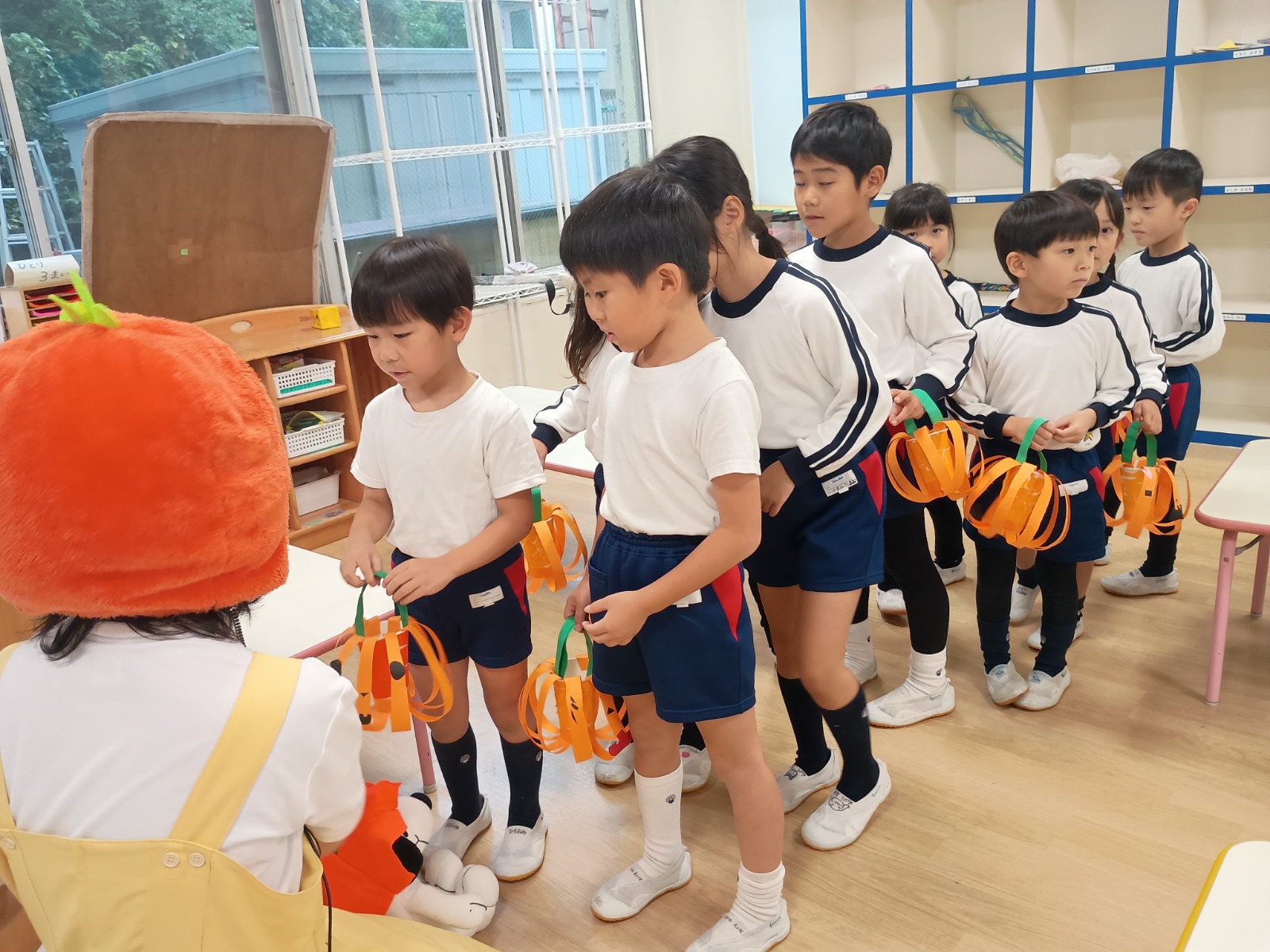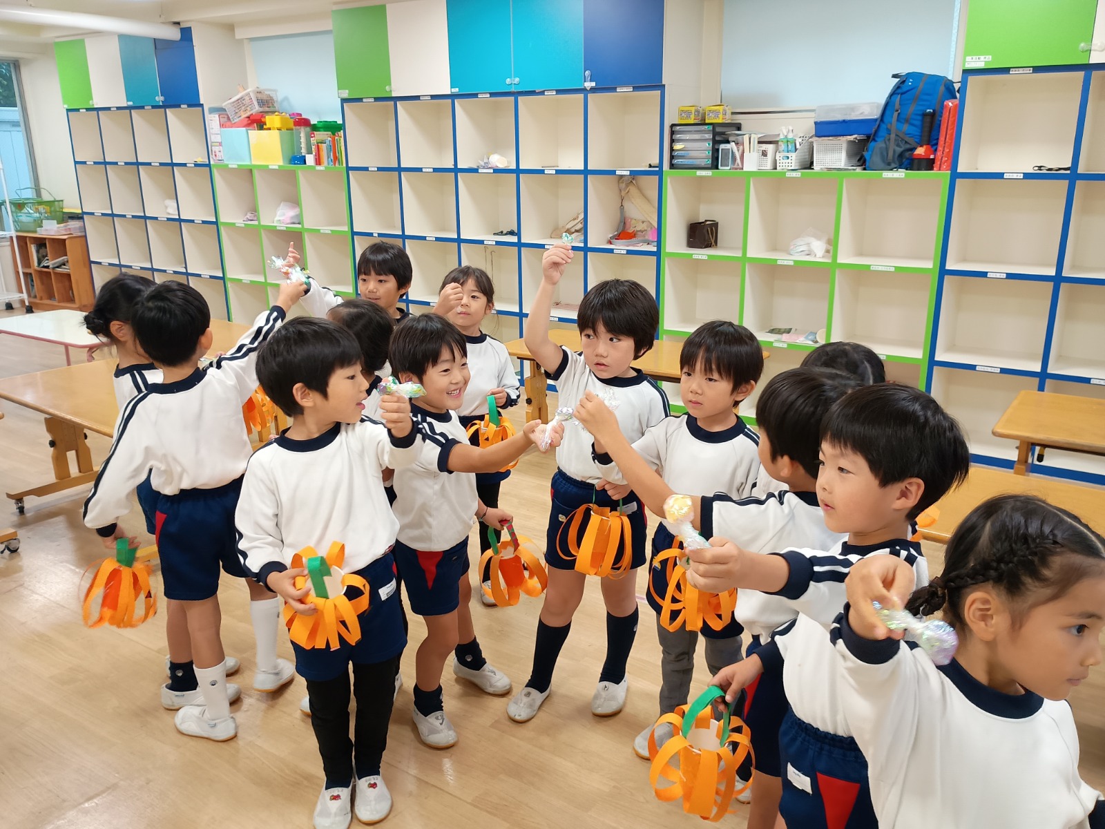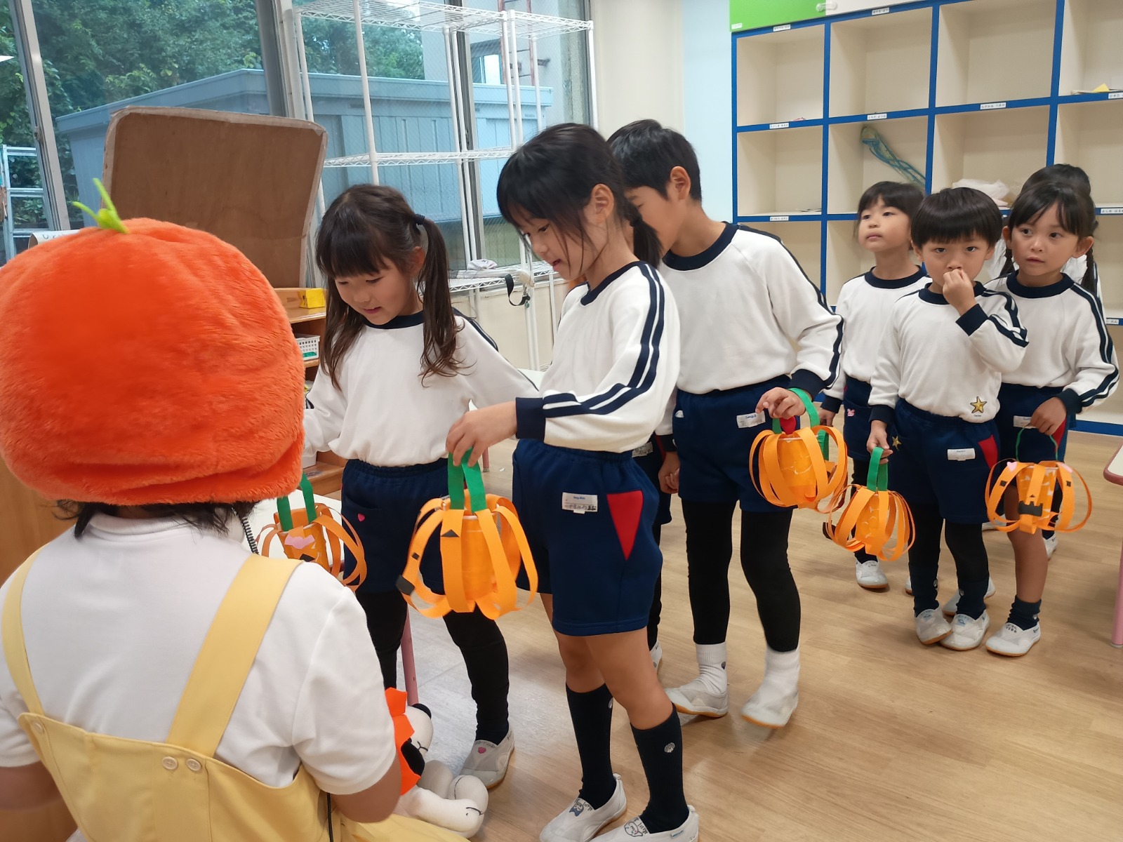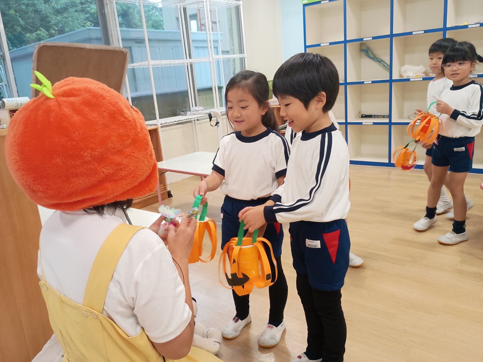 今日はお楽しみ会がありました♪それぞれが作った、カボチャのカバンをもってお遊戯室に集合しましたよ。イングリッシュとプレチームの先生がモンスターに大変身!みんなで楽しいハロウィンダンスを踊りました♪ 「トリックアトリート!」の掛け声に、手作りのおやつをゲットし、大喜びでした~♪ 今日で10月も終わりです。劇発表会や鼓隊の中間発表、作品展など、まだまだ楽しい行事がたくさんあるので、白組さんみんなで盛り上がって取り組みたいと思います♪