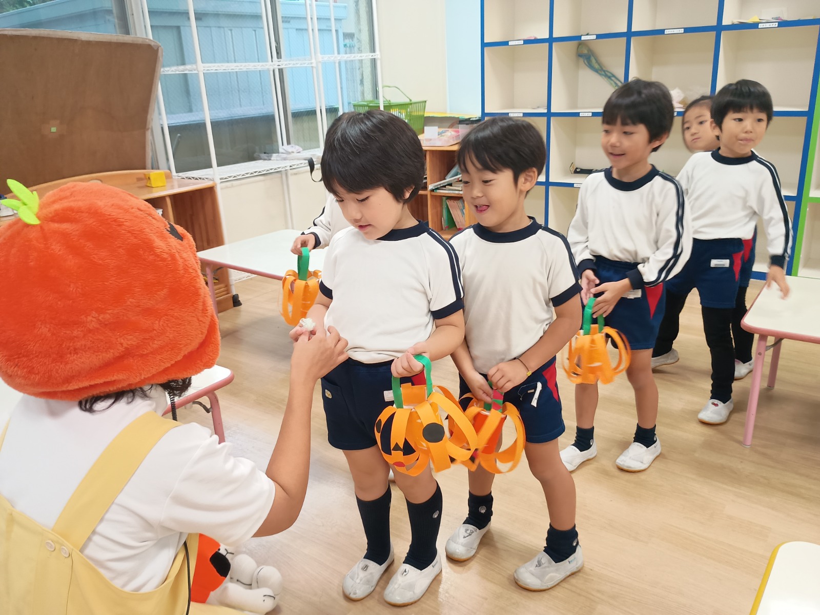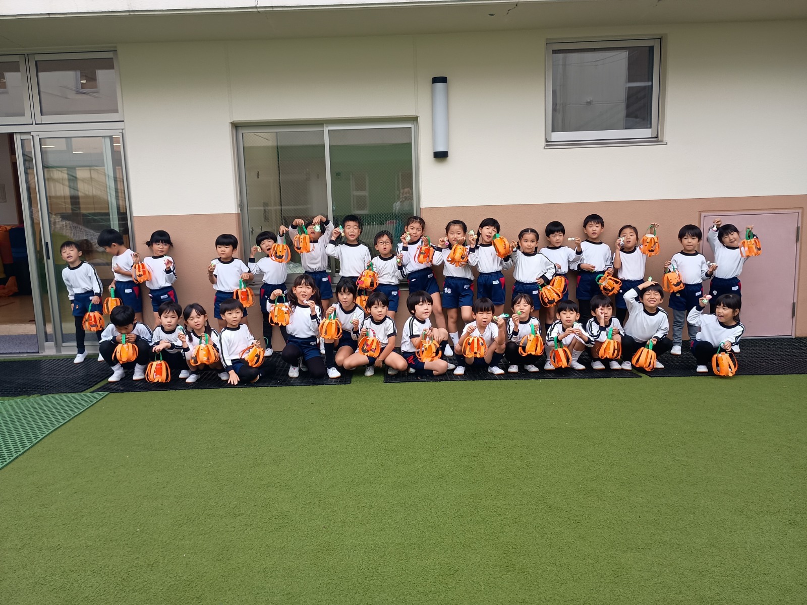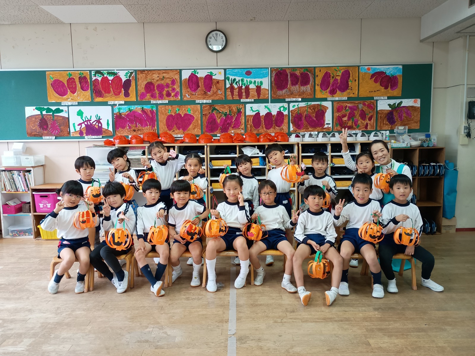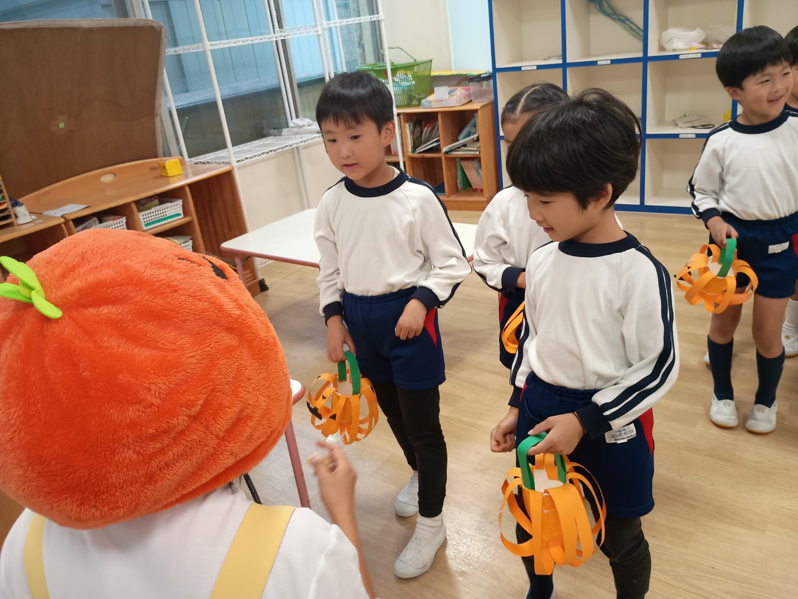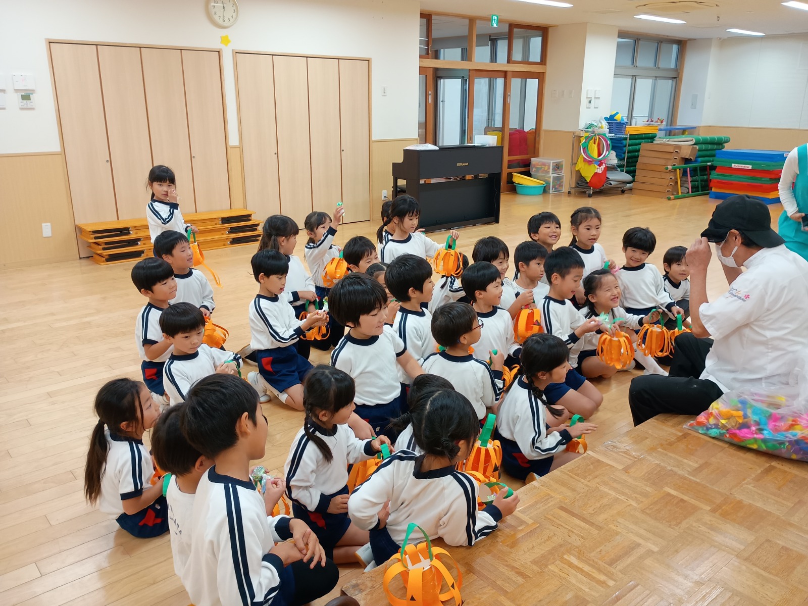 今日はお楽しみ会がありました♪それぞれが作った、カボチャのカバンをもってお遊戯室に集合しましたよ。イングリッシュとプレチームの先生がモンスターに大変身!みんなで楽しいハロウィンダンスを踊りました♪ 「トリックアトリート!」の掛け声に、手作りのおやつをゲットし、大喜びでした~♪ 今日で10月も終わりです。劇発表会や鼓隊の中間発表、作品展など、まだまだ楽しい行事がたくさんあるので、白組さんみんなで盛り上がって取り組みたいと思います♪