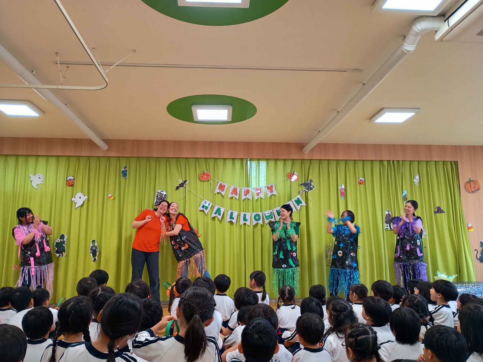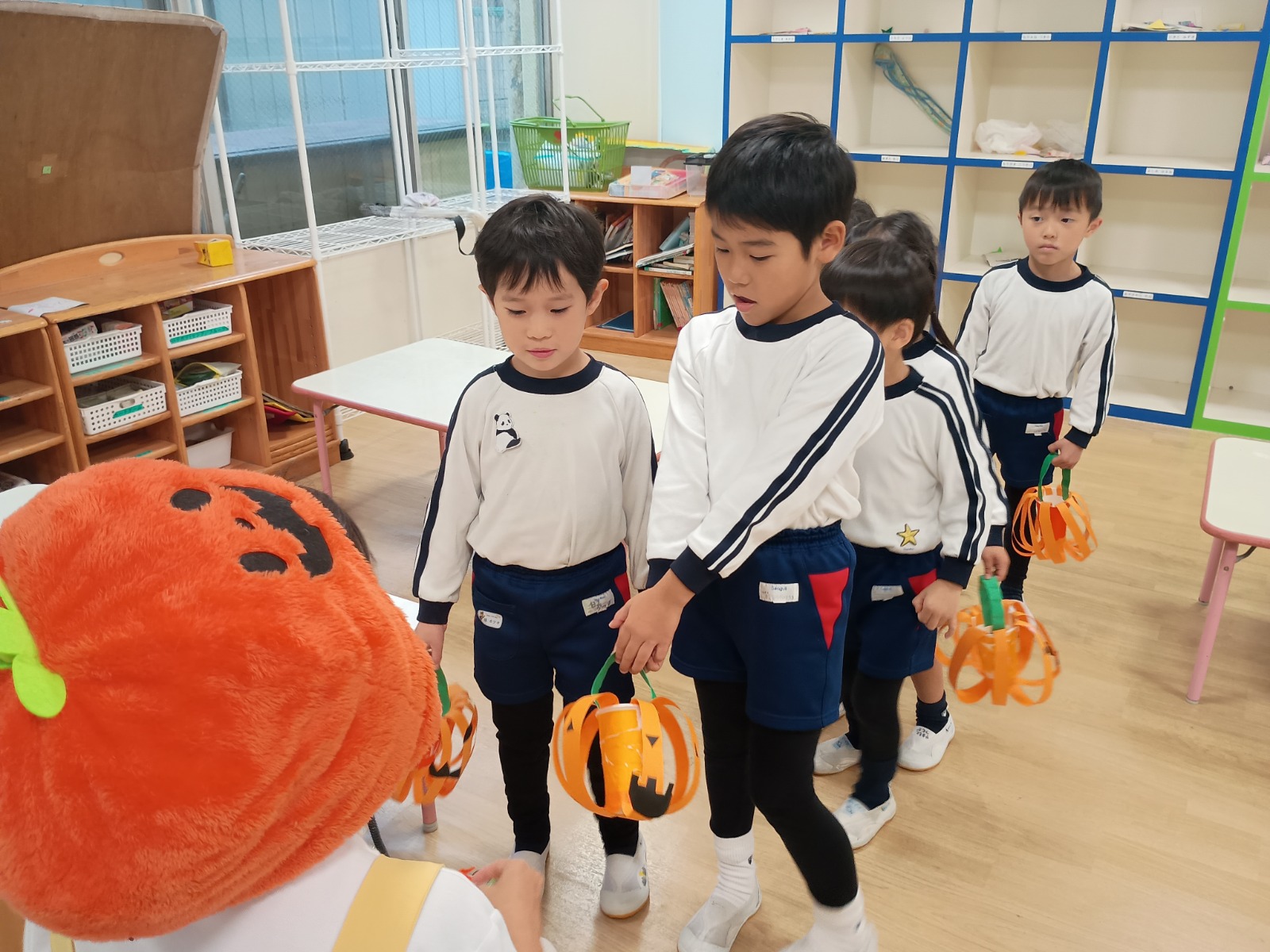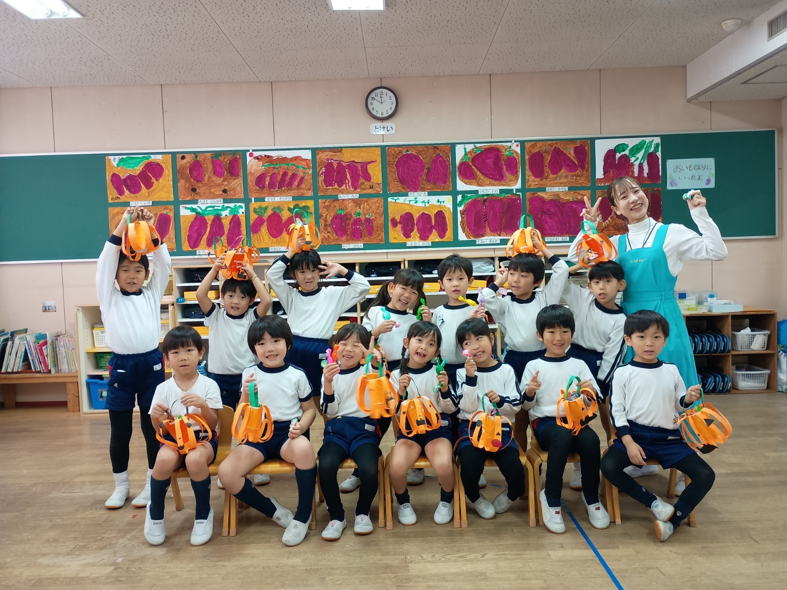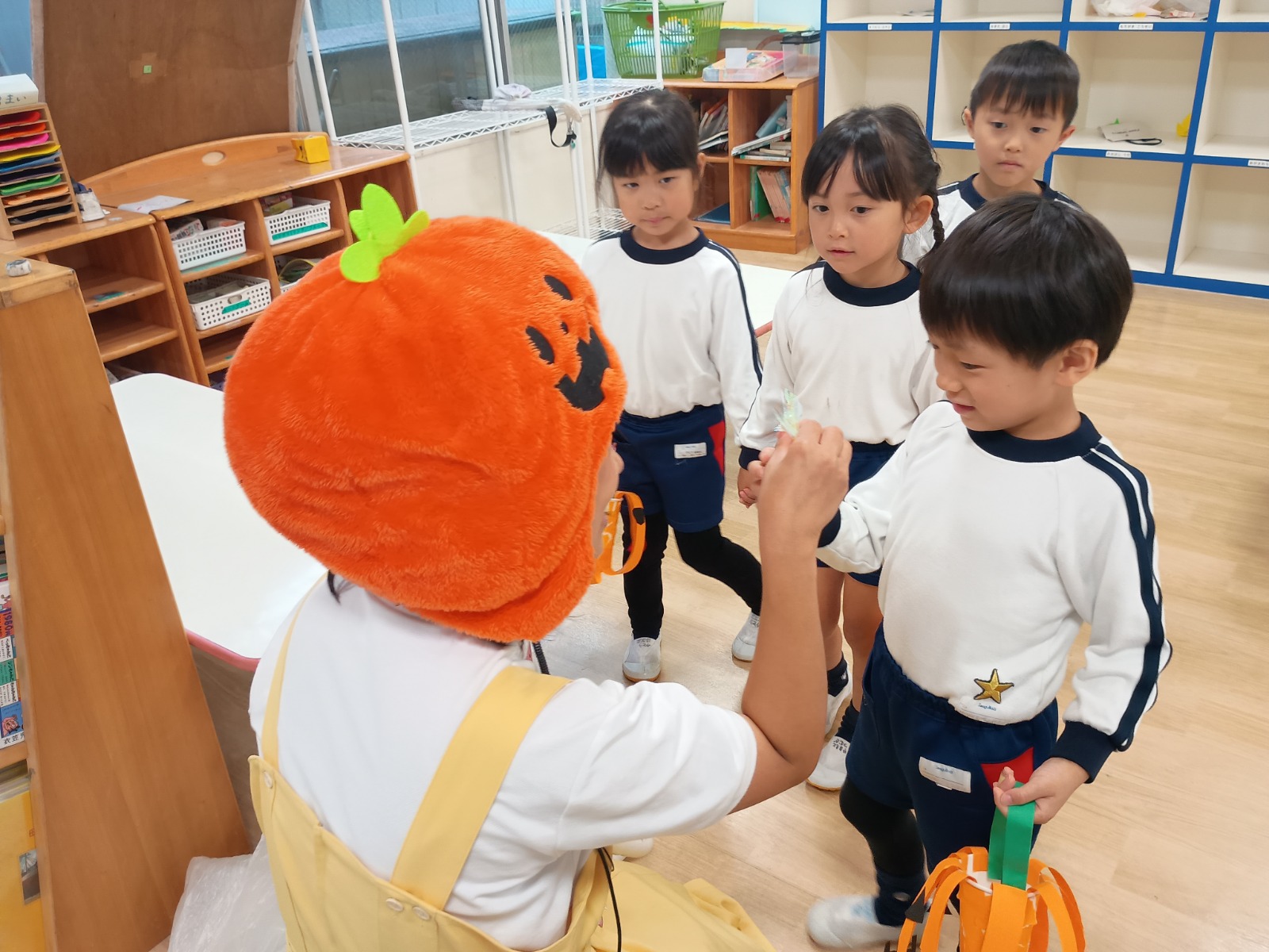 今日はお楽しみ会がありました♪それぞれが作った、カボチャのカバンをもってお遊戯室に集合しましたよ。イングリッシュとプレチームの先生がモンスターに大変身!みんなで楽しいハロウィンダンスを踊りました♪ 「トリックアトリート!」の掛け声に、手作りのおやつをゲットし、大喜びでした~♪ 今日で10月も終わりです。劇発表会や鼓隊の中間発表、作品展など、まだまだ楽しい行事がたくさんあるので、白組さんみんなで盛り上がって取り組みたいと思います♪
