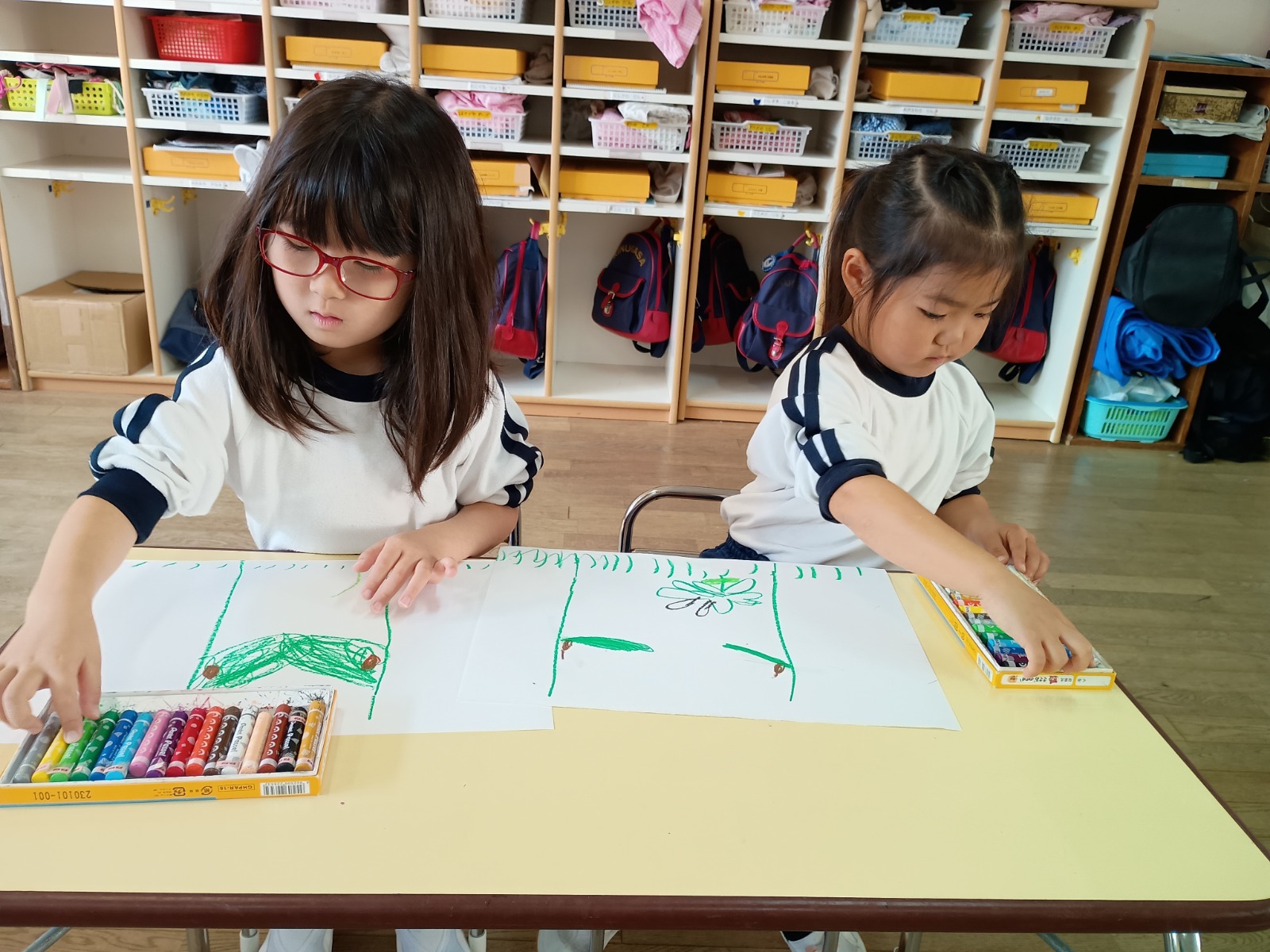 そして数日後、みんなでクレパスを使いベッドを描きました。絵画の時間は黙々と集中して描き、個性のつまったベッドができあがりましたよ。お話に出てくる虫も、特徴を捉えて細かく描くお友達がおり、驚きました。まだまだ劇遊びは始まったばかりです。お話をもっと好きになってもらえるよう、いろんなしかけを考えたいと思います^ ^