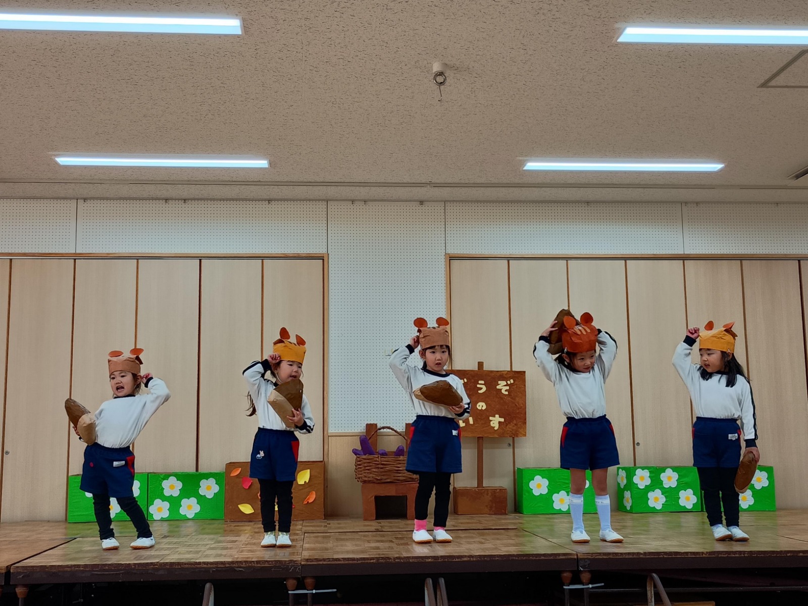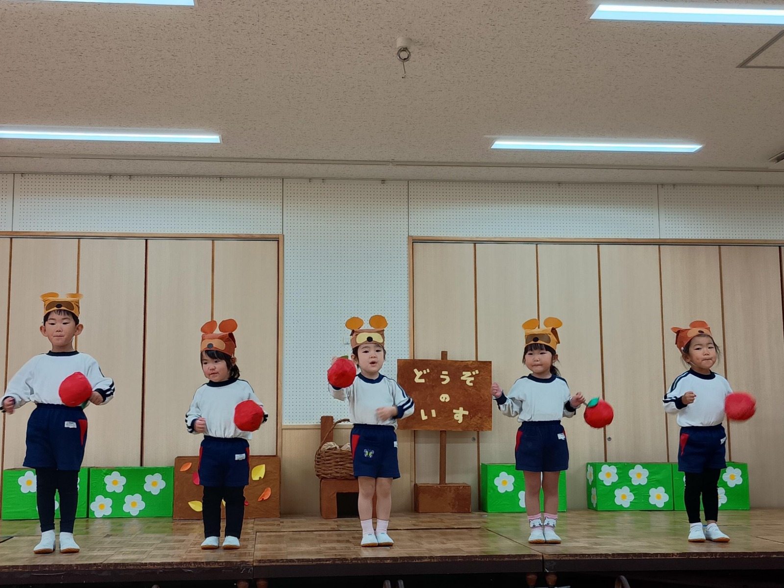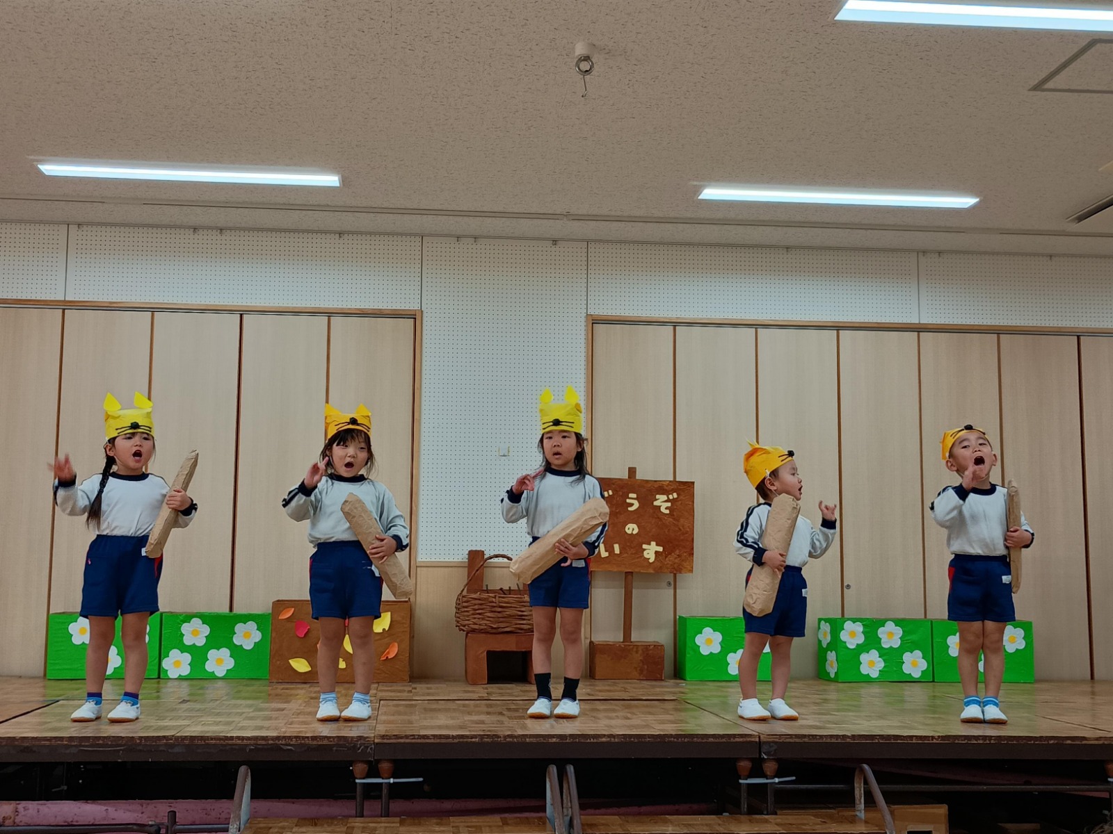 「どうぞのいす」を題材にさまざまな動物になりきり、歌、ダンス、セリフを頑張っています。