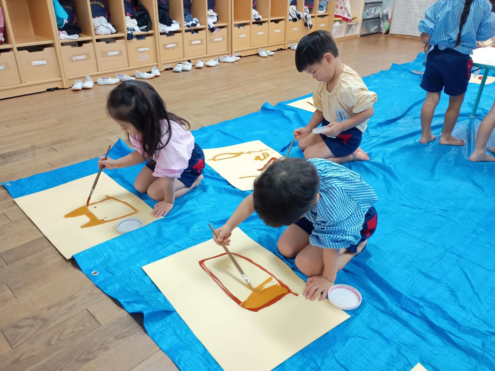 うさぎが作って椅子を絵の具で描いて、動物たちや食べ物をクレパスで描きましたよ!