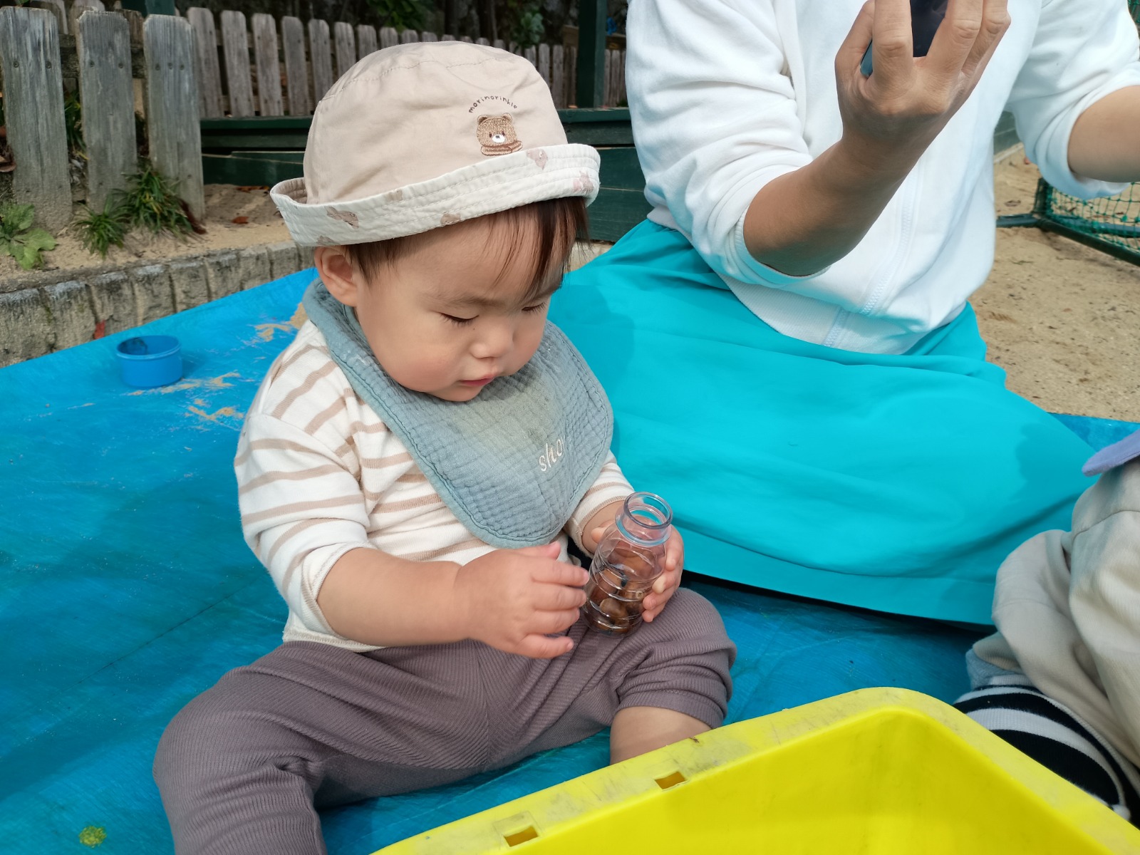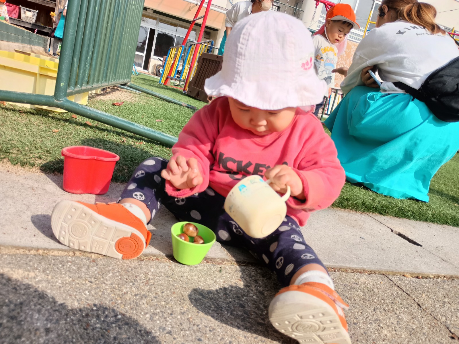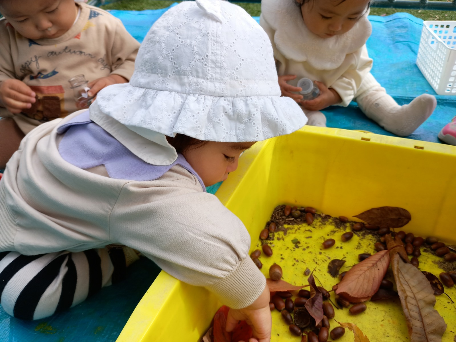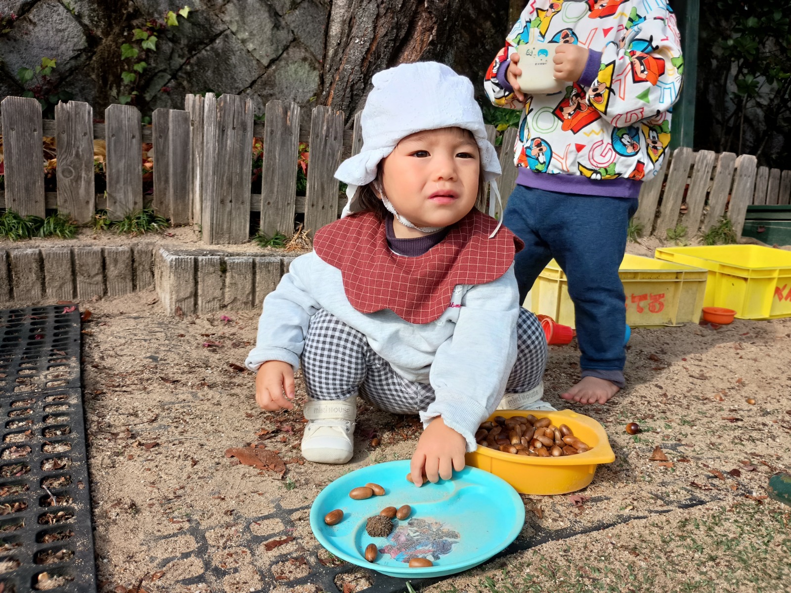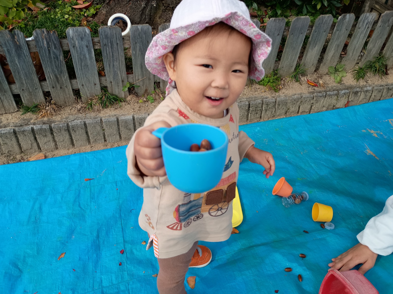 タライいっぱいに入ったどんぐりに興味津々の子どもたち!カップに入れてマラカスのように振って音がカラカラ鳴るのを楽しんだり、お皿にたくさん盛り付けてお料理のようにしたりと夢中になって遊んでいました(^^)