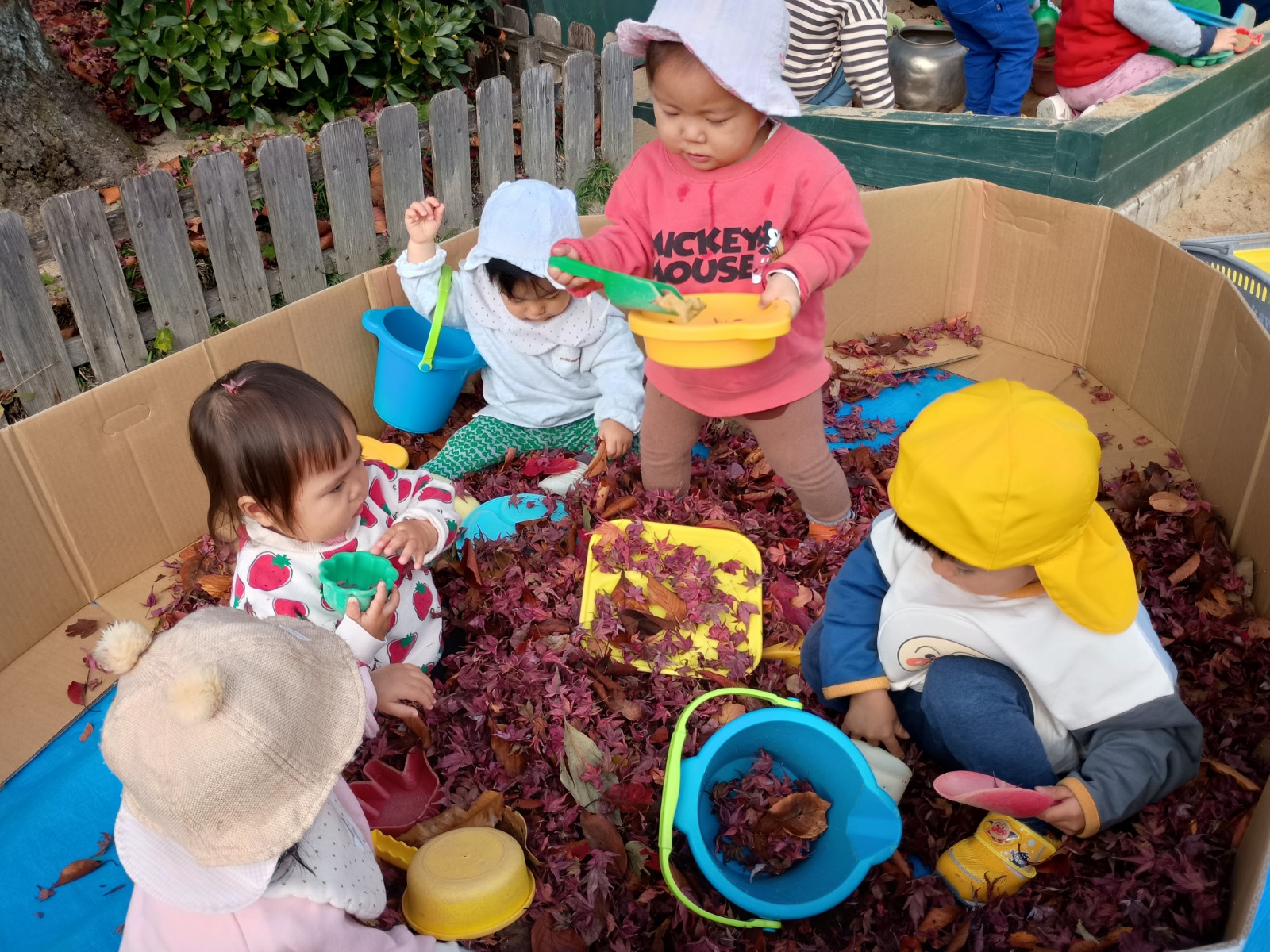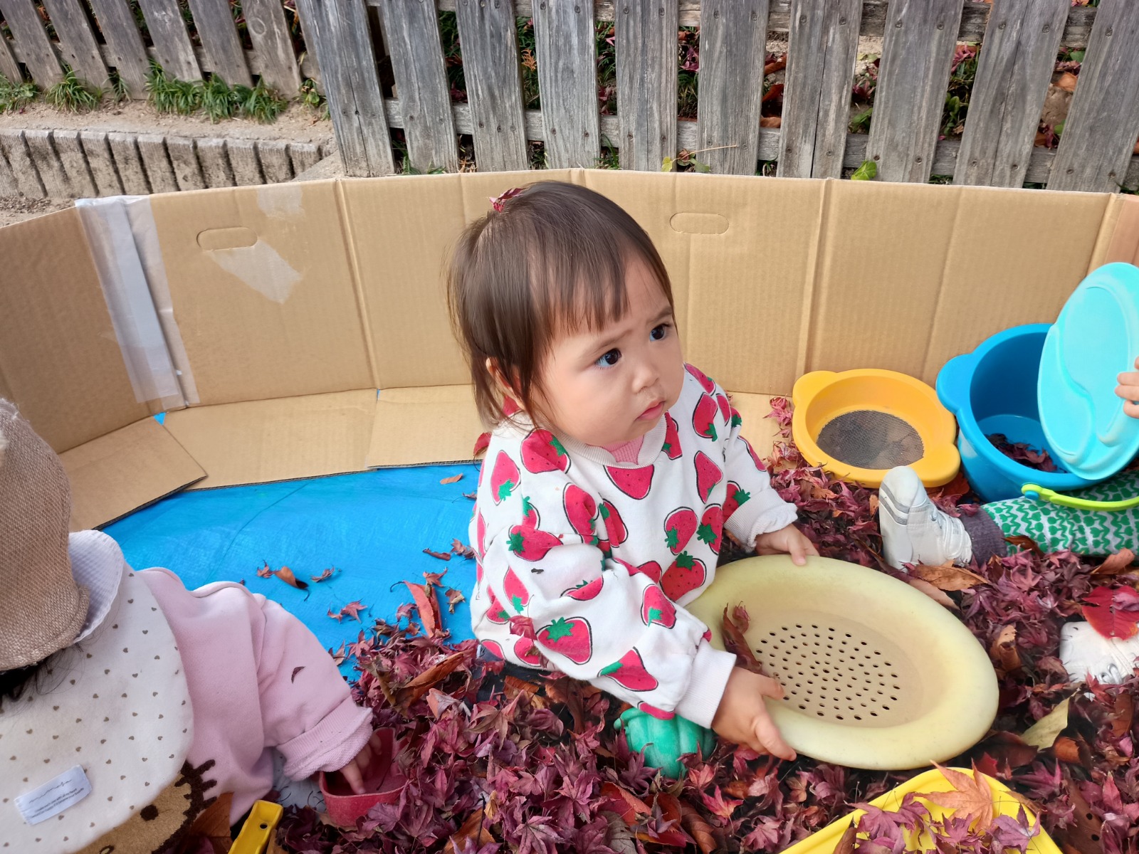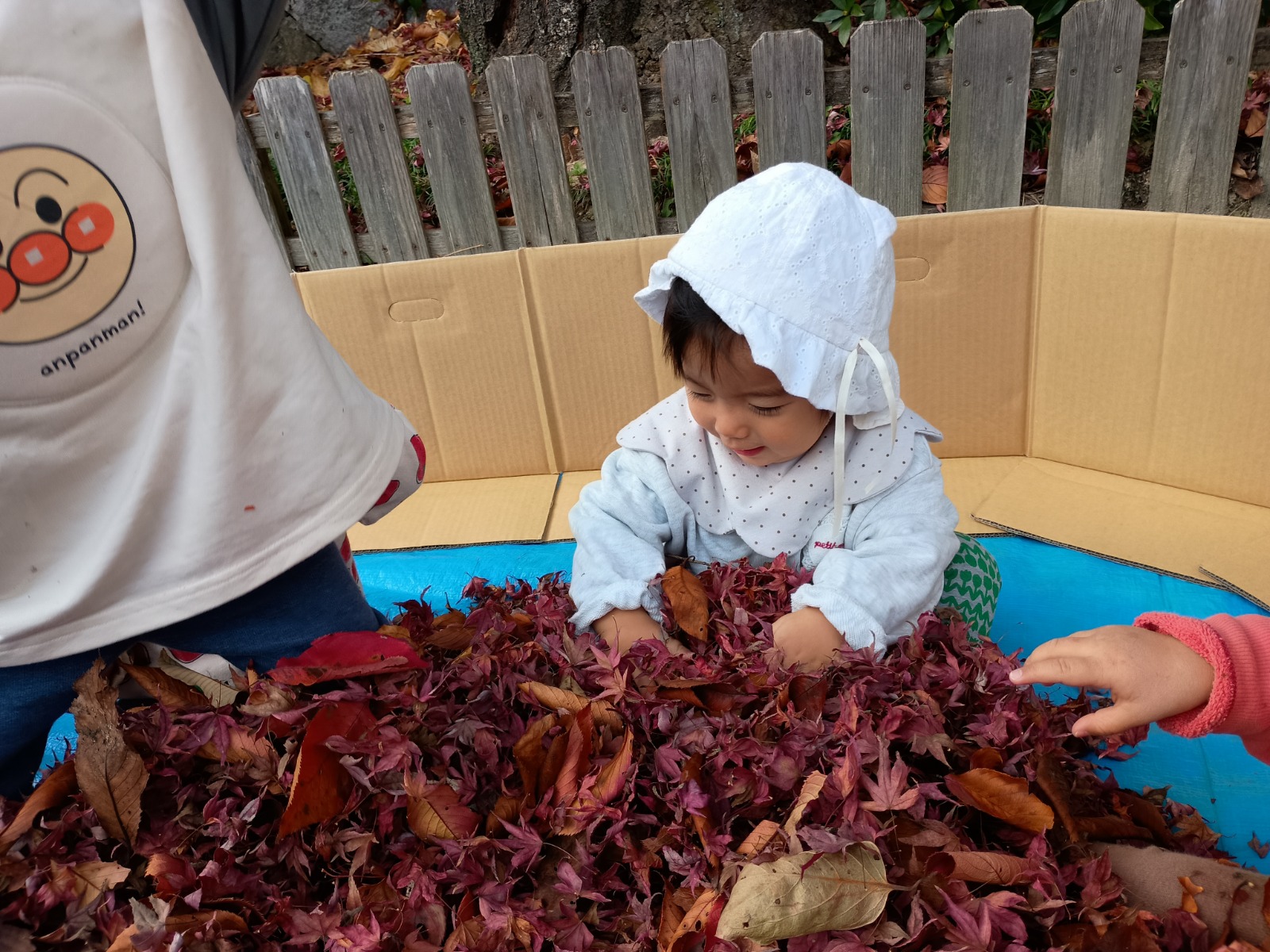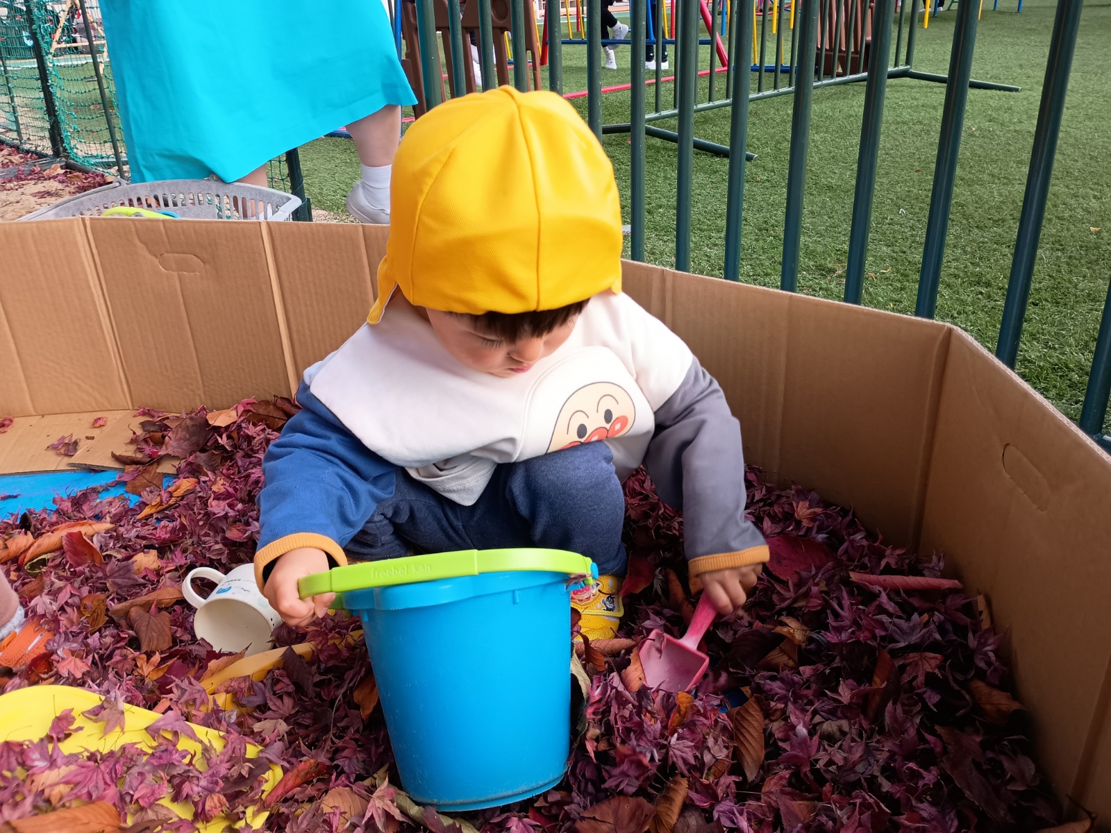 また赤や黄色に色づいた紅葉や落ち葉をたくさん敷き詰めて落ち葉プールを作り、その中に入って遊びました!落ち葉がカサカサと鳴るのを楽しみながら、手でかき分けたり、握ったり、砂場用の玩具に集めたりしていましたよ♪