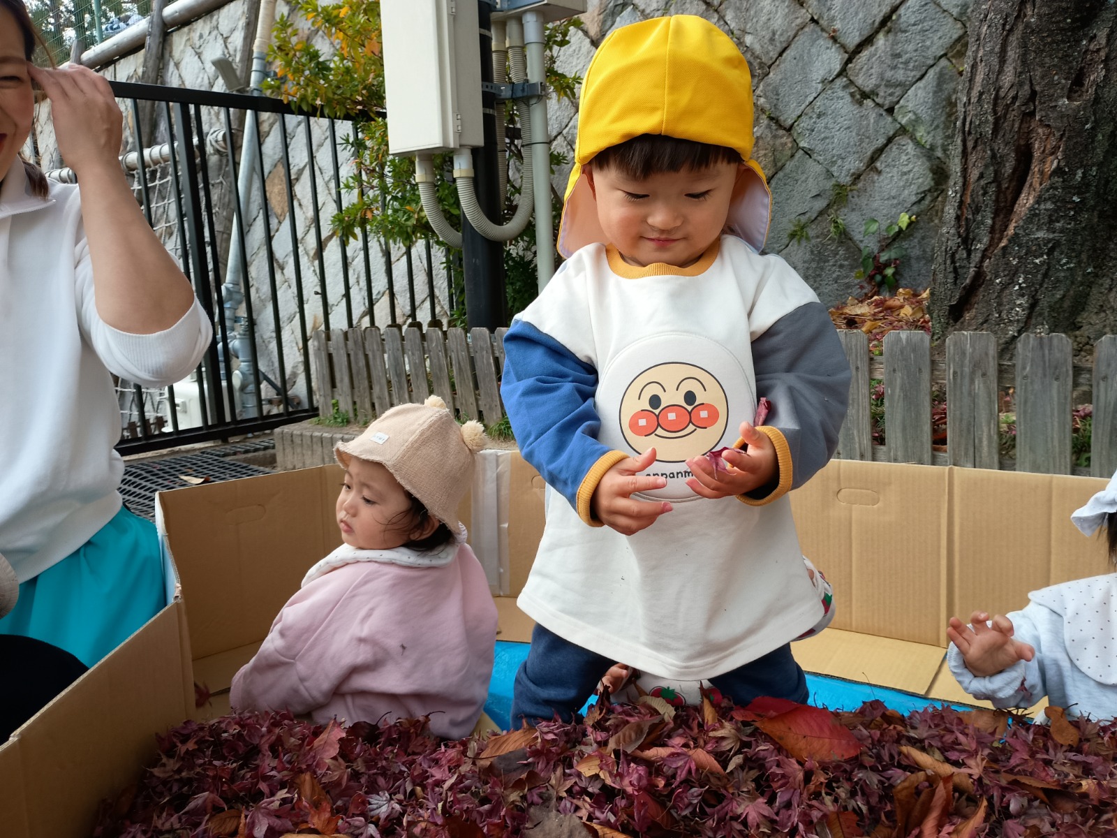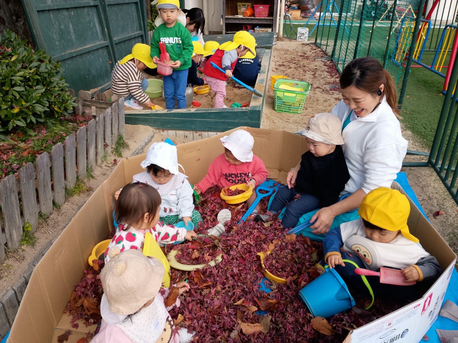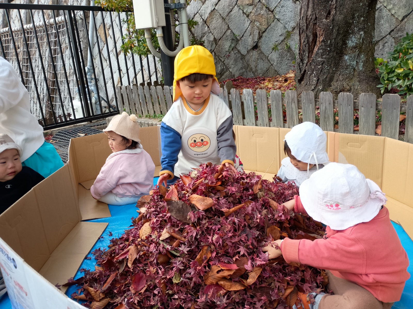 また赤や黄色に色づいた紅葉や落ち葉をたくさん敷き詰めて落ち葉プールを作り、その中に入って遊びました!落ち葉がカサカサと鳴るのを楽しみながら、手でかき分けたり、握ったり、砂場用の玩具に集めたりしていましたよ♪