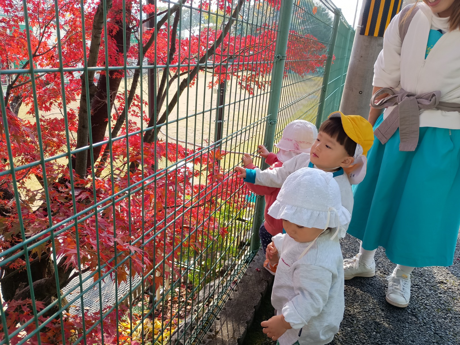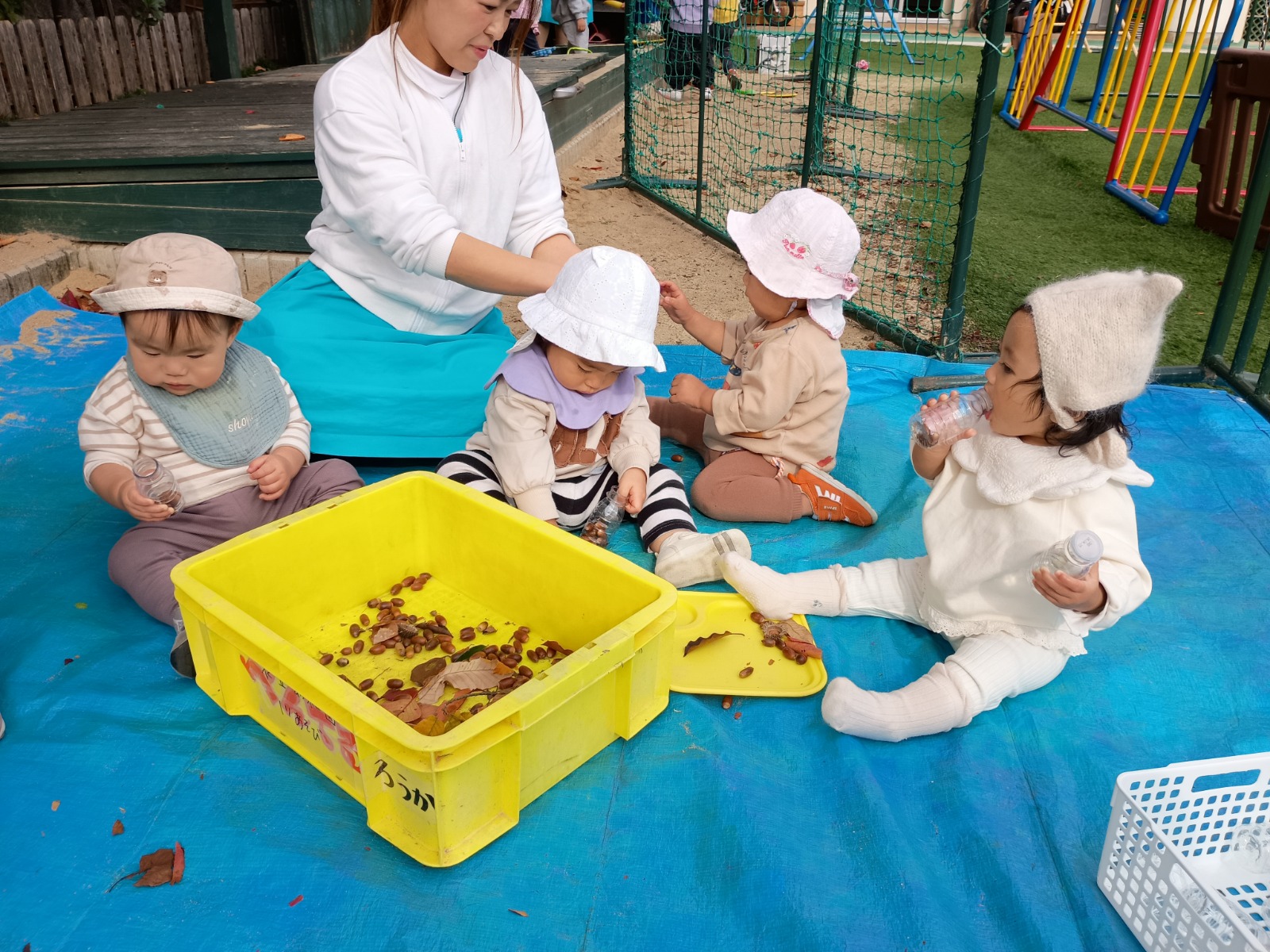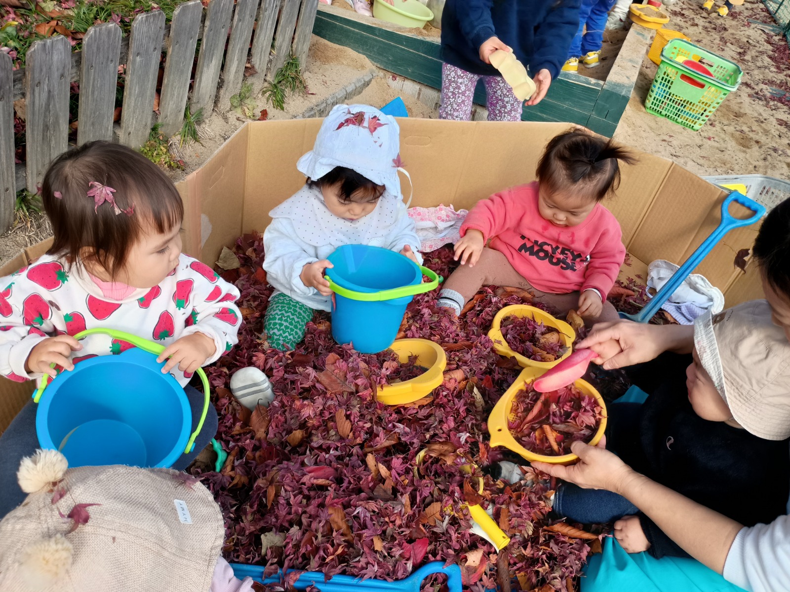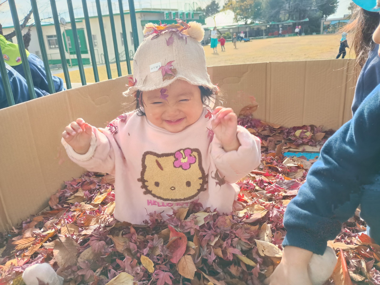 また赤や黄色に色づいた紅葉や落ち葉をたくさん敷き詰めて落ち葉プールを作り、その中に入って遊びました!落ち葉がカサカサと鳴るのを楽しみながら、手でかき分けたり、握ったり、砂場用の玩具に集めたりしていましたよ♪