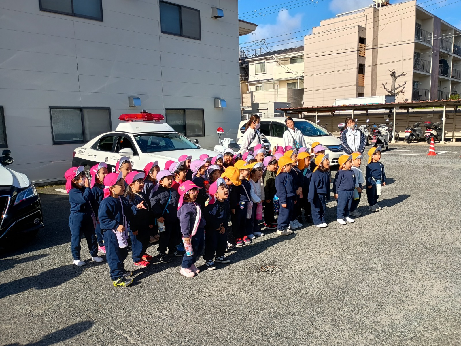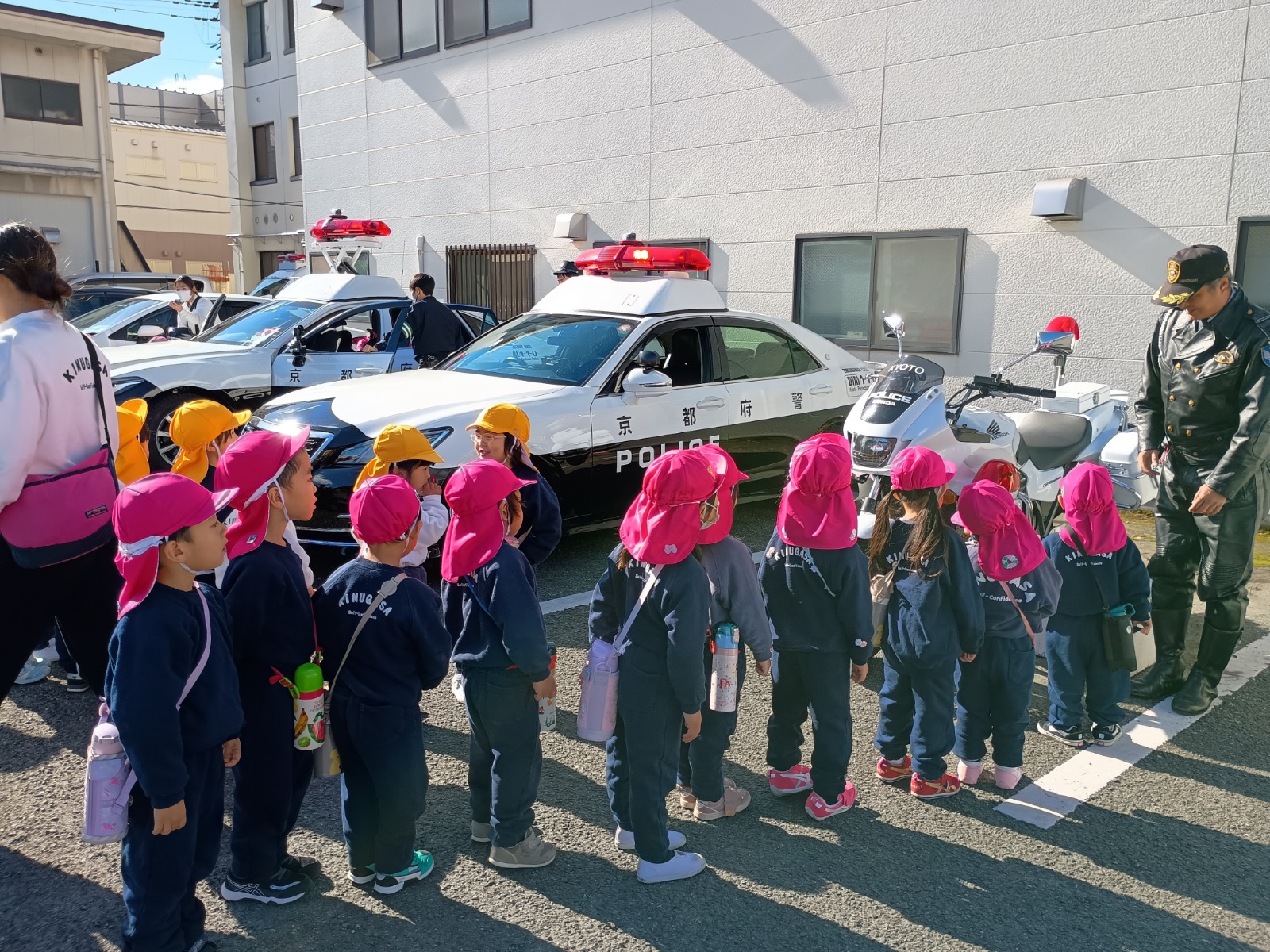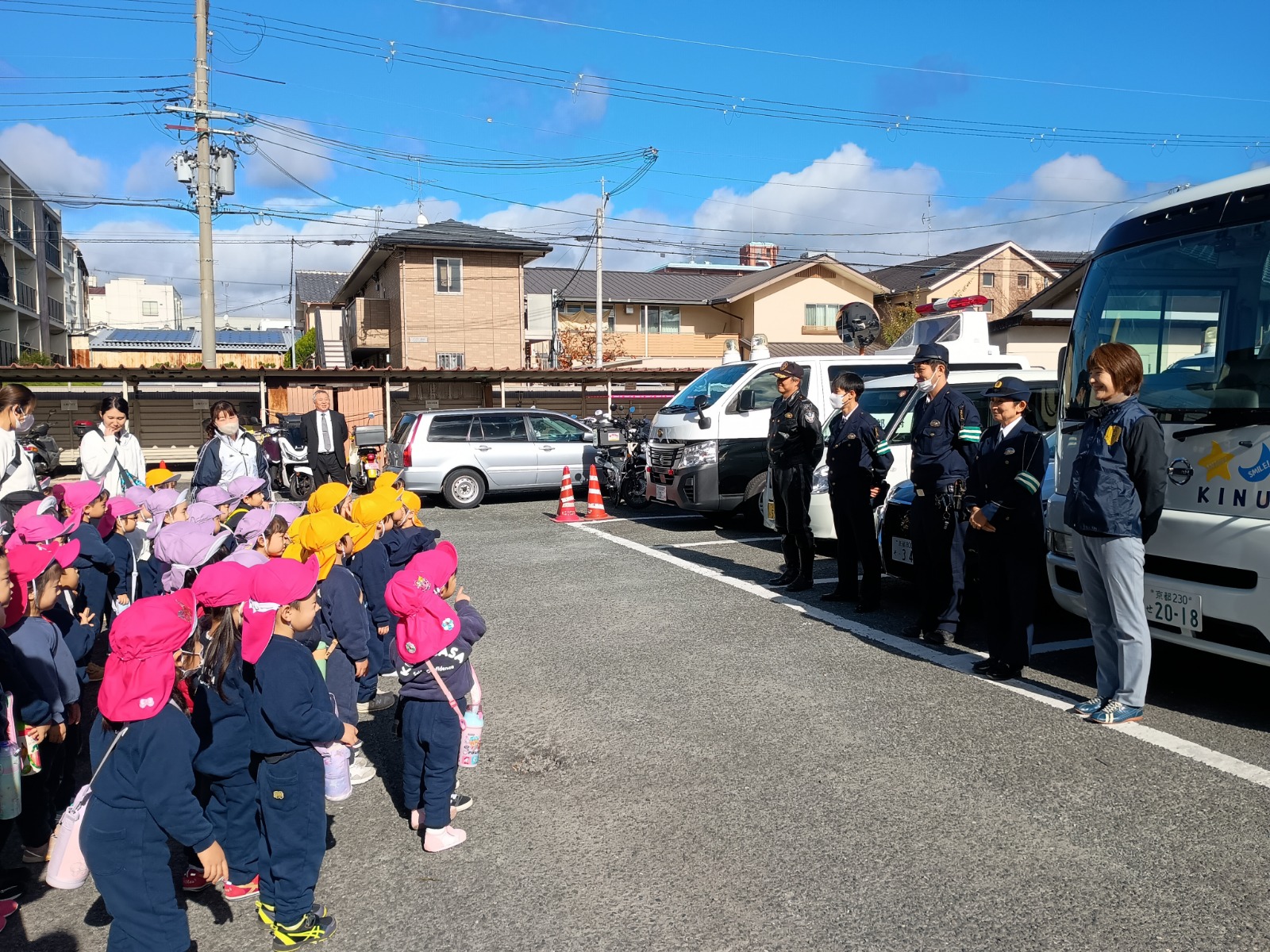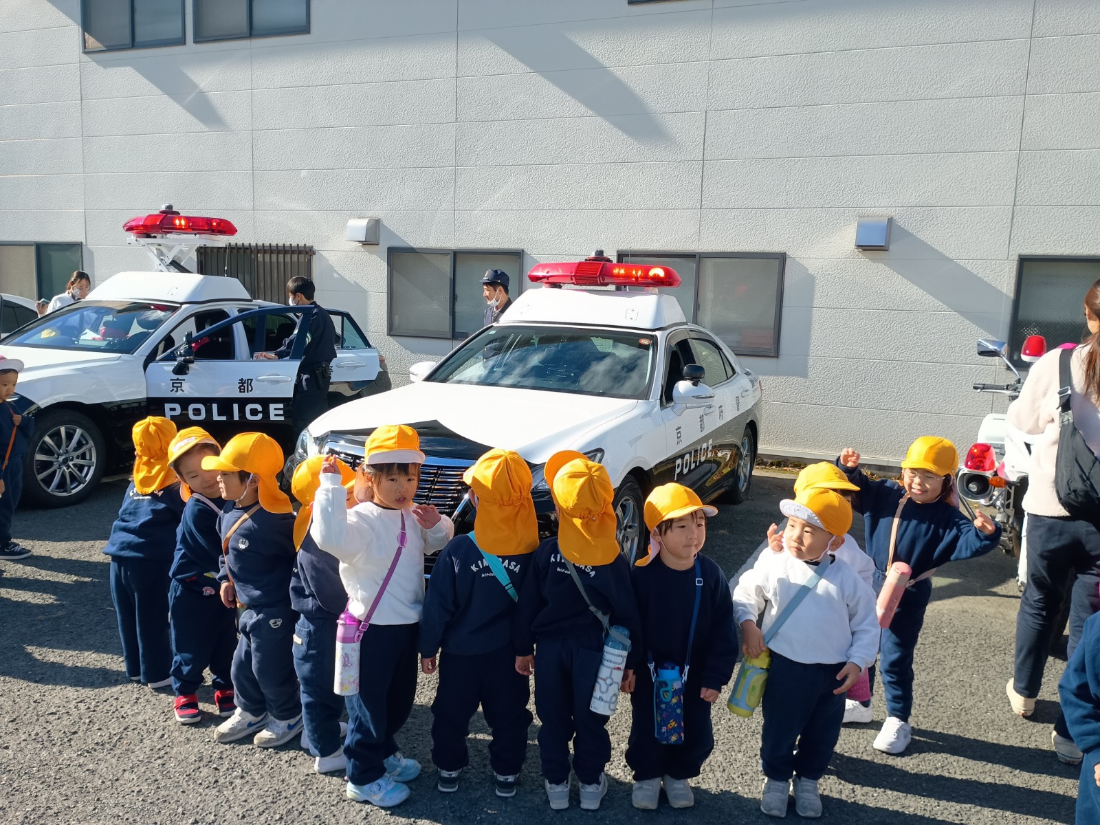 木の葉が赤や黄色に染まり、冷たい北風がびゅーっと吹いてきたら、もうすっかり晩秋。 冬がすぐそこまできていることを知る子どもたちです。 今は衣笠まつりに向けて、制作や絵画を楽しんでいます。 また、最近では、園外保育で、北警察署に行ってきました。 交通ルールのお話を聞いた後、白バイとパトカーに乗せてもらいました。 みんな大喜びでした。 緑組