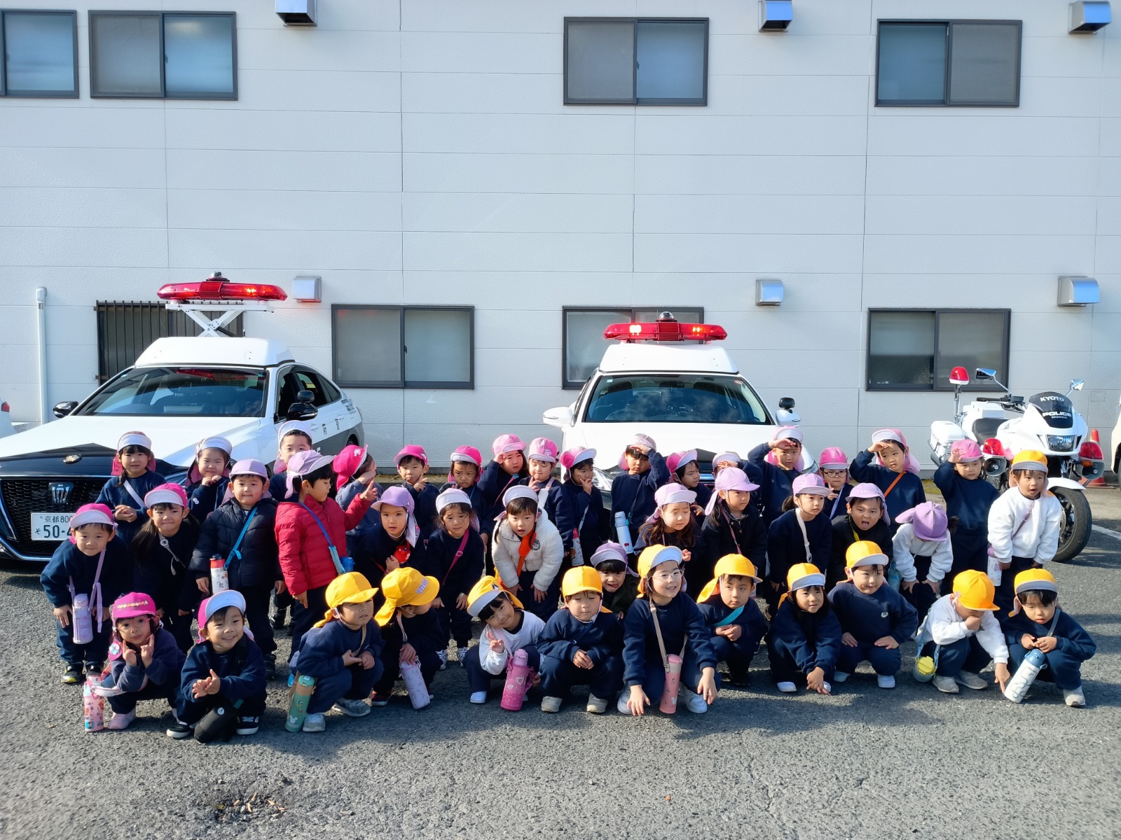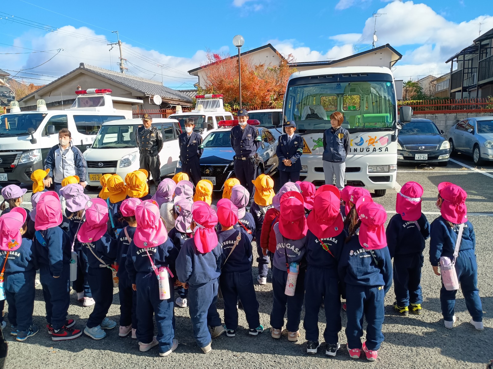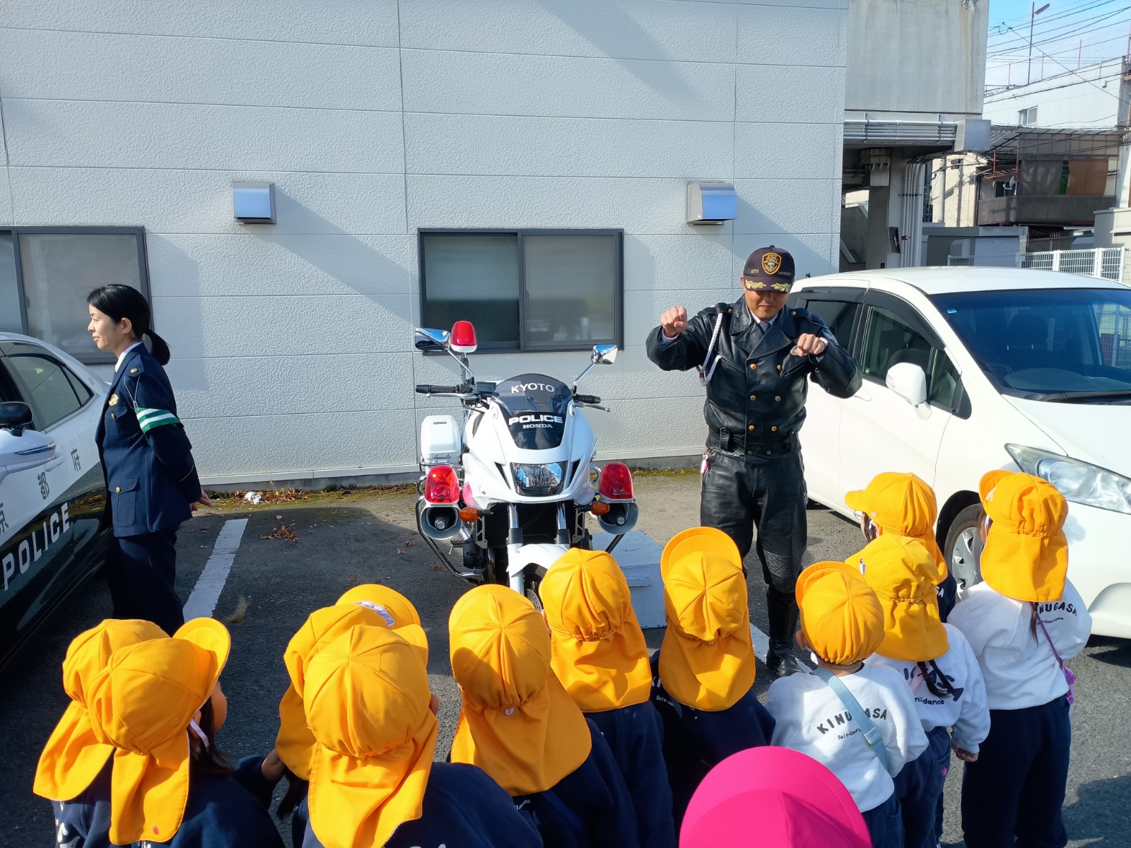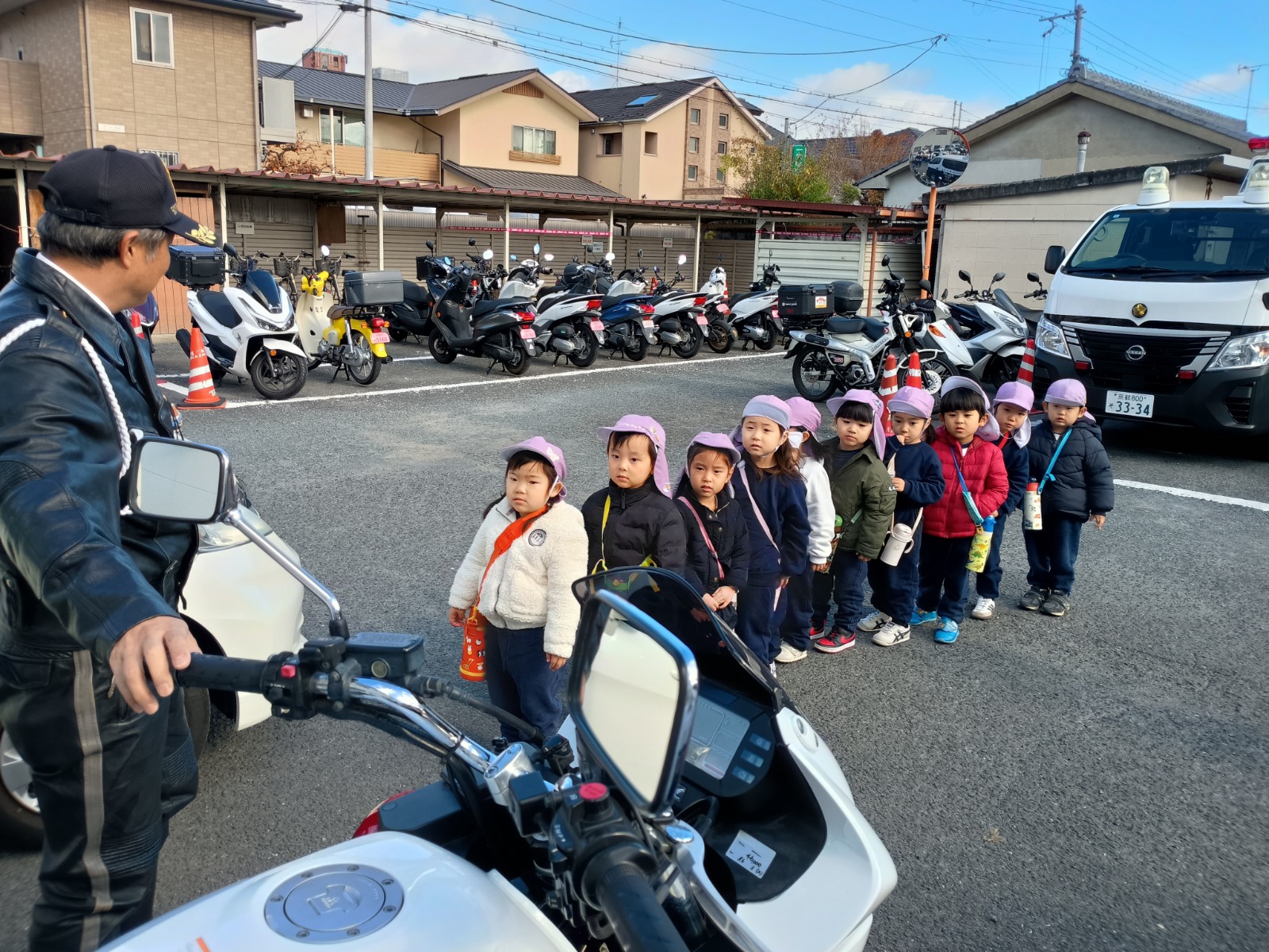 木の葉が赤や黄色に染まり、冷たい北風がびゅーっと吹いてきたら、もうすっかり晩秋。 冬がすぐそこまできていることを知る子どもたちです。 今は衣笠まつりに向けて、制作や絵画を楽しんでいます。 また、最近では、園外保育で、北警察署に行ってきました。 交通ルールのお話を聞いた後、白バイとパトカーに乗せてもらいました。 みんな大喜びでした。 緑組