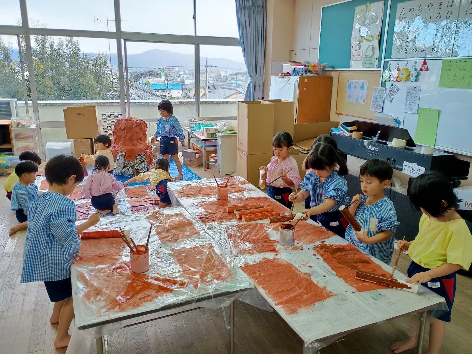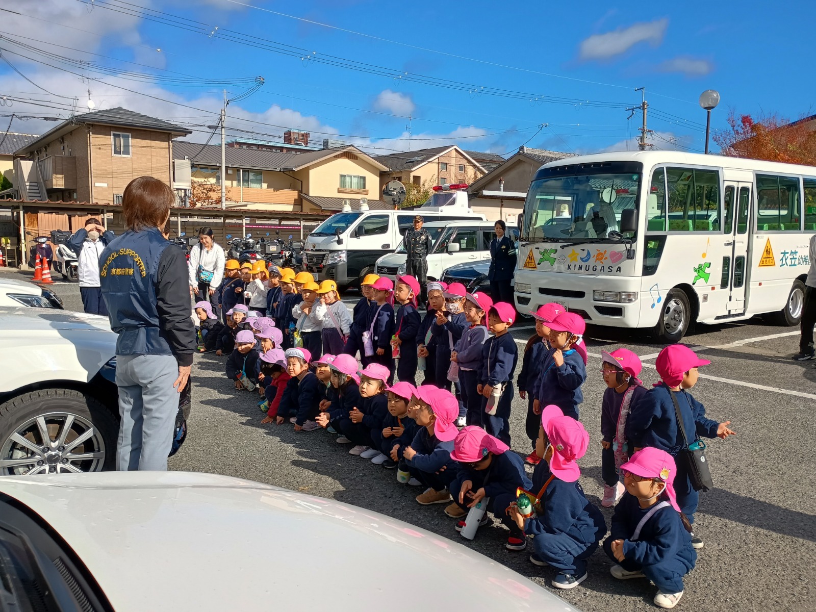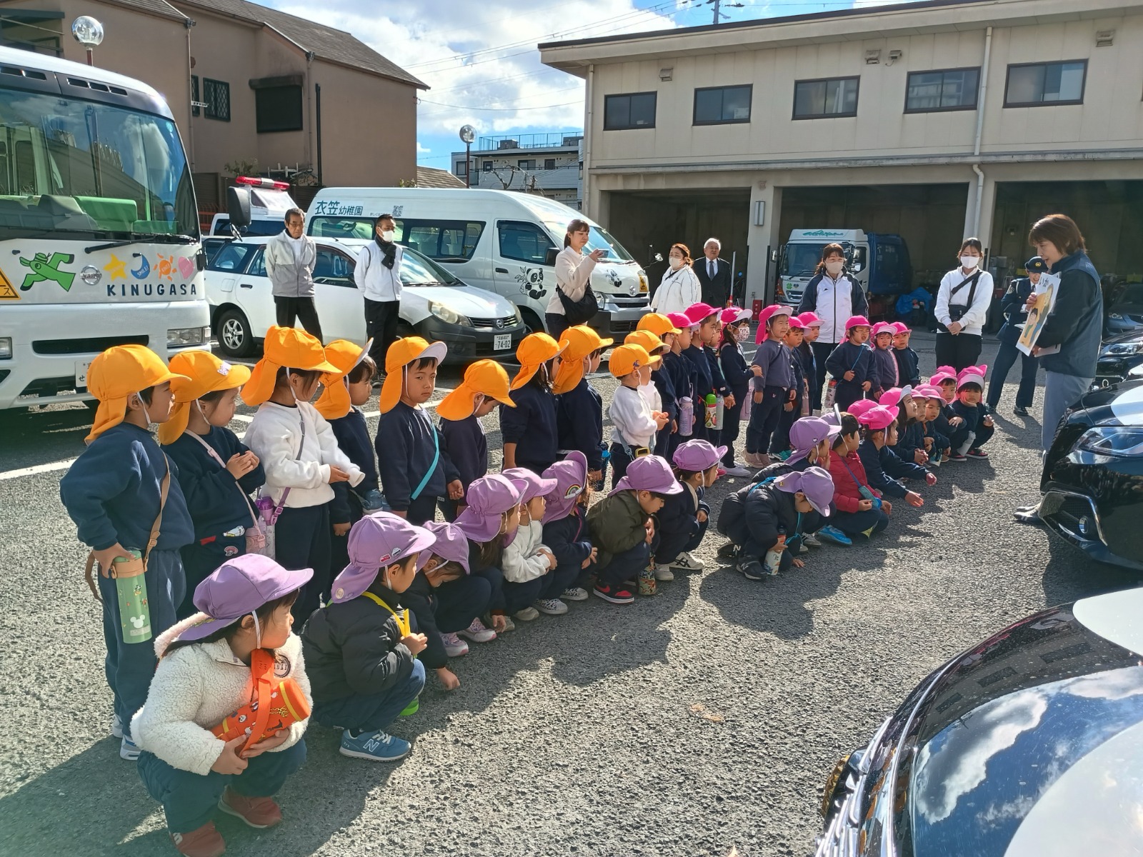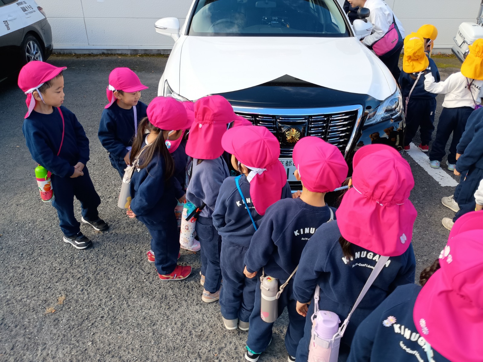 木の葉が赤や黄色に染まり、冷たい北風がびゅーっと吹いてきたら、もうすっかり晩秋。 冬がすぐそこまできていることを知る子どもたちです。 今は衣笠まつりに向けて、制作や絵画を楽しんでいます。 また、最近では、園外保育で、北警察署に行ってきました。 交通ルールのお話を聞いた後、白バイとパトカーに乗せてもらいました。 みんな大喜びでした。 緑組