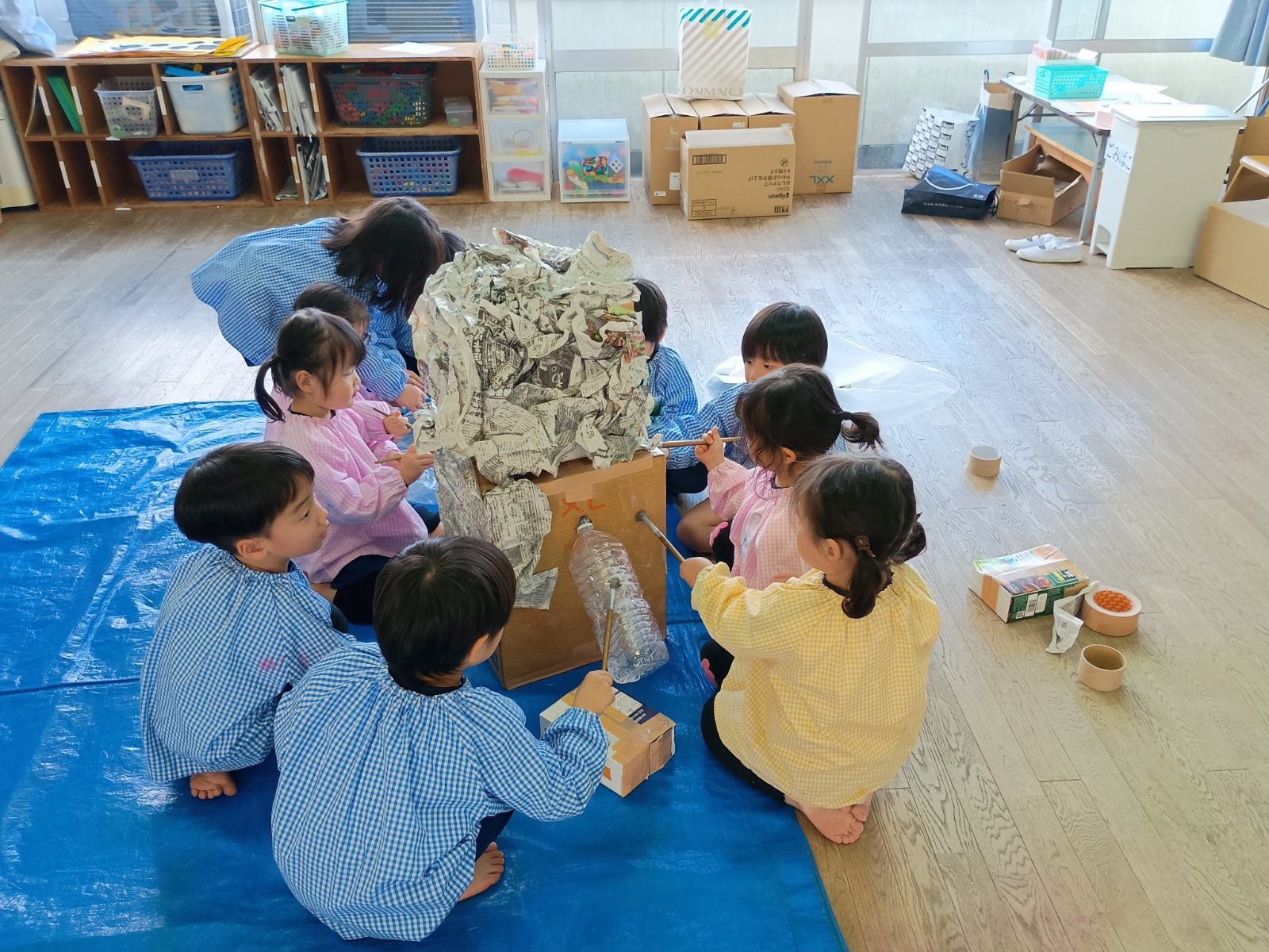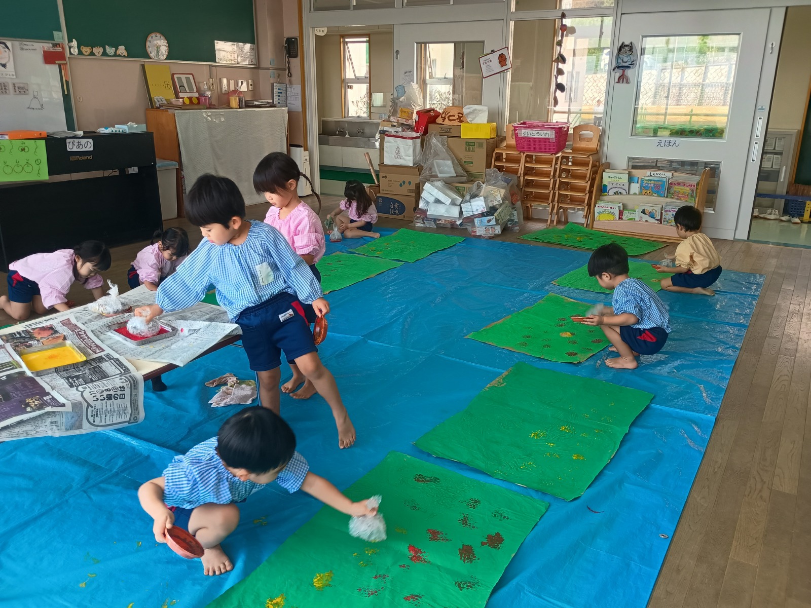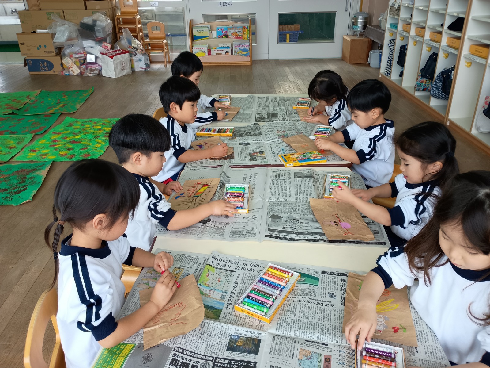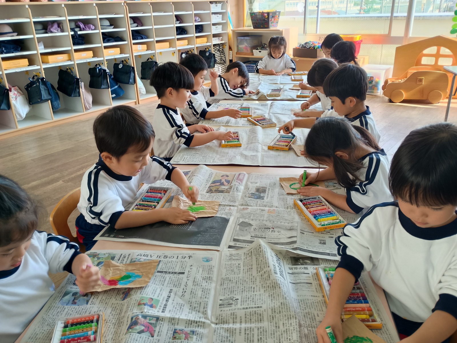 木の葉が赤や黄色に染まり、冷たい北風がびゅーっと吹いてきたら、もうすっかり晩秋。 冬がすぐそこまできていることを知る子どもたちです。 今は衣笠まつりに向けて、制作や絵画を楽しんでいます。 また、最近では、園外保育で、北警察署に行ってきました。 交通ルールのお話を聞いた後、白バイとパトカーに乗せてもらいました。 みんな大喜びでした。 緑組