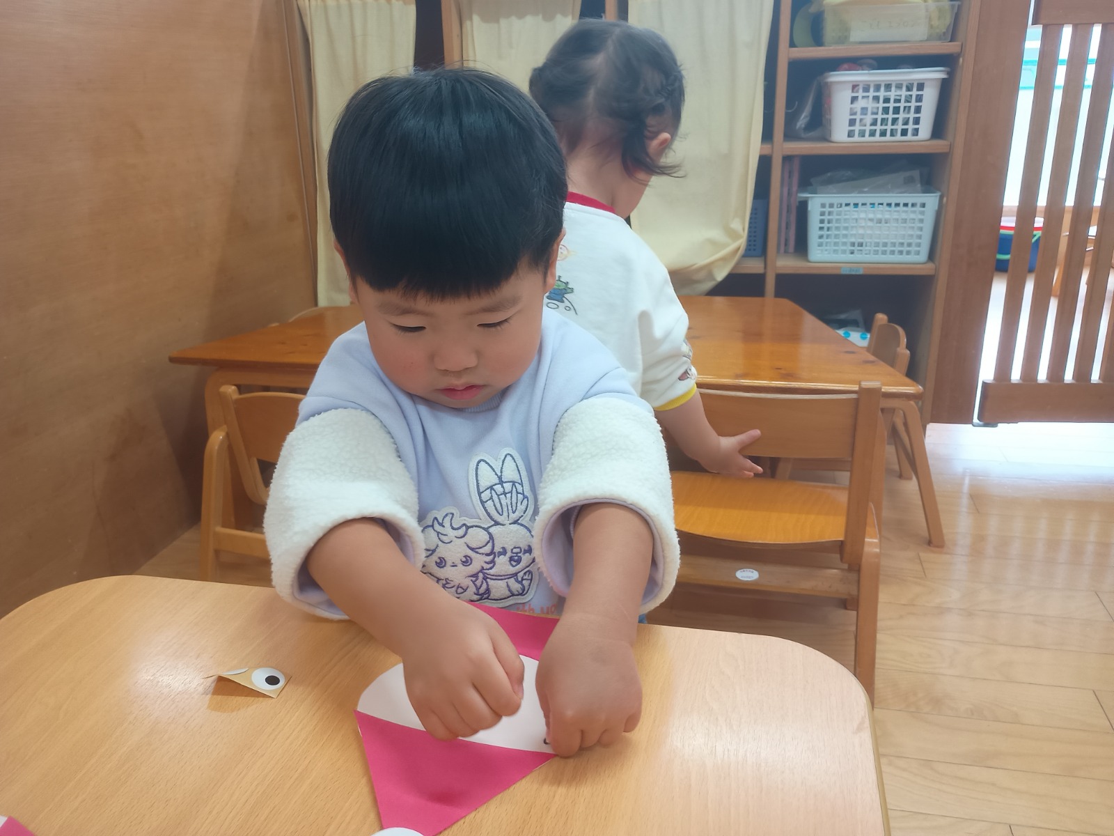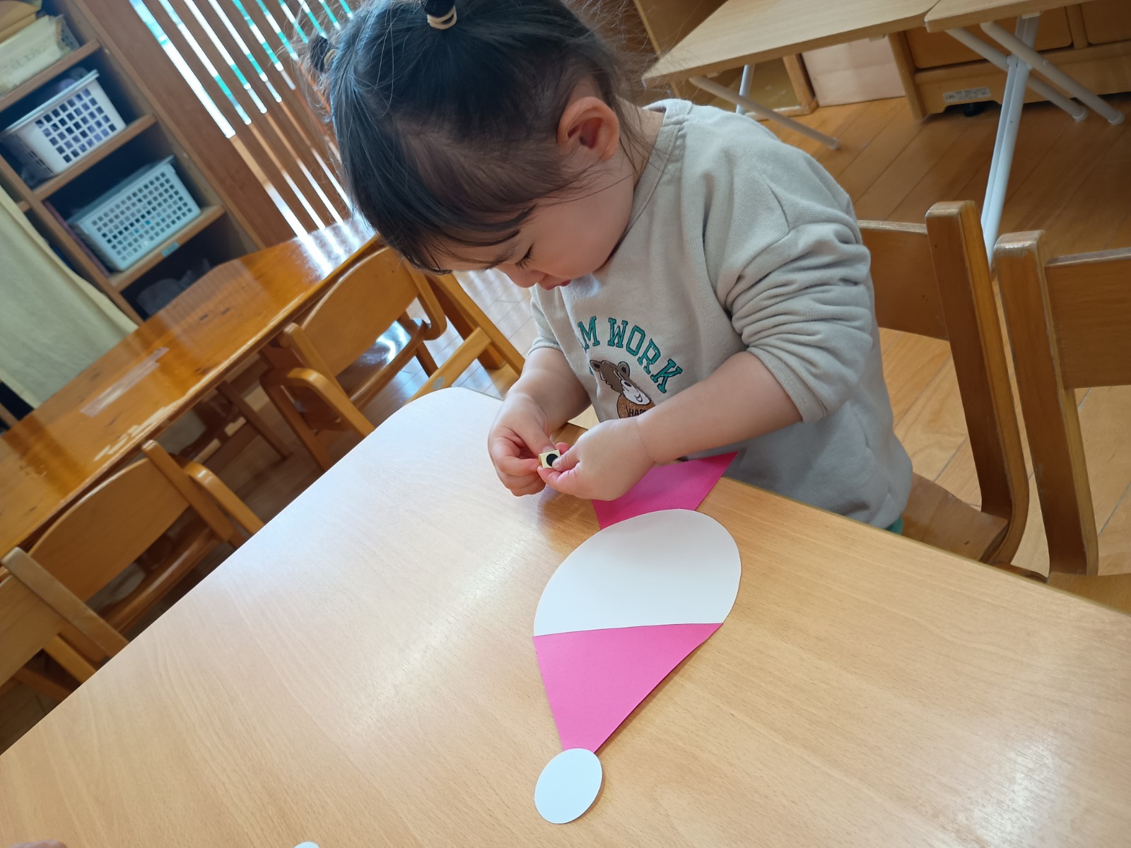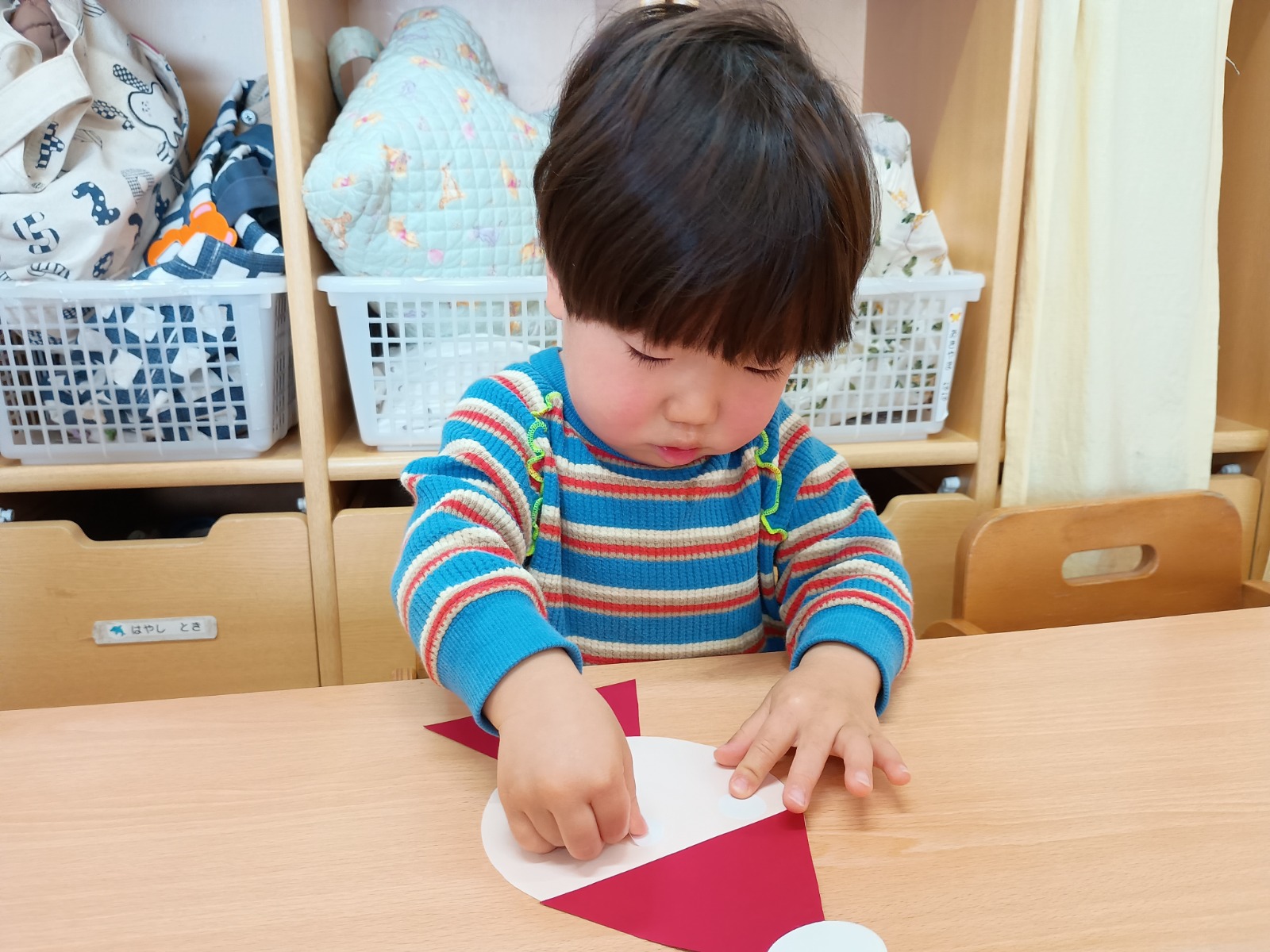 「目はどこかな?」「鼻は?」と伝えると、自分の顔を触って位置を確認してから貼っていく子どもたちもいました✨
