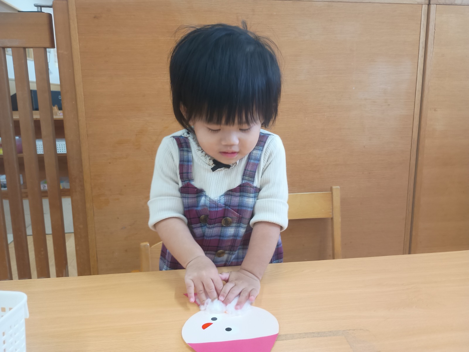 「これはサンタさんのおひげになるんだよ。」と綿を渡すと、感触を楽しみながらペタペタくっつけて思い思いのサンタが完成しました♪