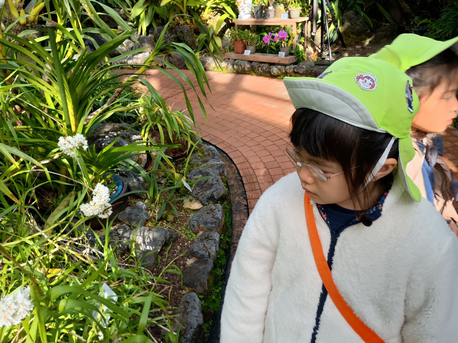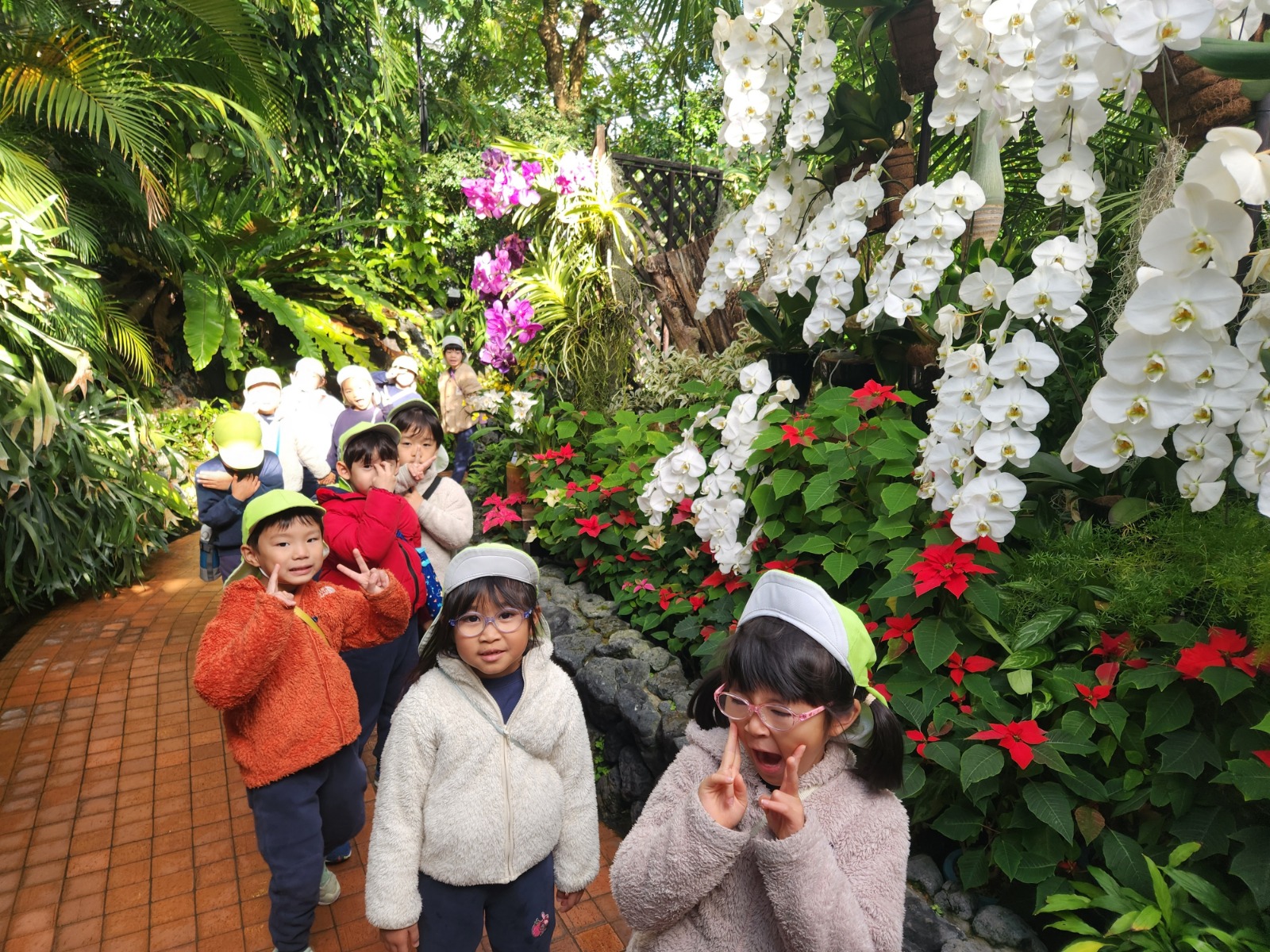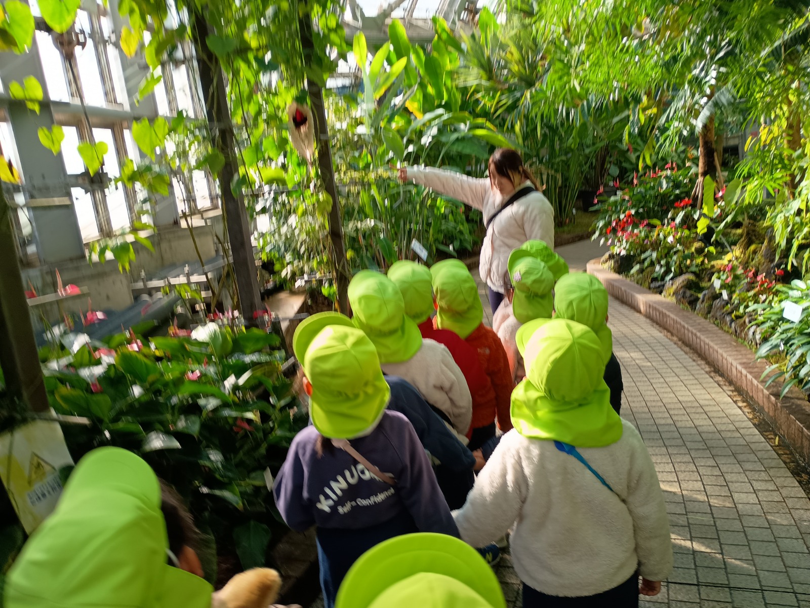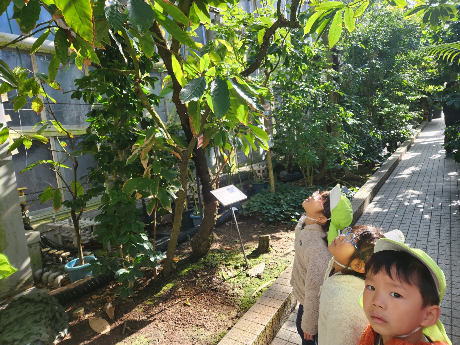 そしてみんなで、色々な花を見ようとはりきって温室を出発!「この花きれい!」「いい匂いする!」「この花の匂いはすごいな」「この葉っぱ大きいからみんなで寝れそう!」「この木は外国に生えてるんやって!」「えー!すごいなー!」「高いなー!」「実がなってるー!」などなど子どもたちの会話がとてもかわいかったです♪