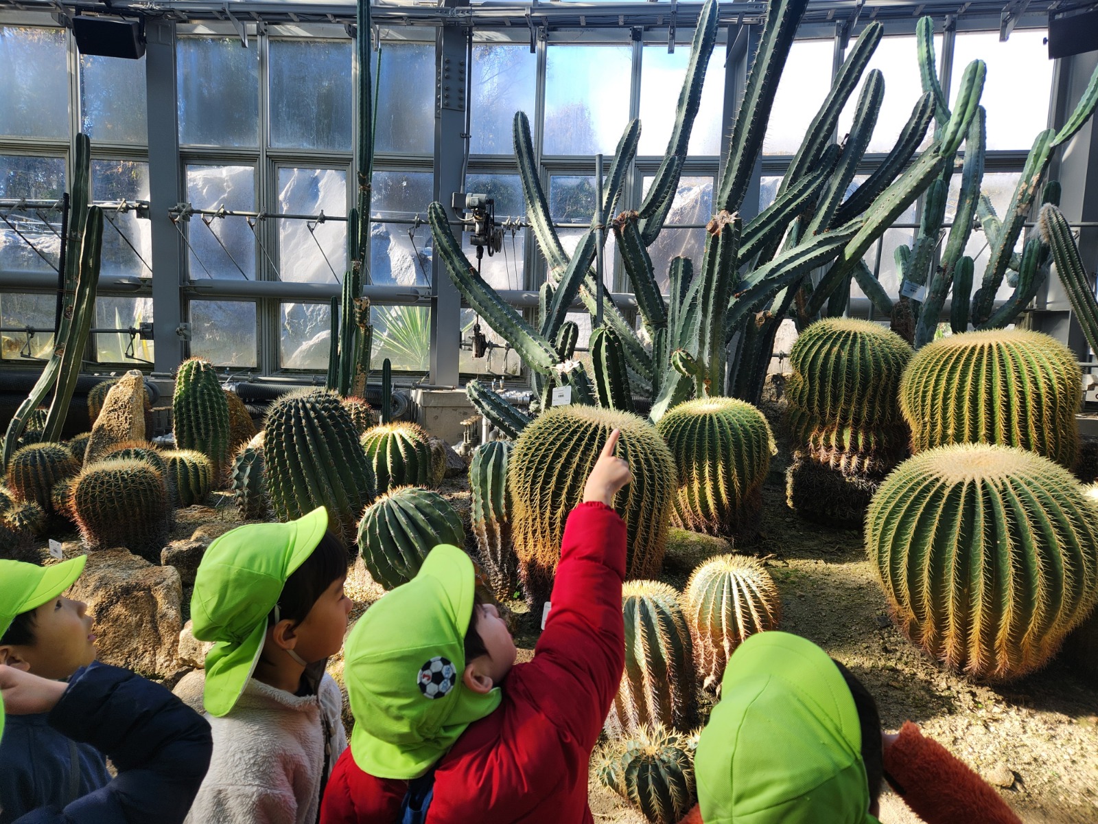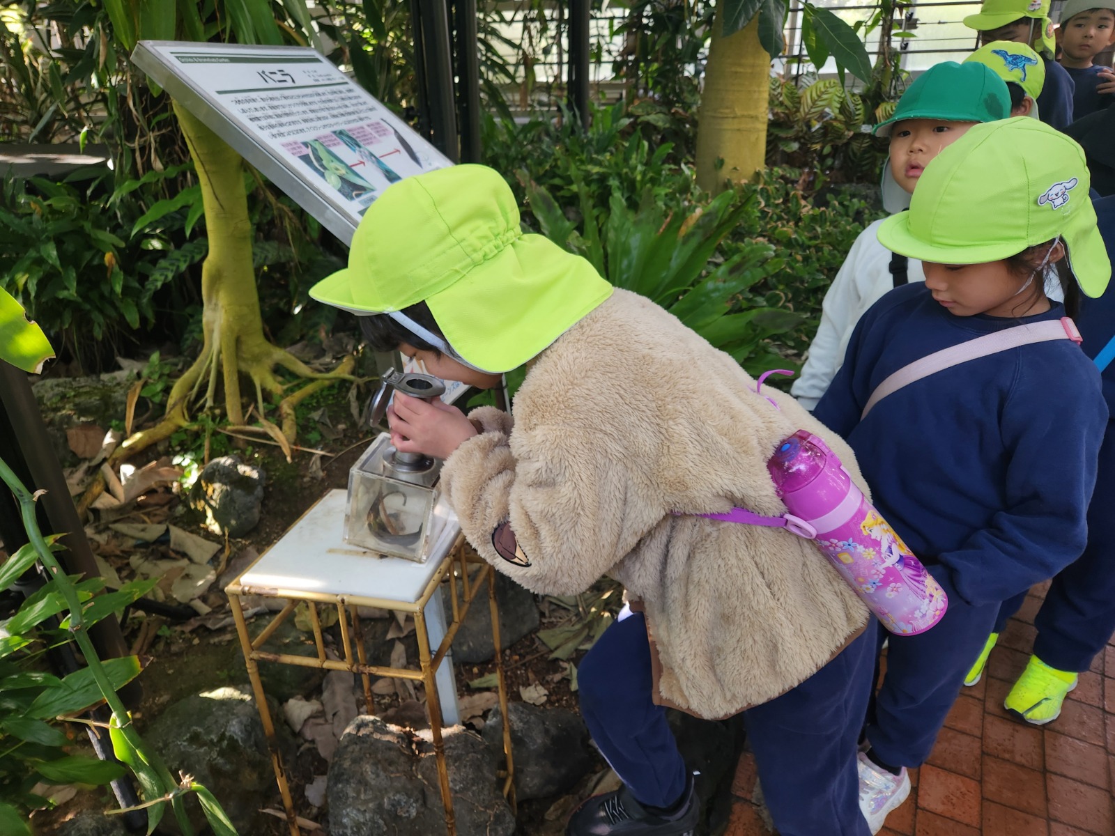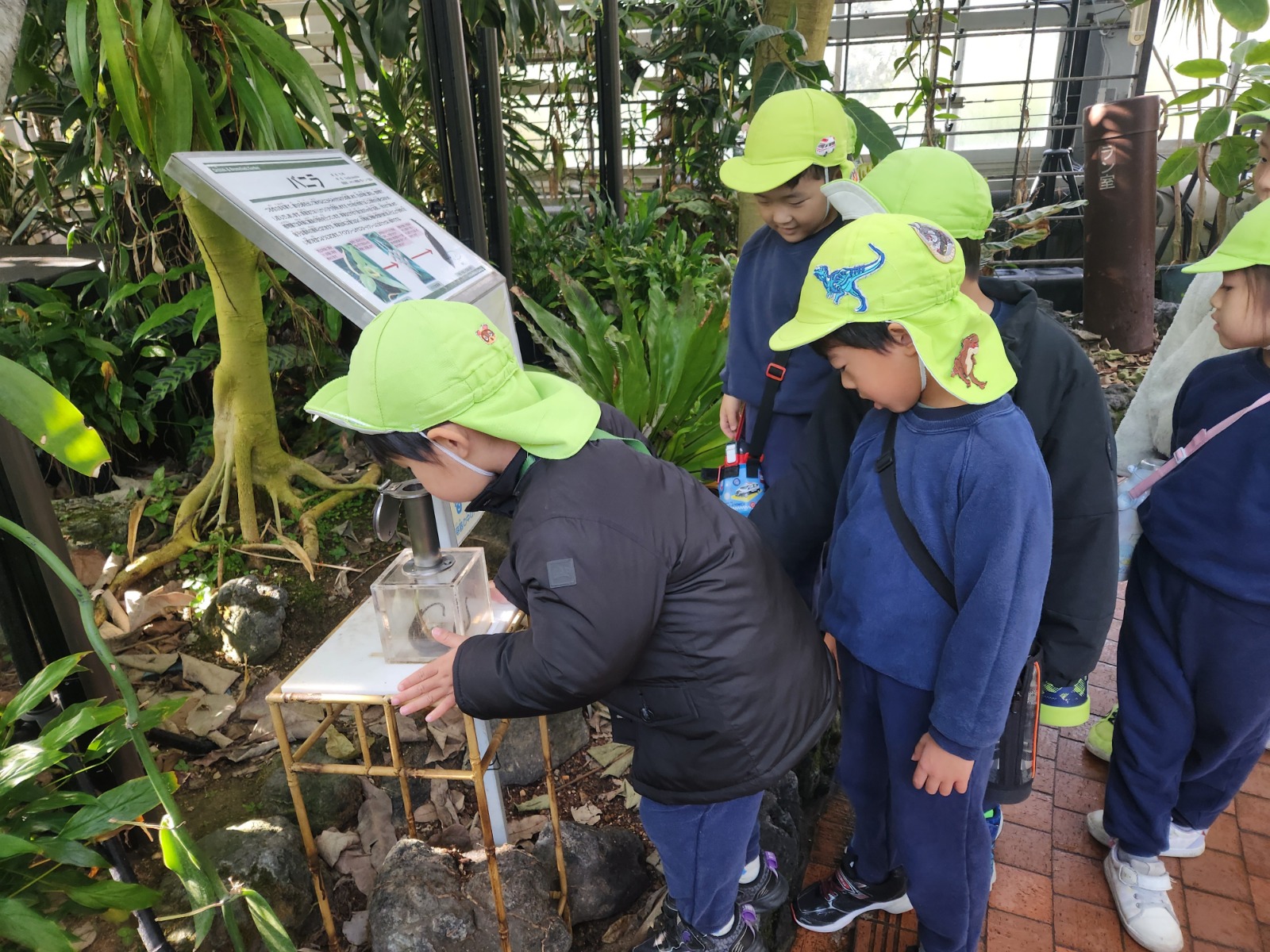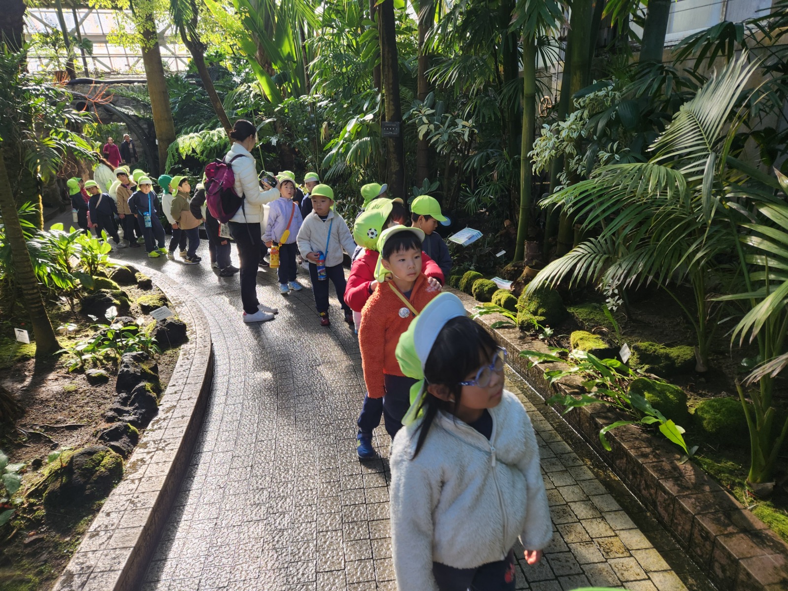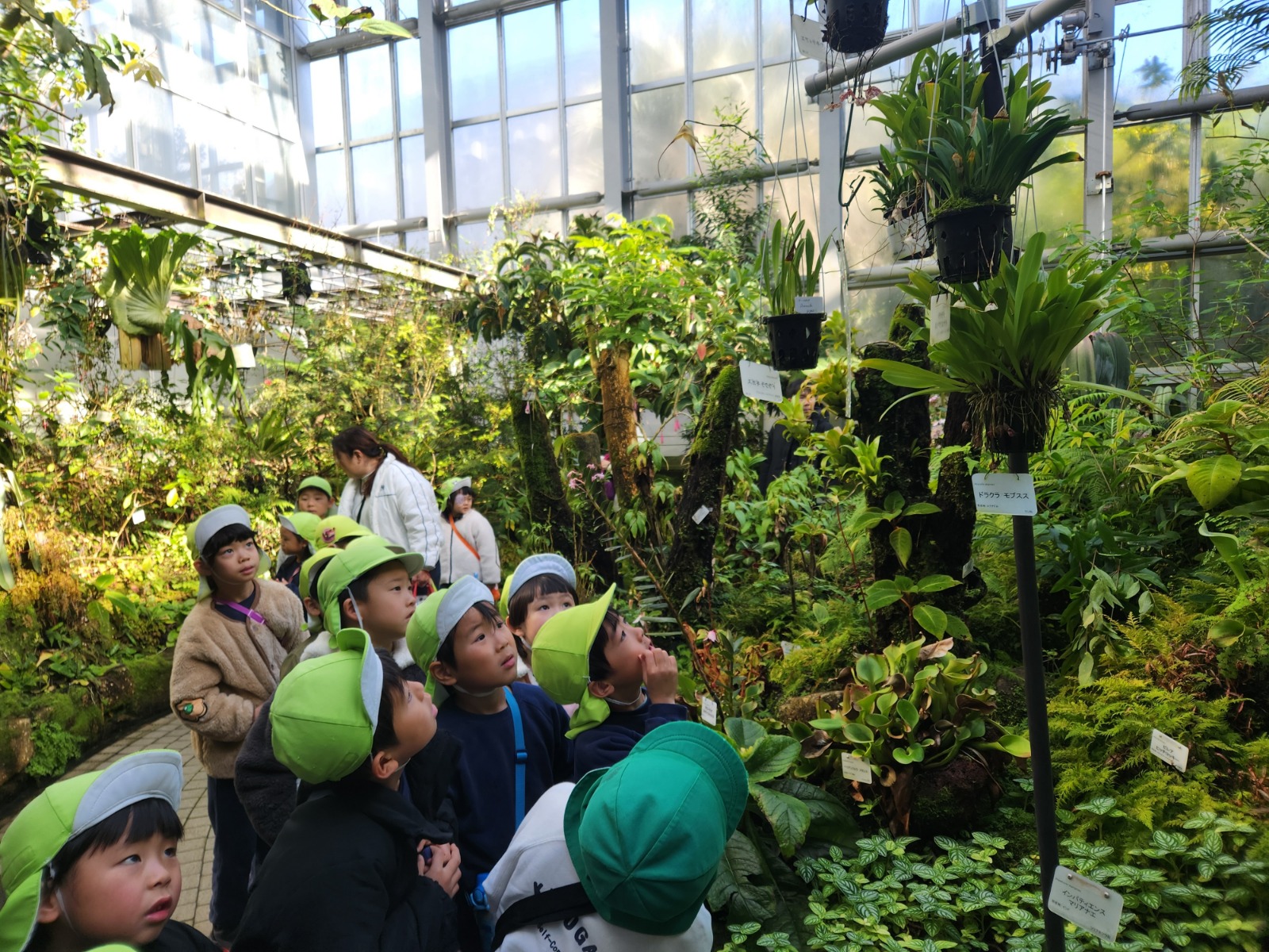そしてみんなで、色々な花を見ようとはりきって温室を出発!「この花きれい!」「いい匂いする!」「この花の匂いはすごいな」「この葉っぱ大きいからみんなで寝れそう!」「この木は外国に生えてるんやって!」「えー!すごいなー!」「高いなー!」「実がなってるー!」などなど子どもたちの会話がとてもかわいかったです♪