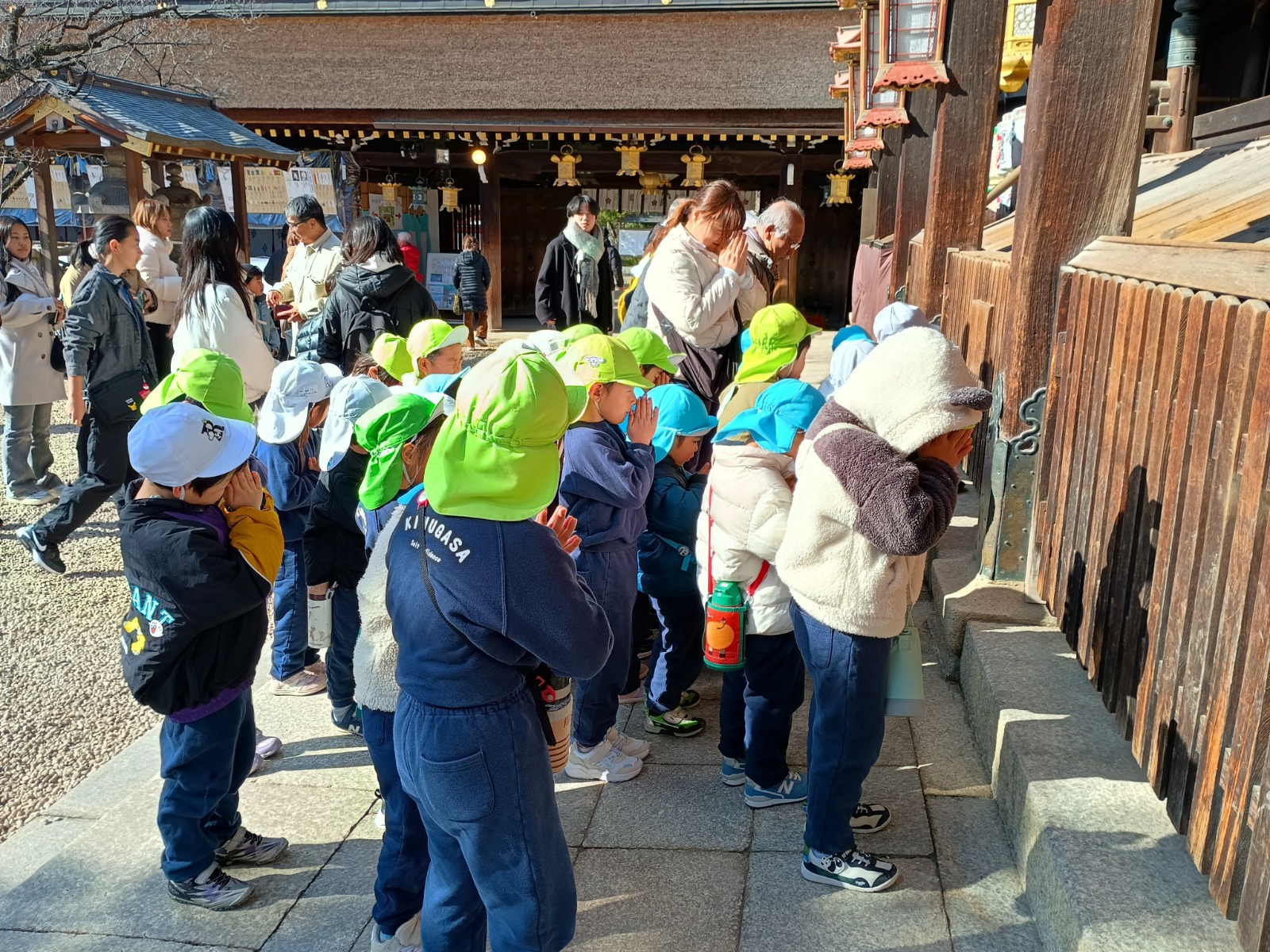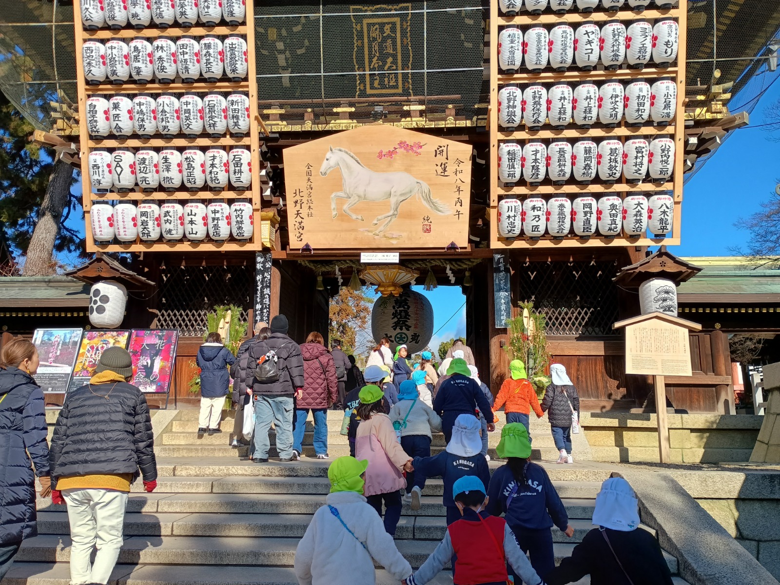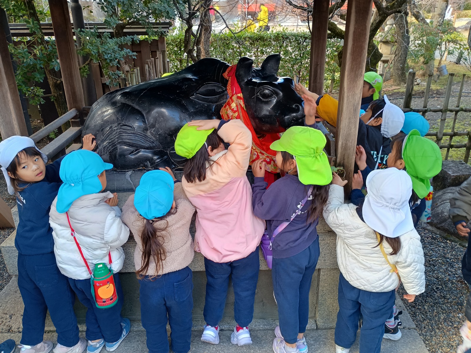 先日、ふじ組さん、きく組さんと一緒に北野天満宮へ園外保育に行ってきました。お兄さん、お姉さんに新年の挨拶の仕方を教えてもらったり神社での参拝の仕方を教えてもらったりしました!北野天満宮では、一緒に手を繋いで仲良く歩きましたよ。「かっこいいきく組さんになれますように!」や「元気に過ごせますように!」など色々な思いで参拝してきました。牛さんも撫でてきましたよ!